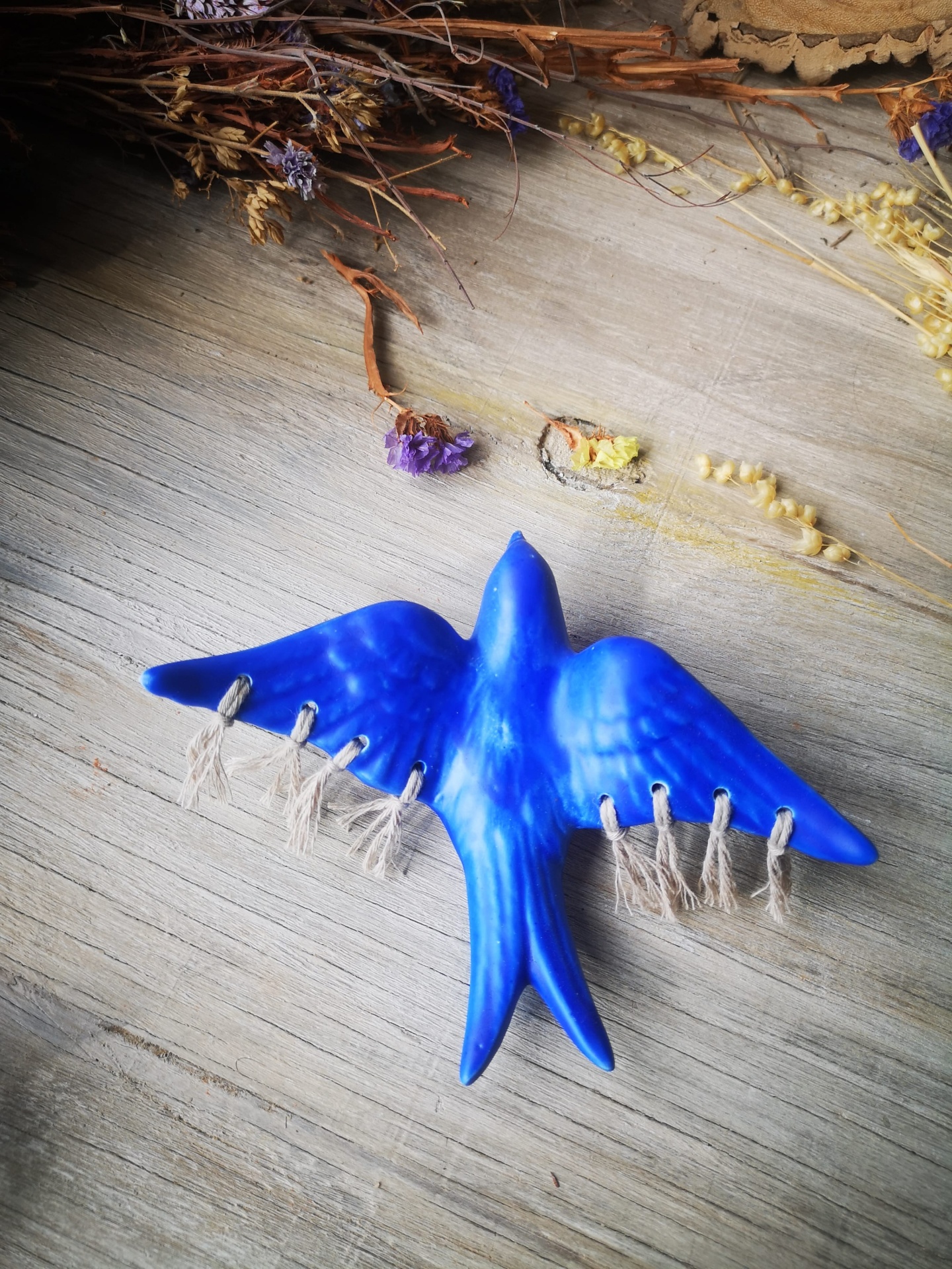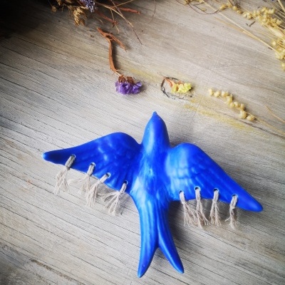 Andorinha azul mate em cerâmica com macramé decorativo