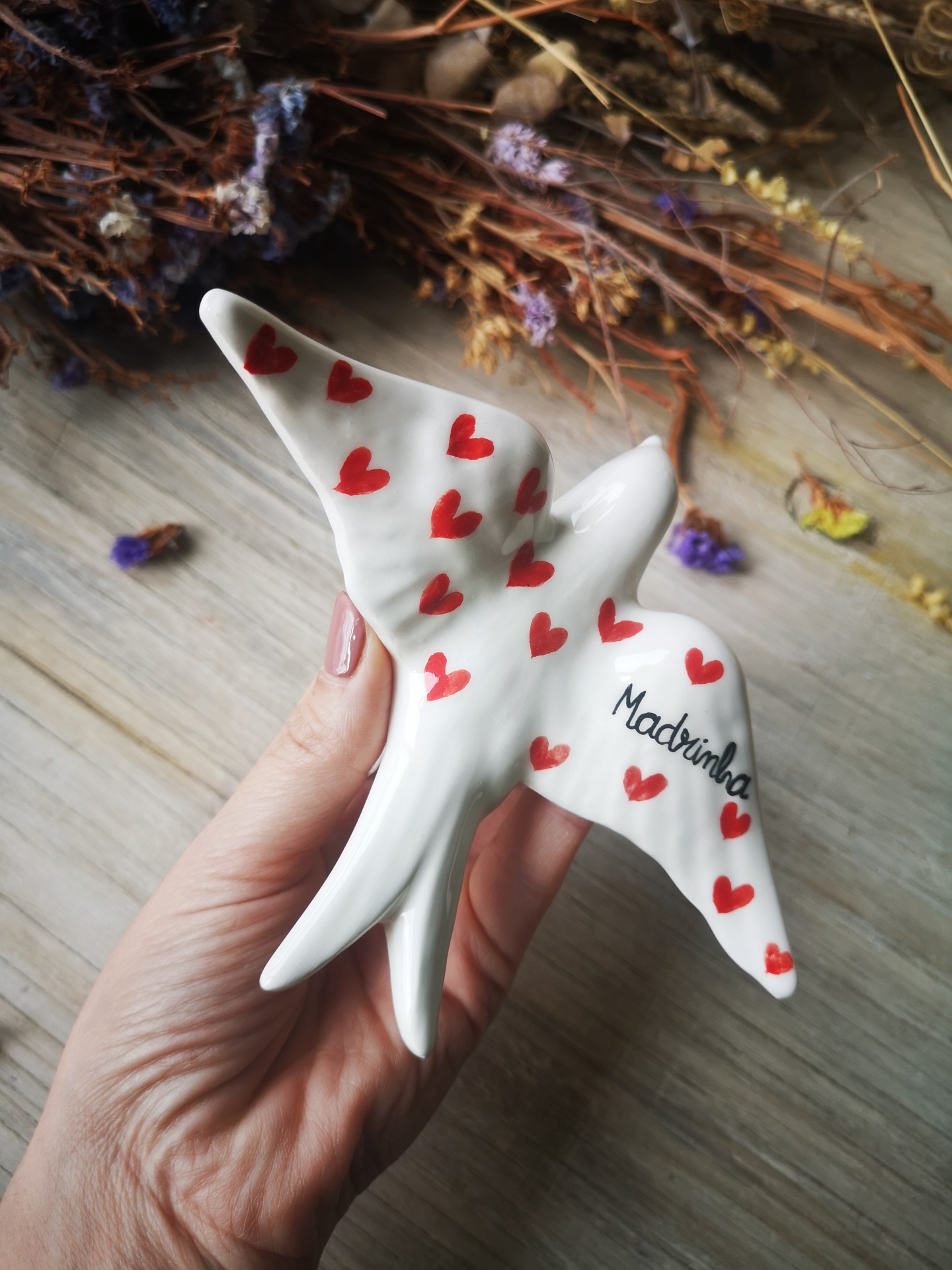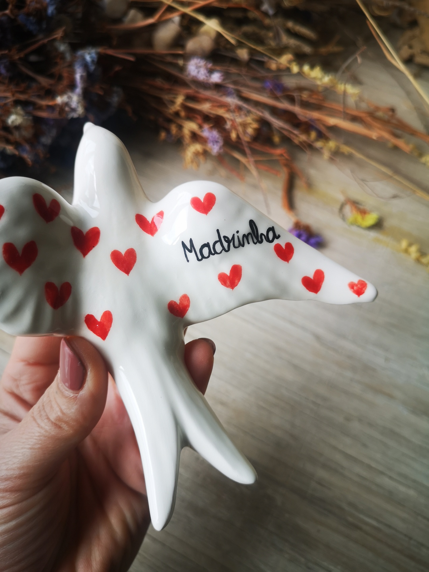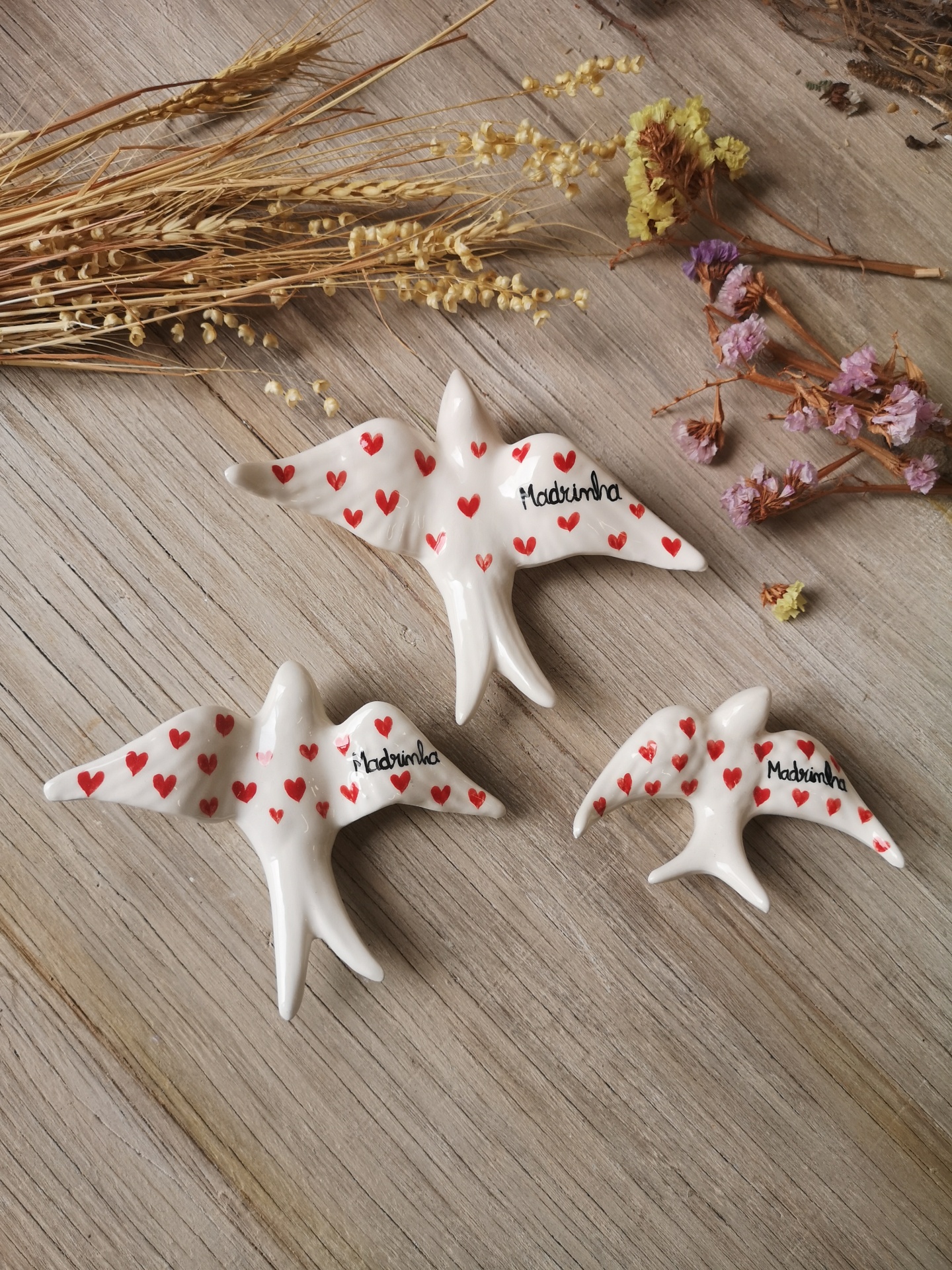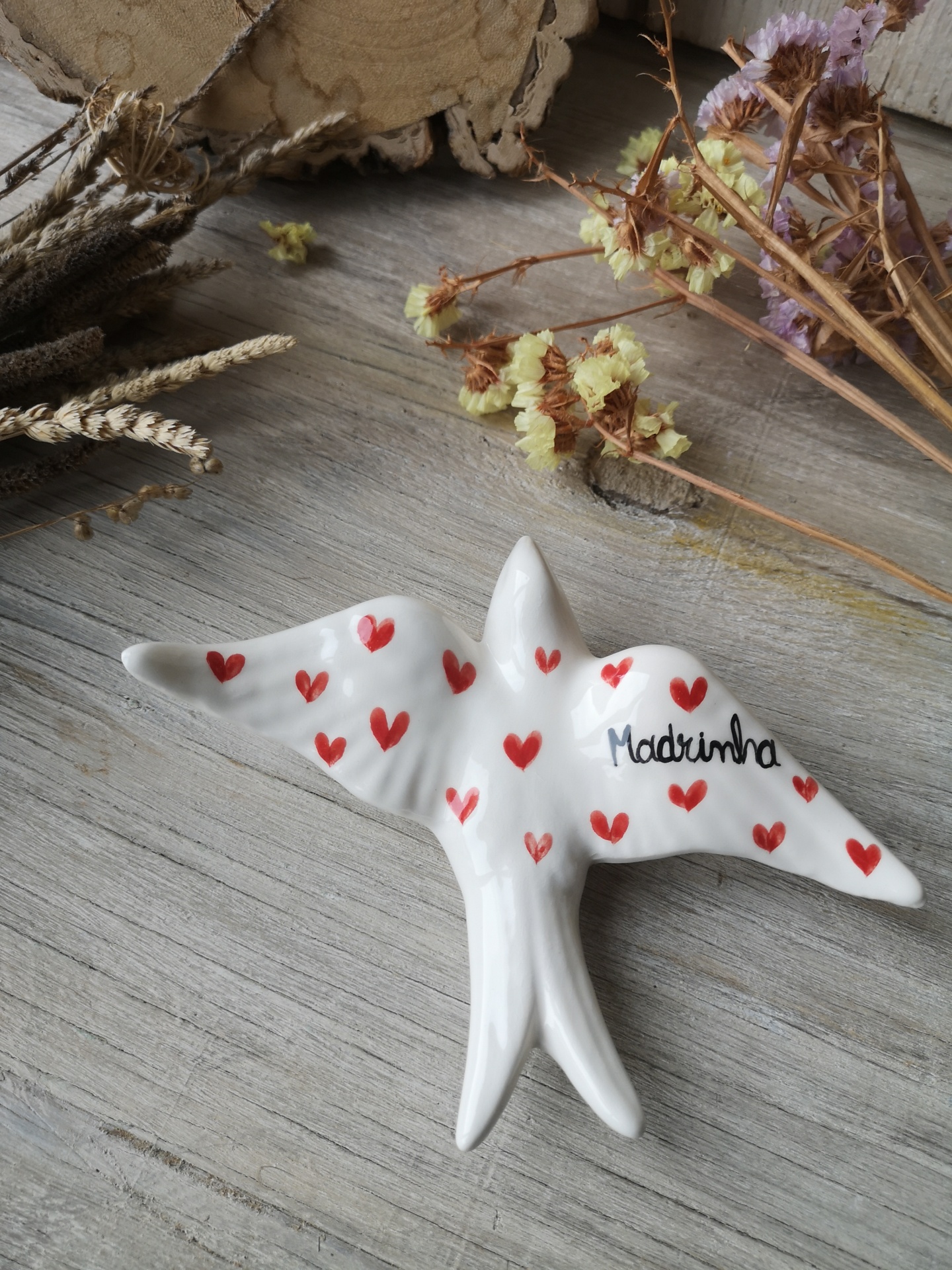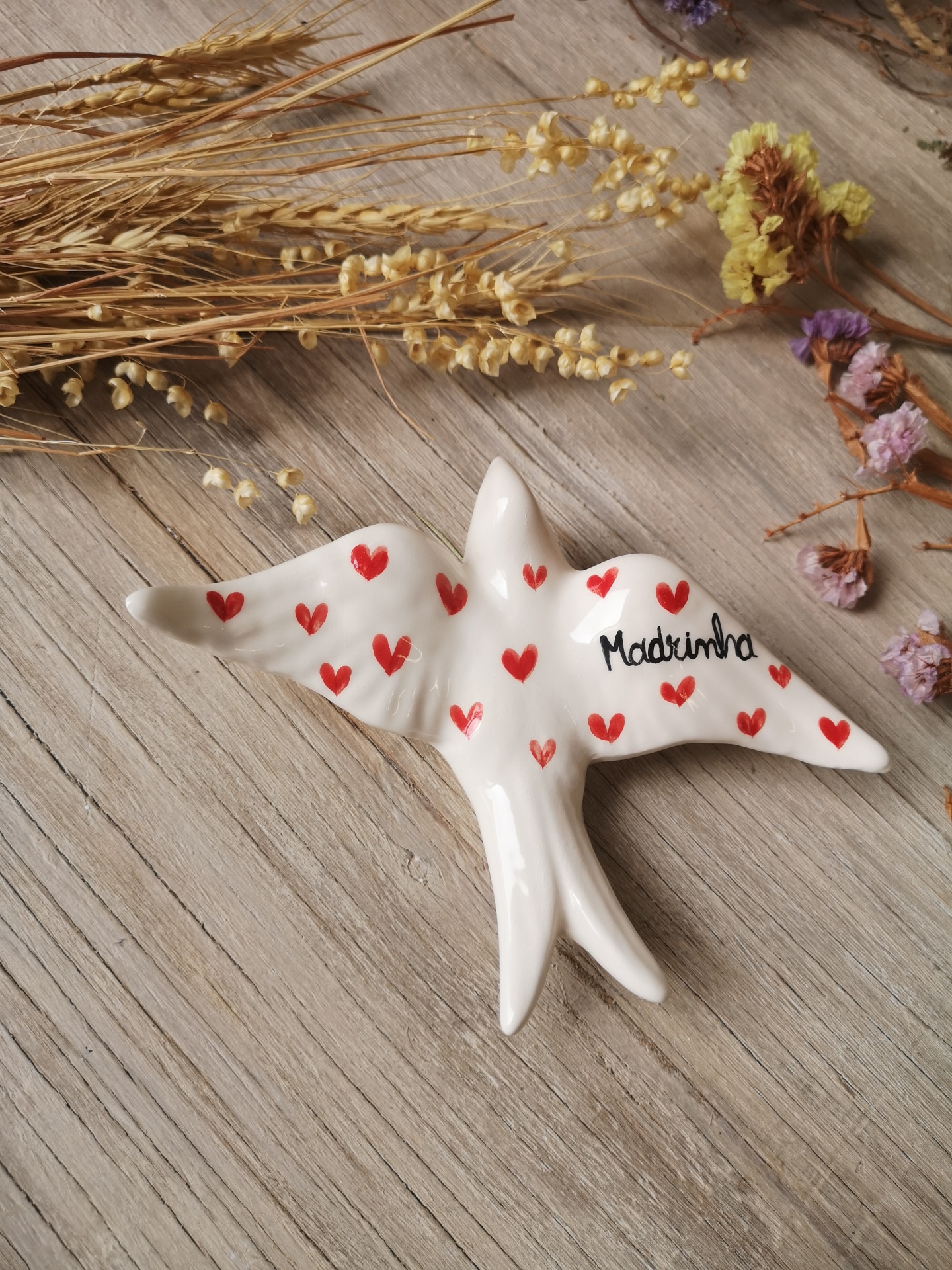 Andorinha de cerâmica, com coração e palavra Madrinha.