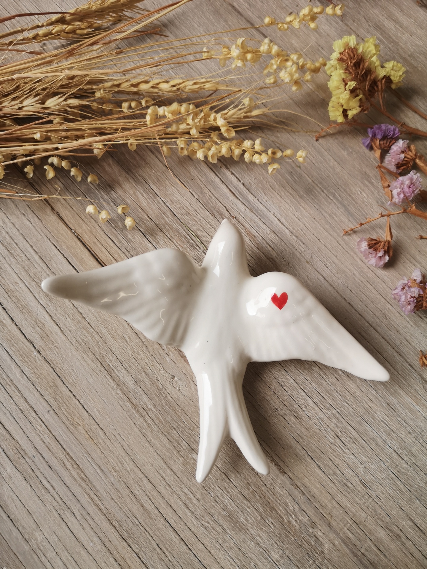 Figura cerâmica branca de pássaro com coração vermelho sobre madeira e flores secas
