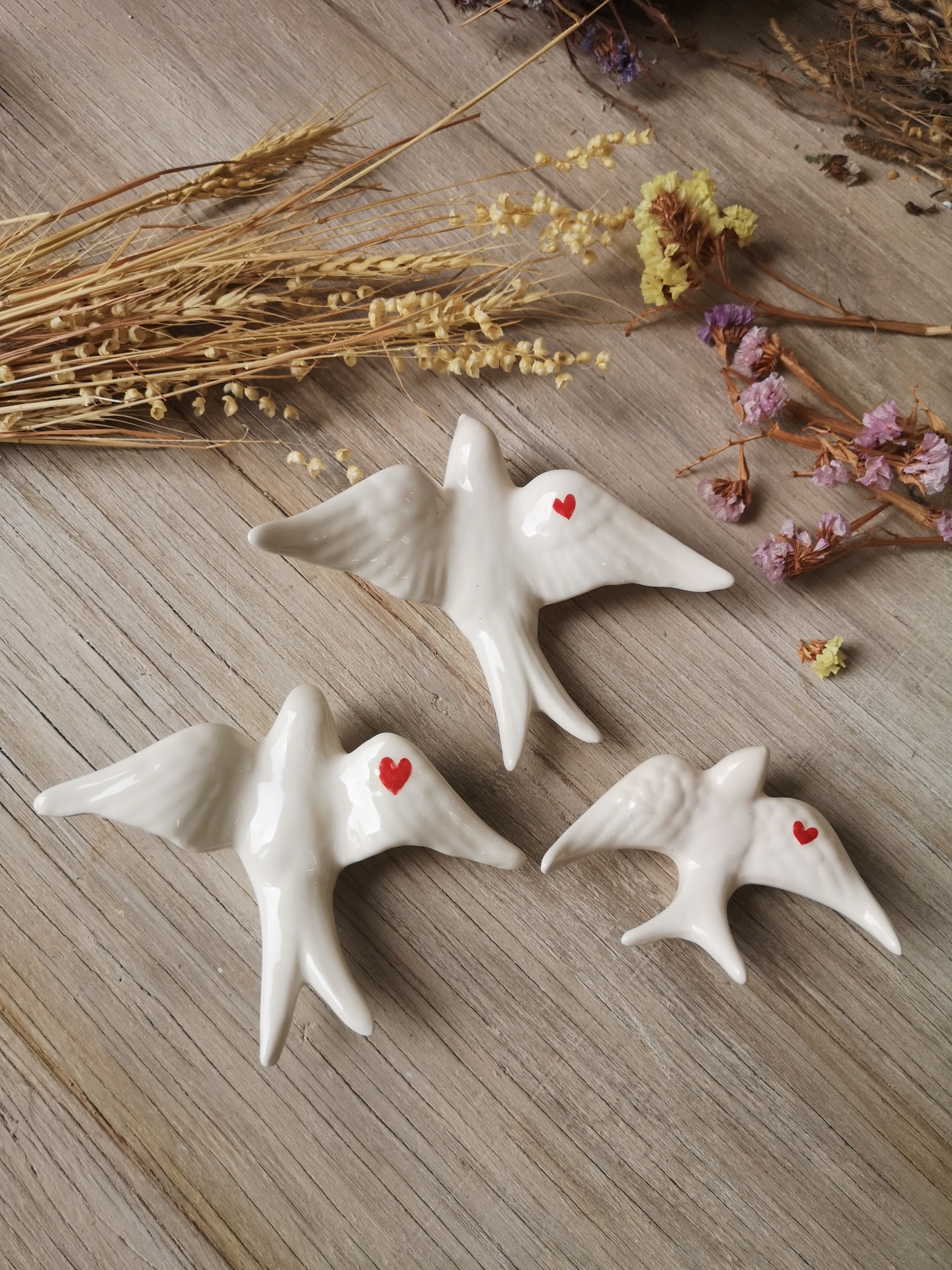Três figuras cerâmicas em forma de pássaros brancos com corações vermelhos sobre madeira e flores secas