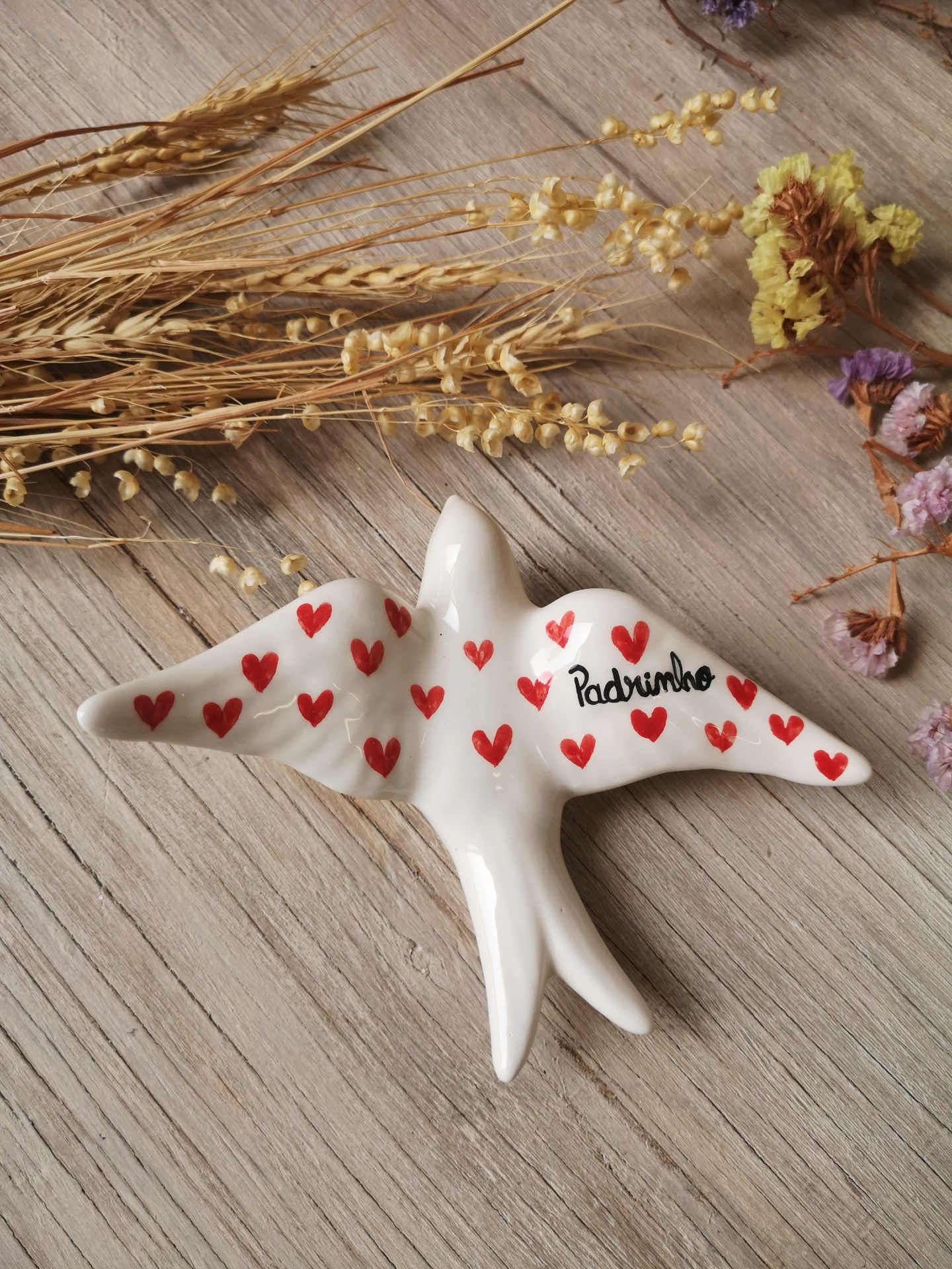 Pássaro decorativo branco com corações vermelhos e texto 'Padrinho'