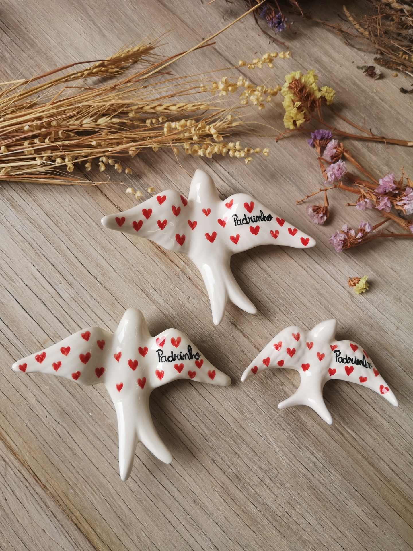 Figuras de pássaros brancos decorados com corações vermelhos e a palavra 'Padrinho' sobre madeira clara