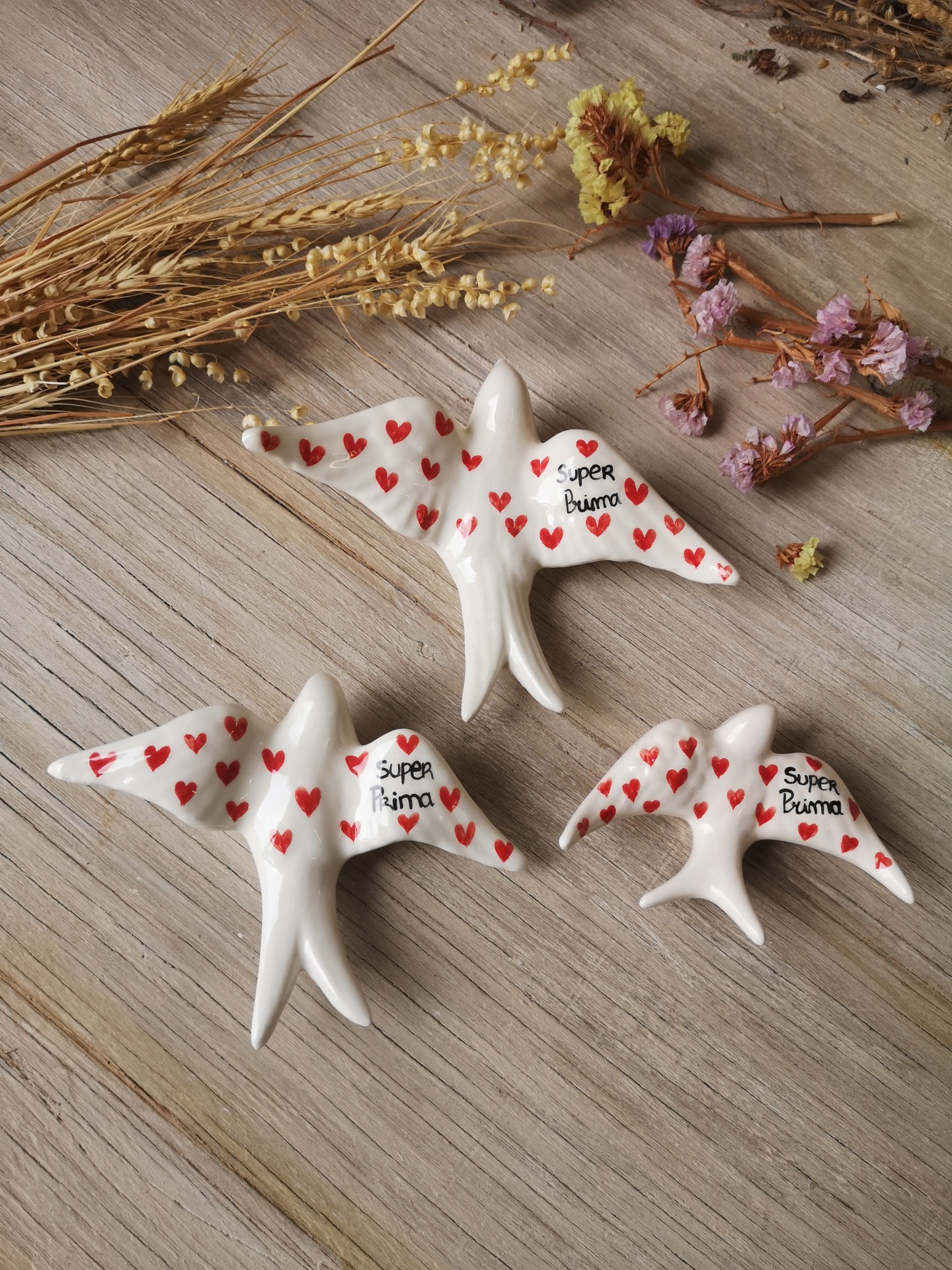 Figuras de cerâmica branca em forma de pássaros decorados com corações vermelhos e texto 'super bruna' sobre madeira clara