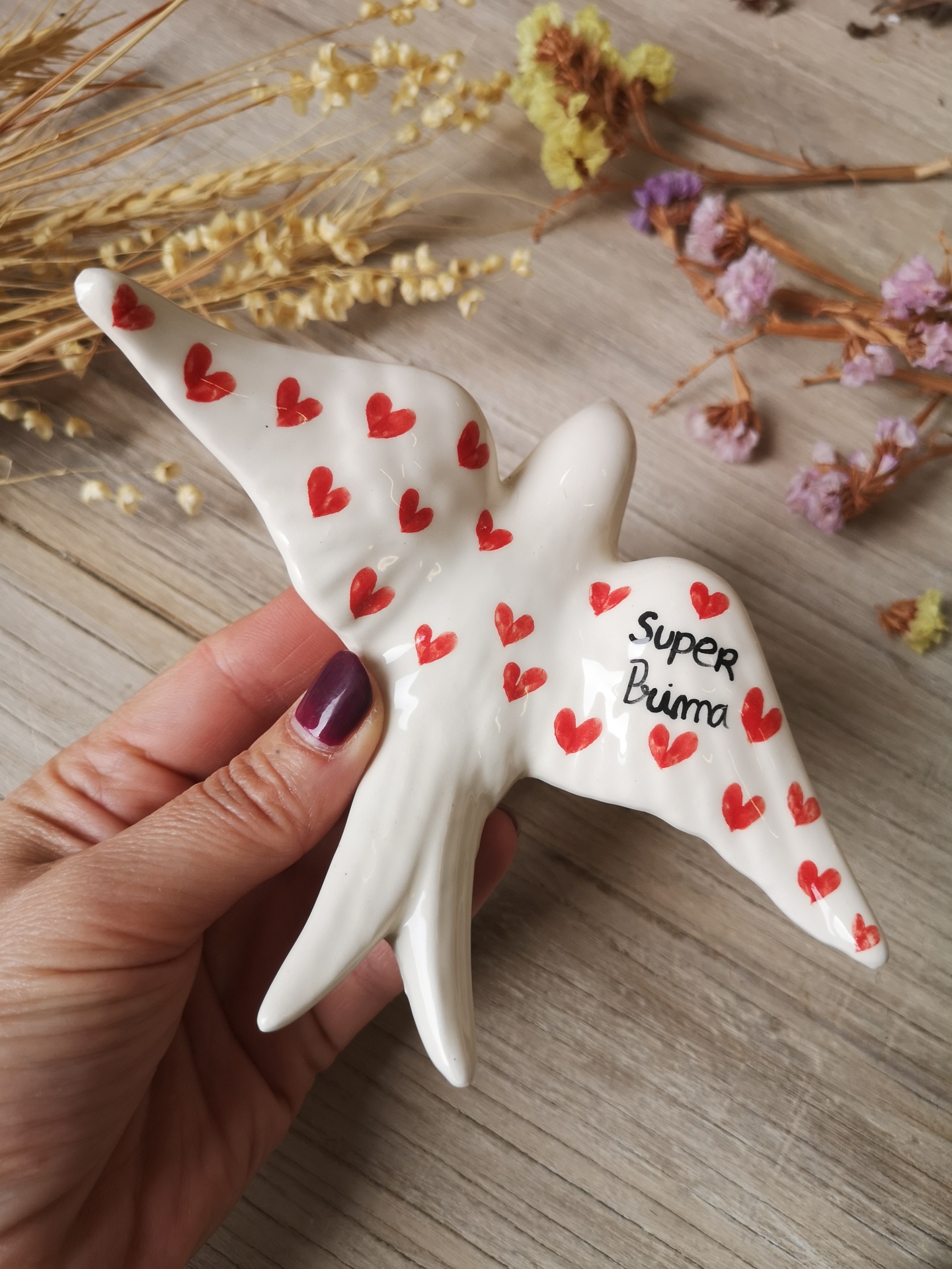 Pássaro cerâmico branco com corações vermelhos e texto 'Super Avóma'