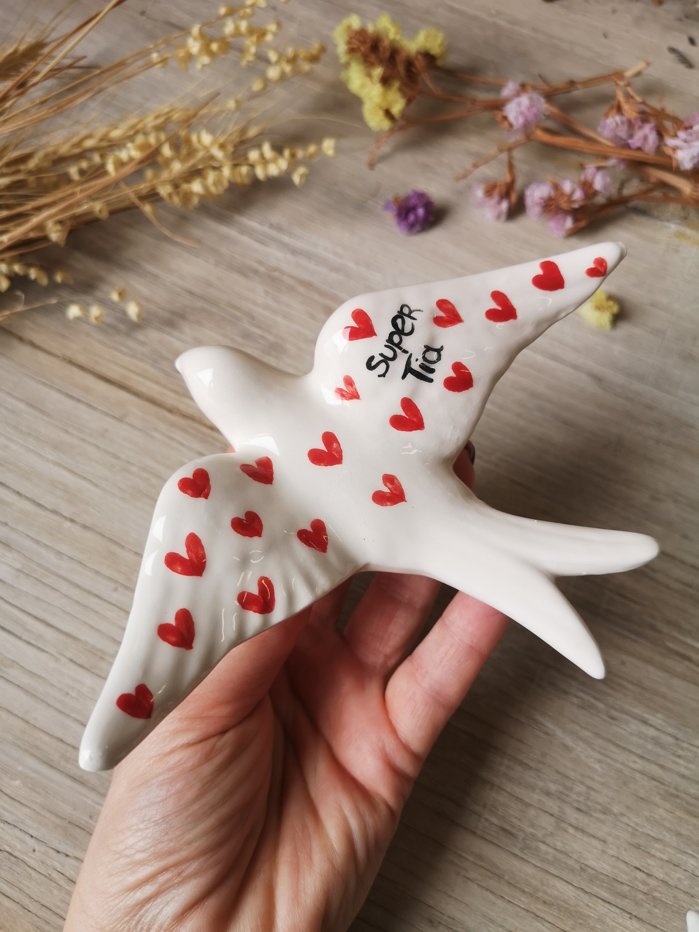 Escultura cerâmica branca de pássaro com corações vermelhos e texto 'Super Tia'