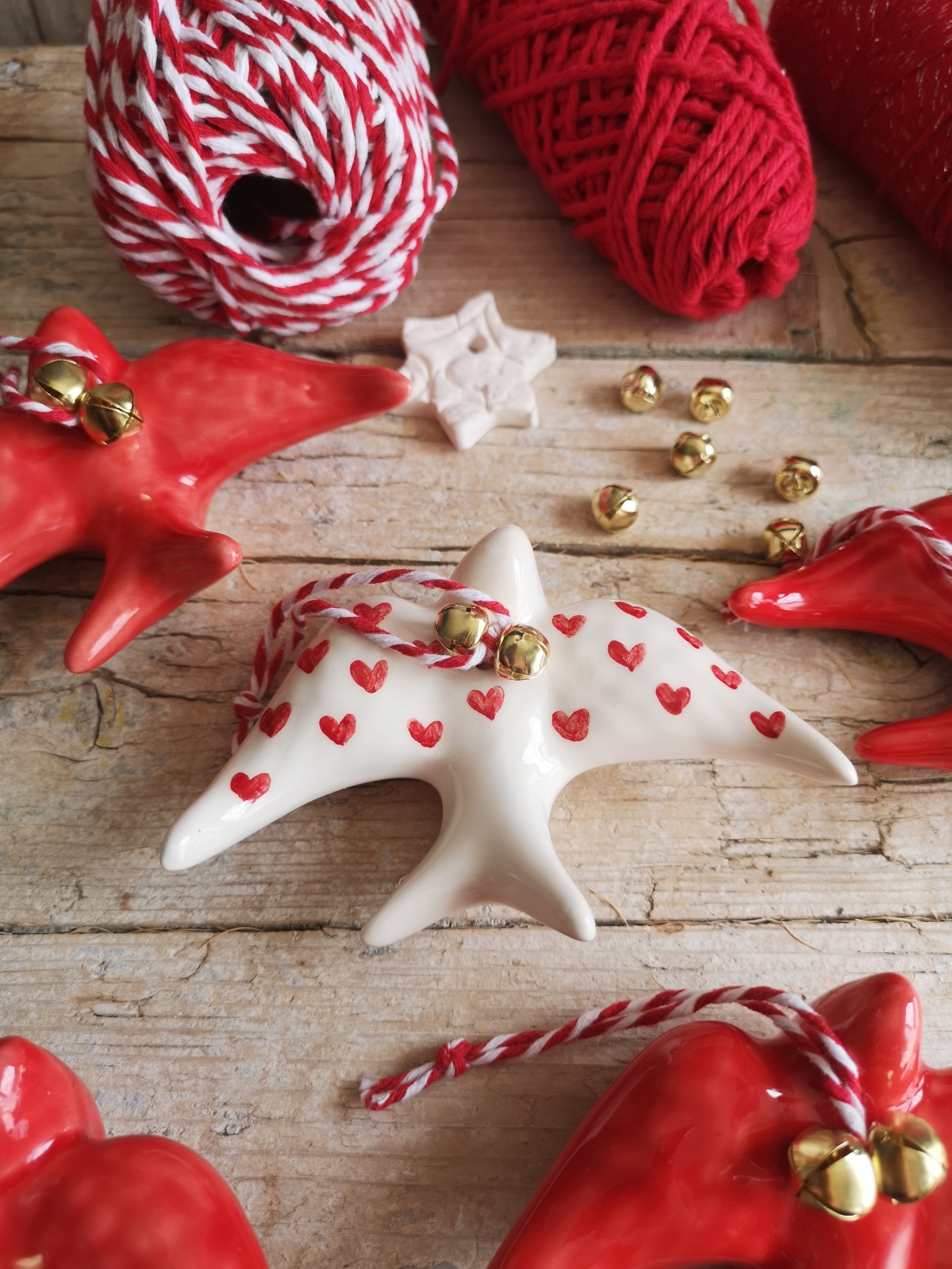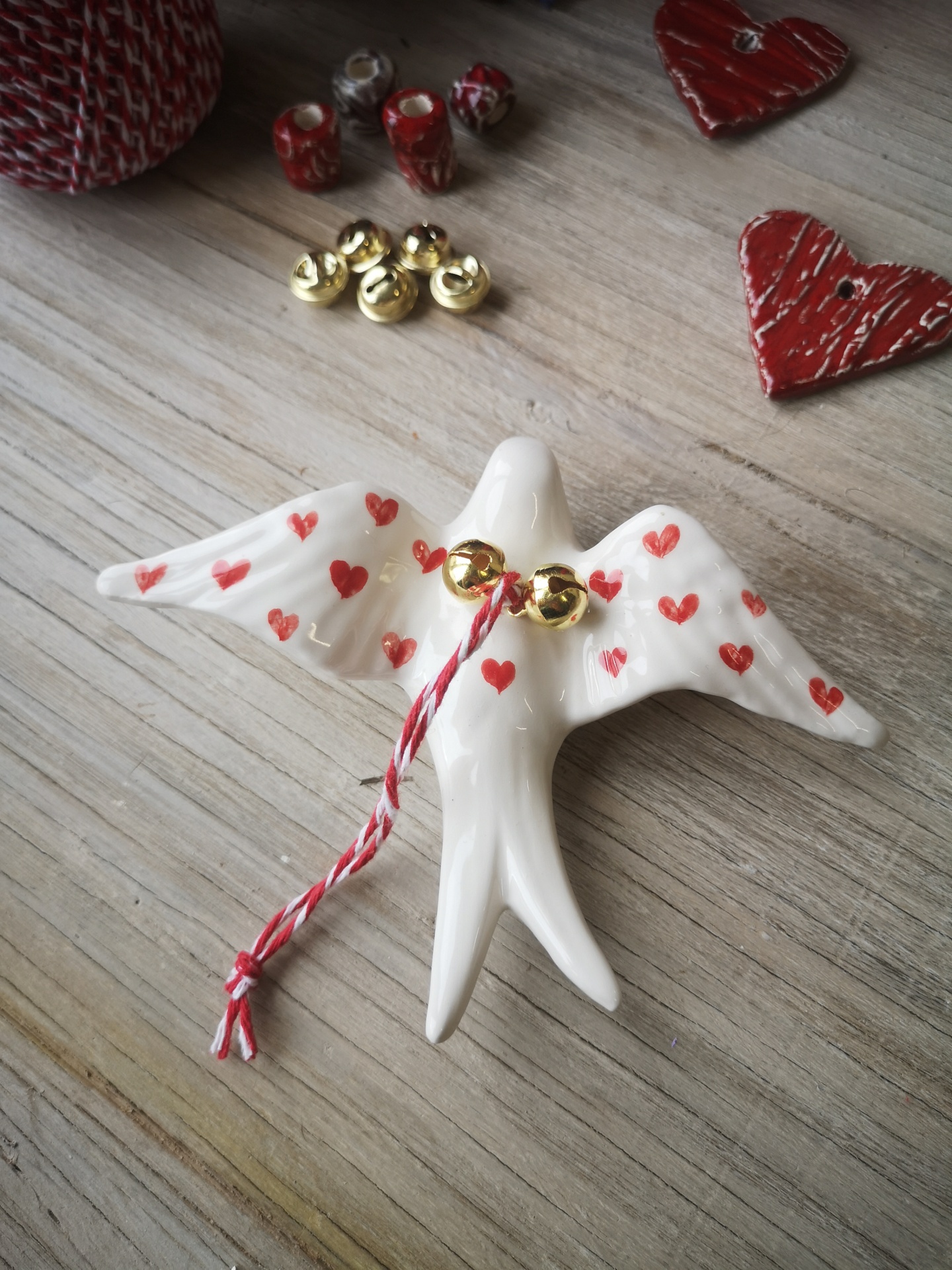 Andorinha de Natal, pintada à mão, com Corações, fio e guizos dourados.