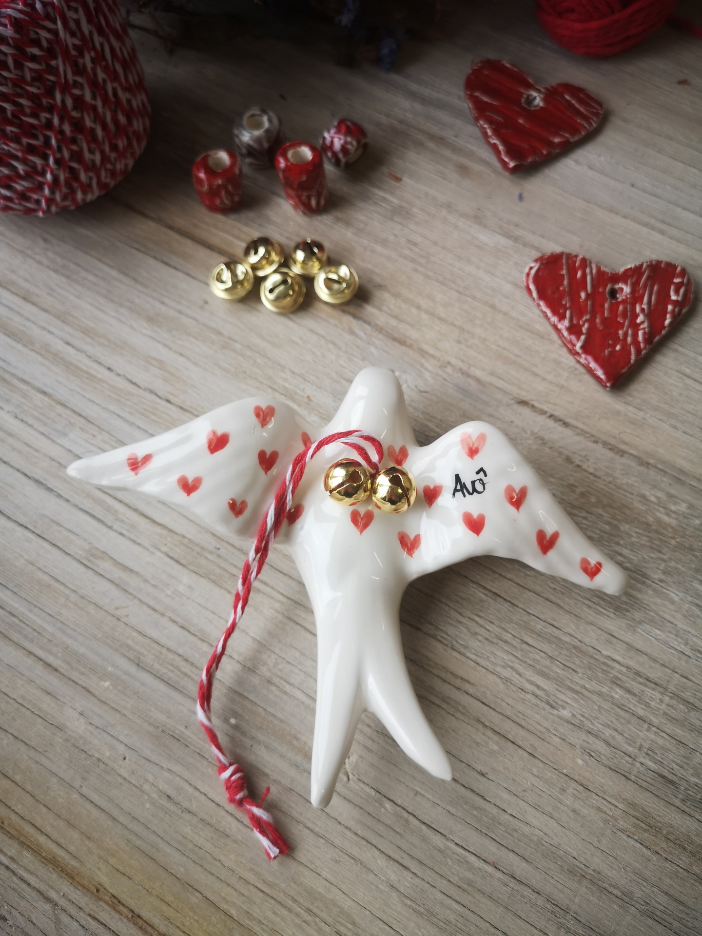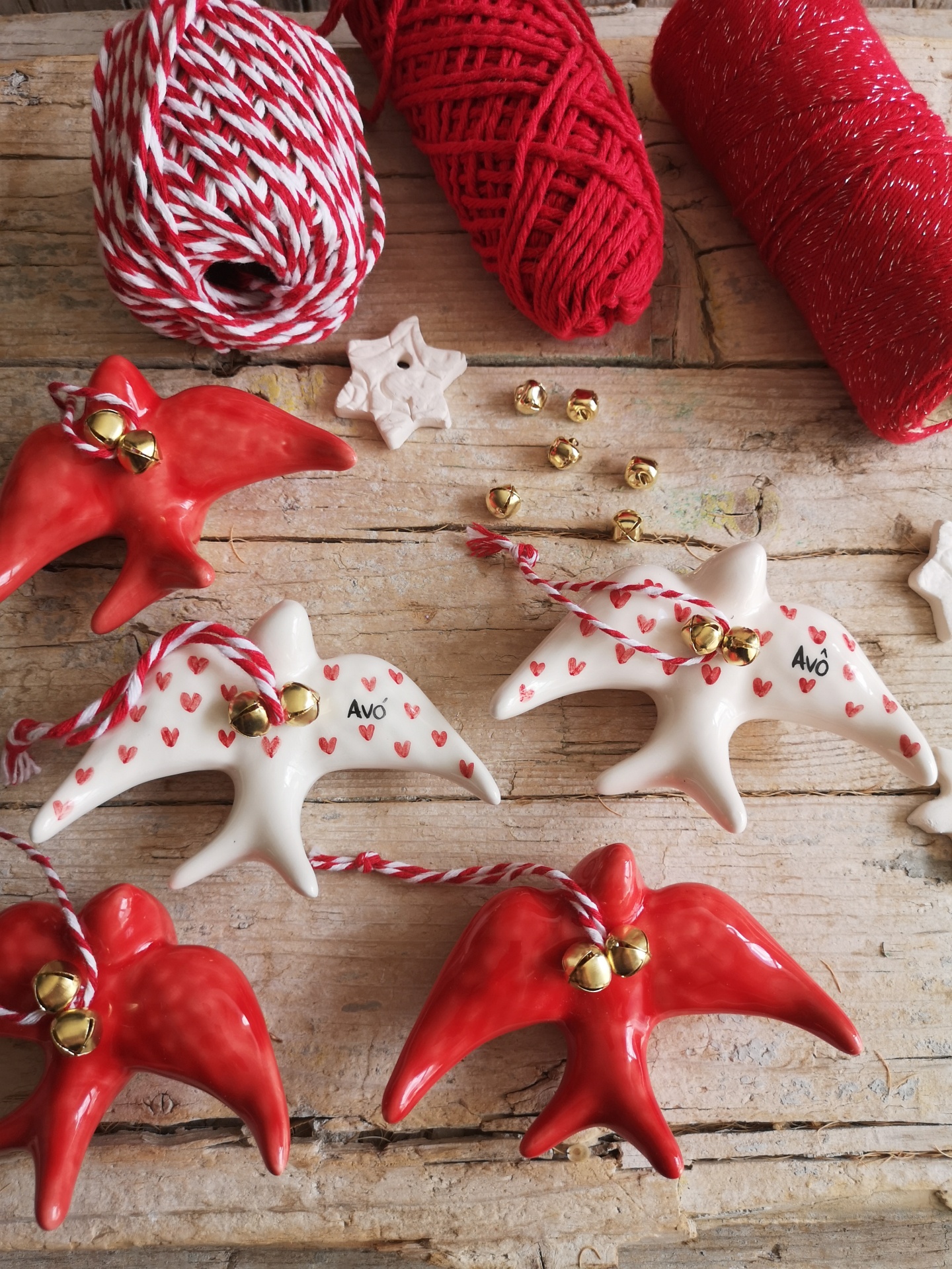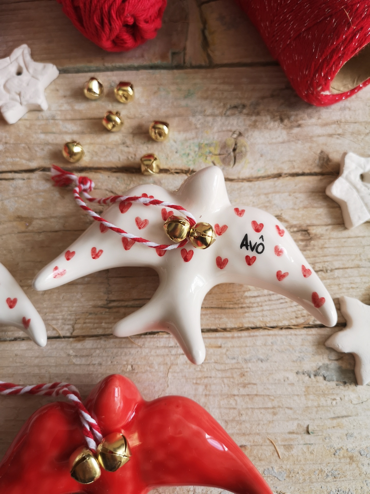 Andorinha de Natal com corações e palavra Avô, fio e guizos dourados.