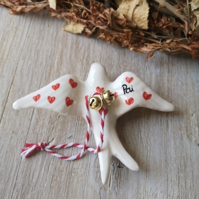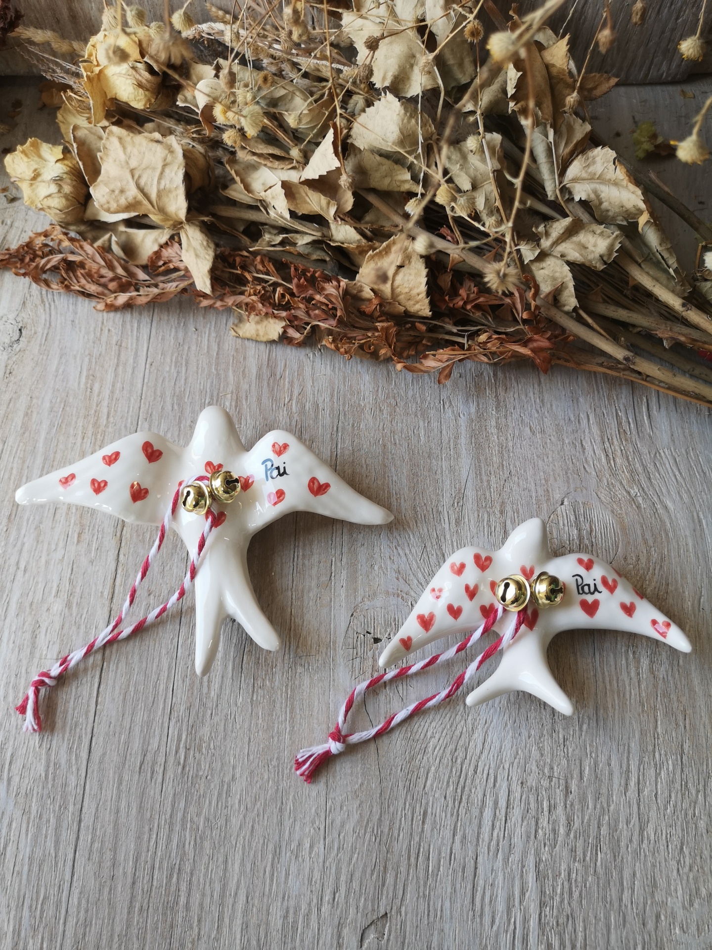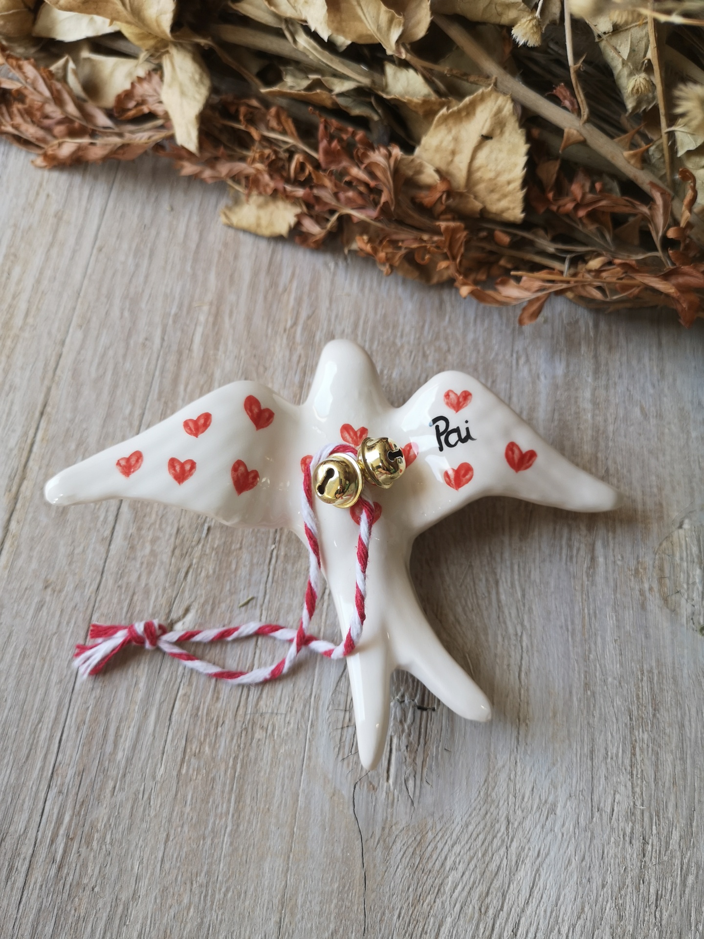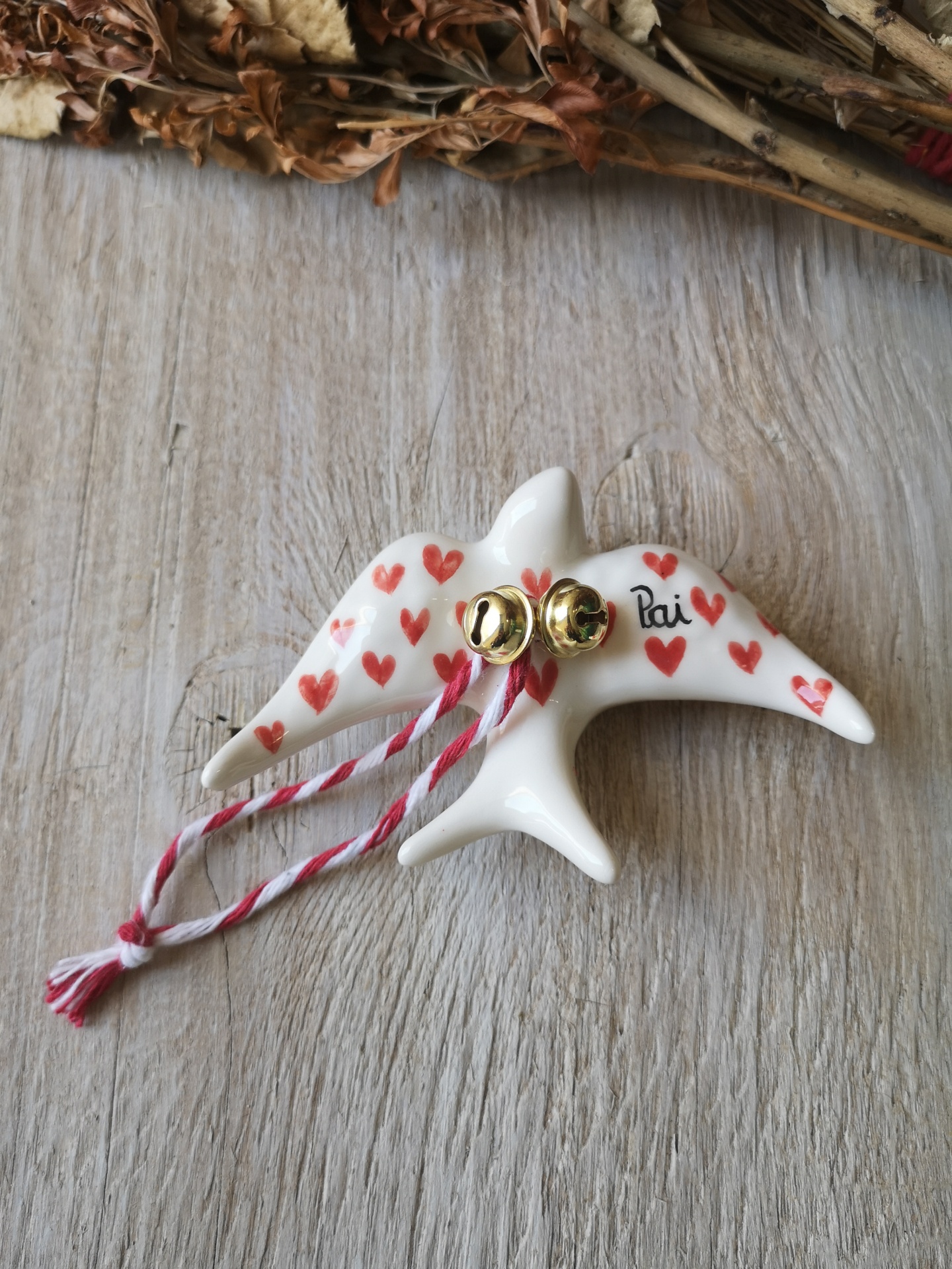 Andorinha de cerâmica, pintada à mão, com palavra 'Pai' , fio para pendurar e guizos.