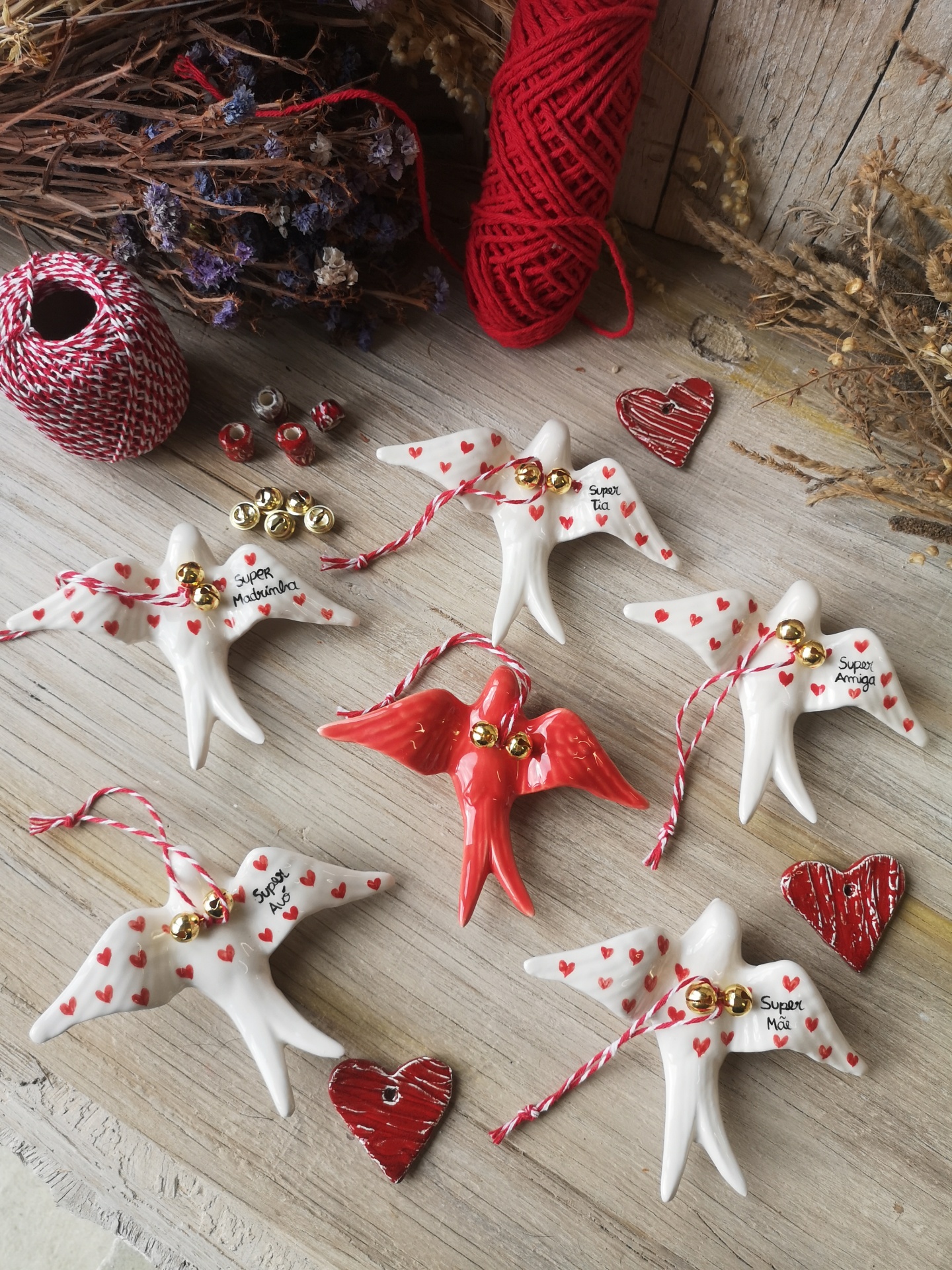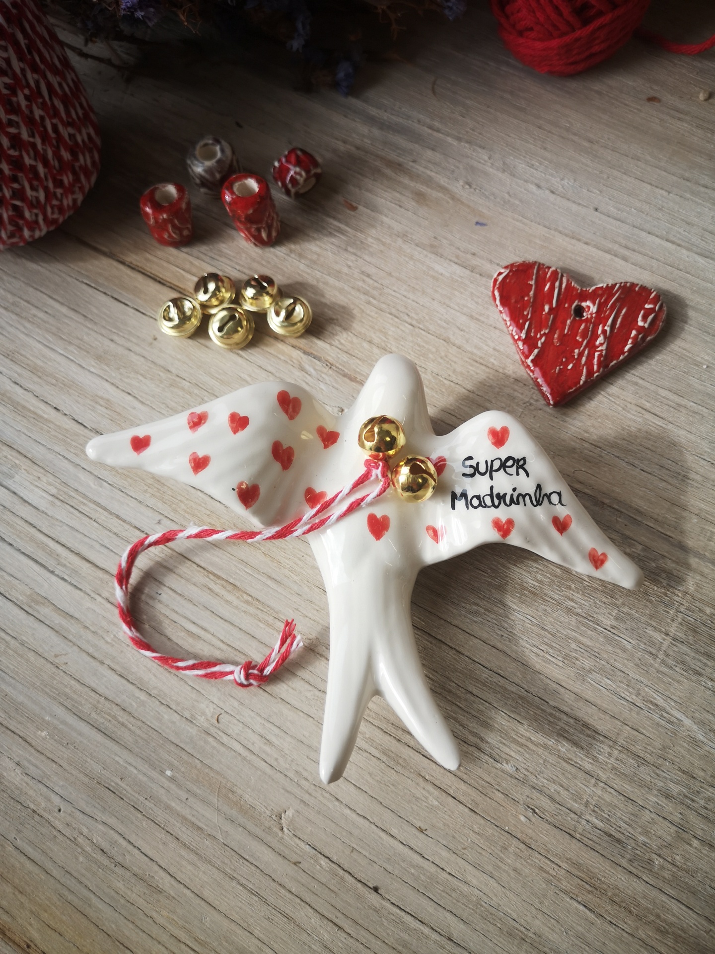 Andorinha de cerâmica, pintada à mão, com frase 'Super Madrinha ' , fio para pendurar e guizos.