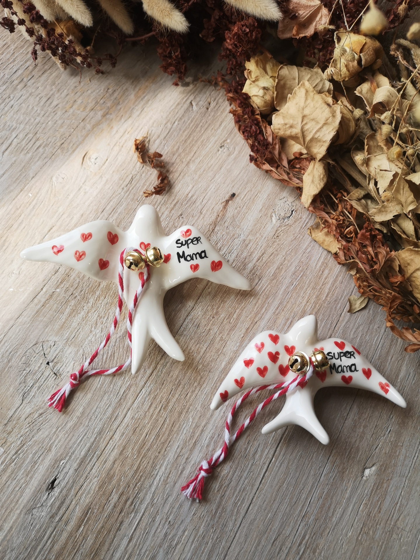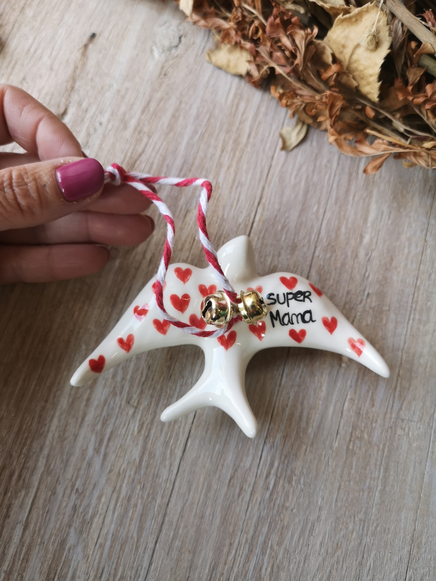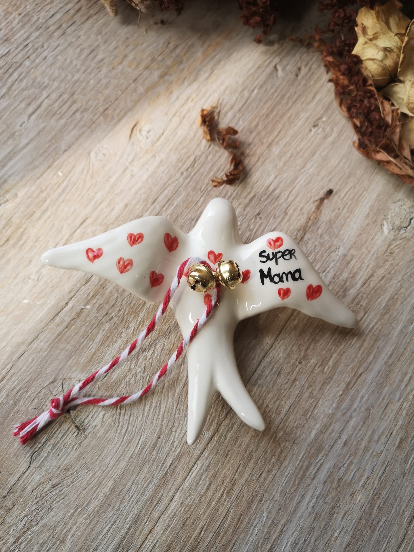 Andorinha de cerâmica, pintada à mão, com frase 'Super Mana' , fio para pendurar e guizos.