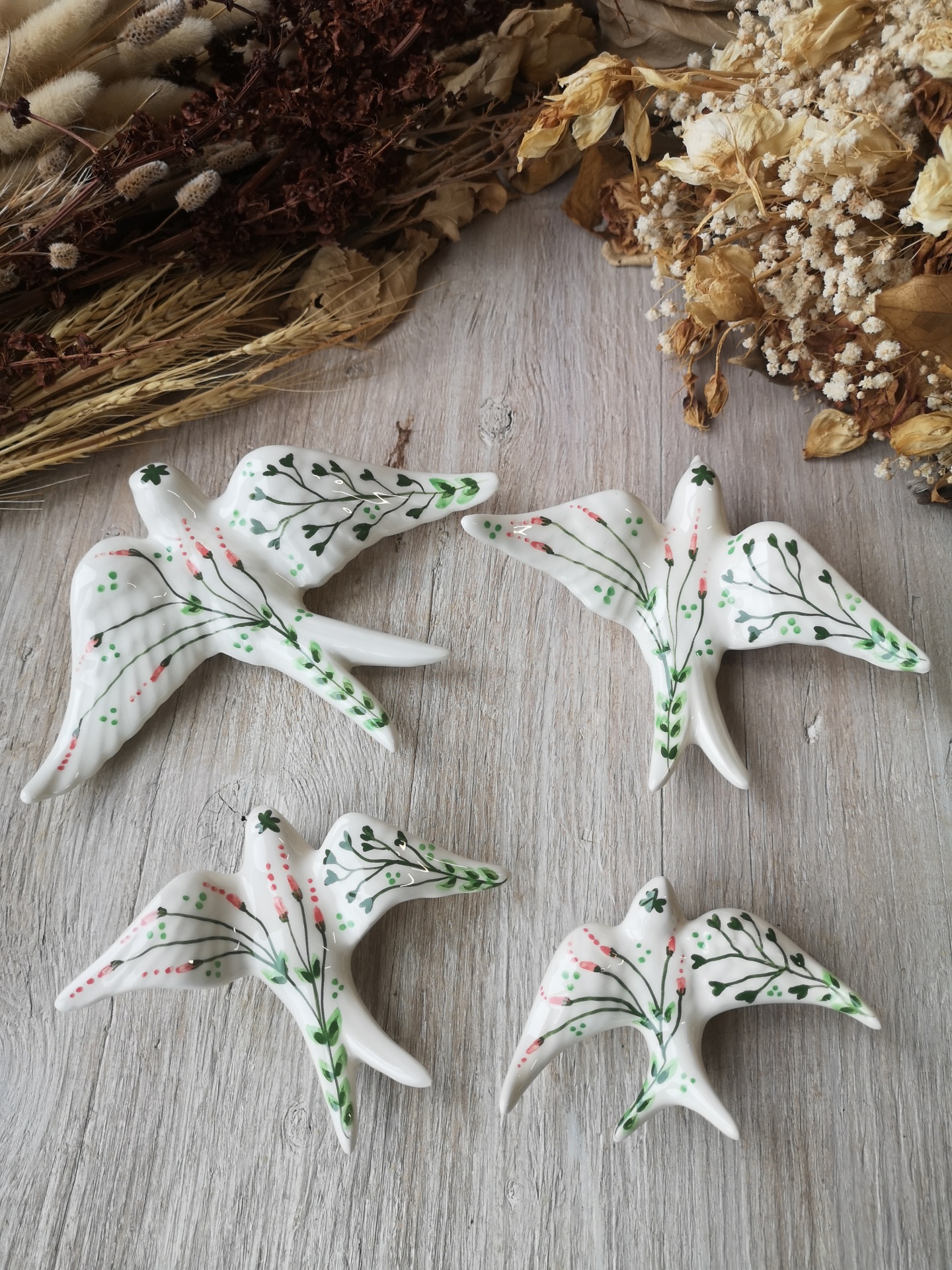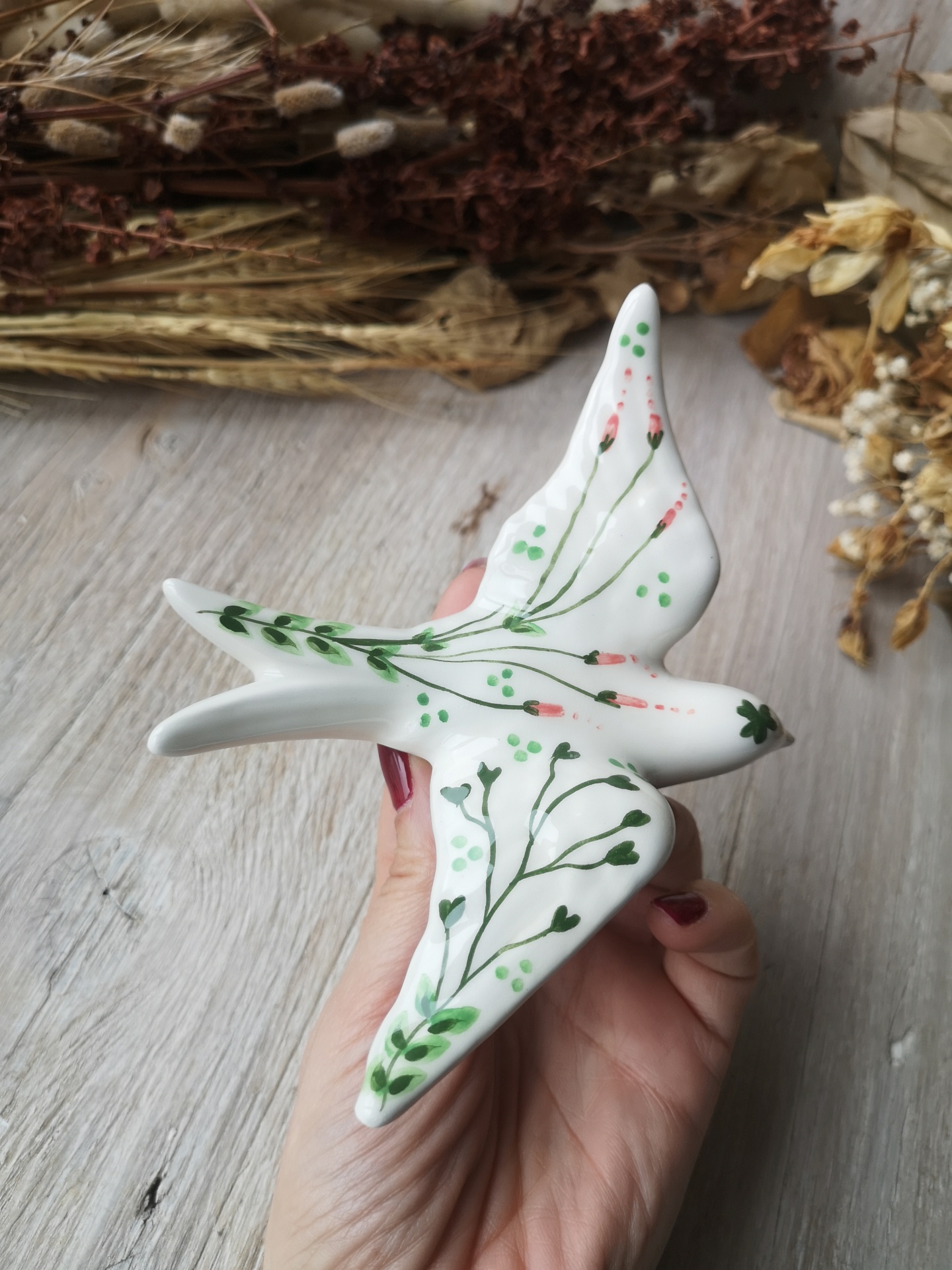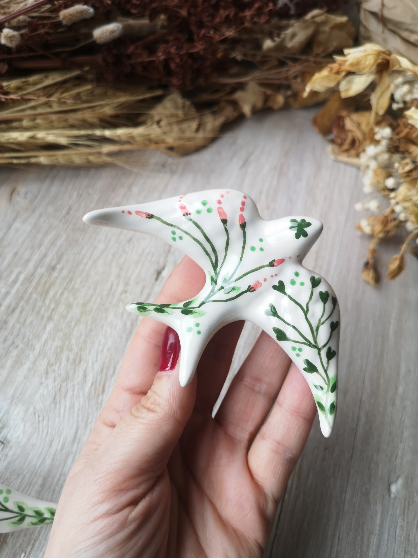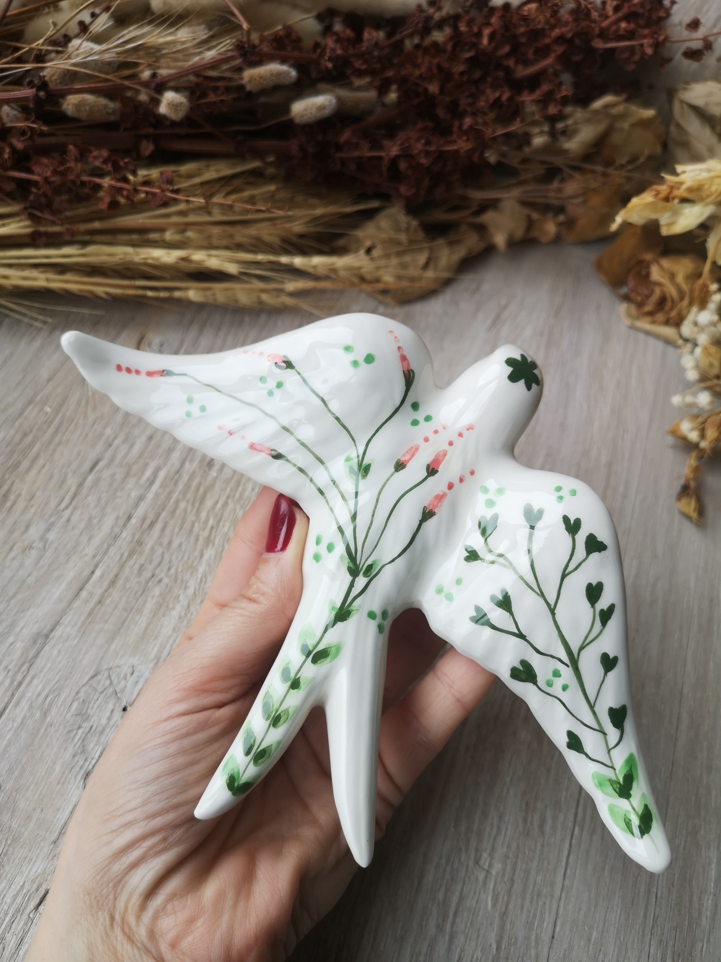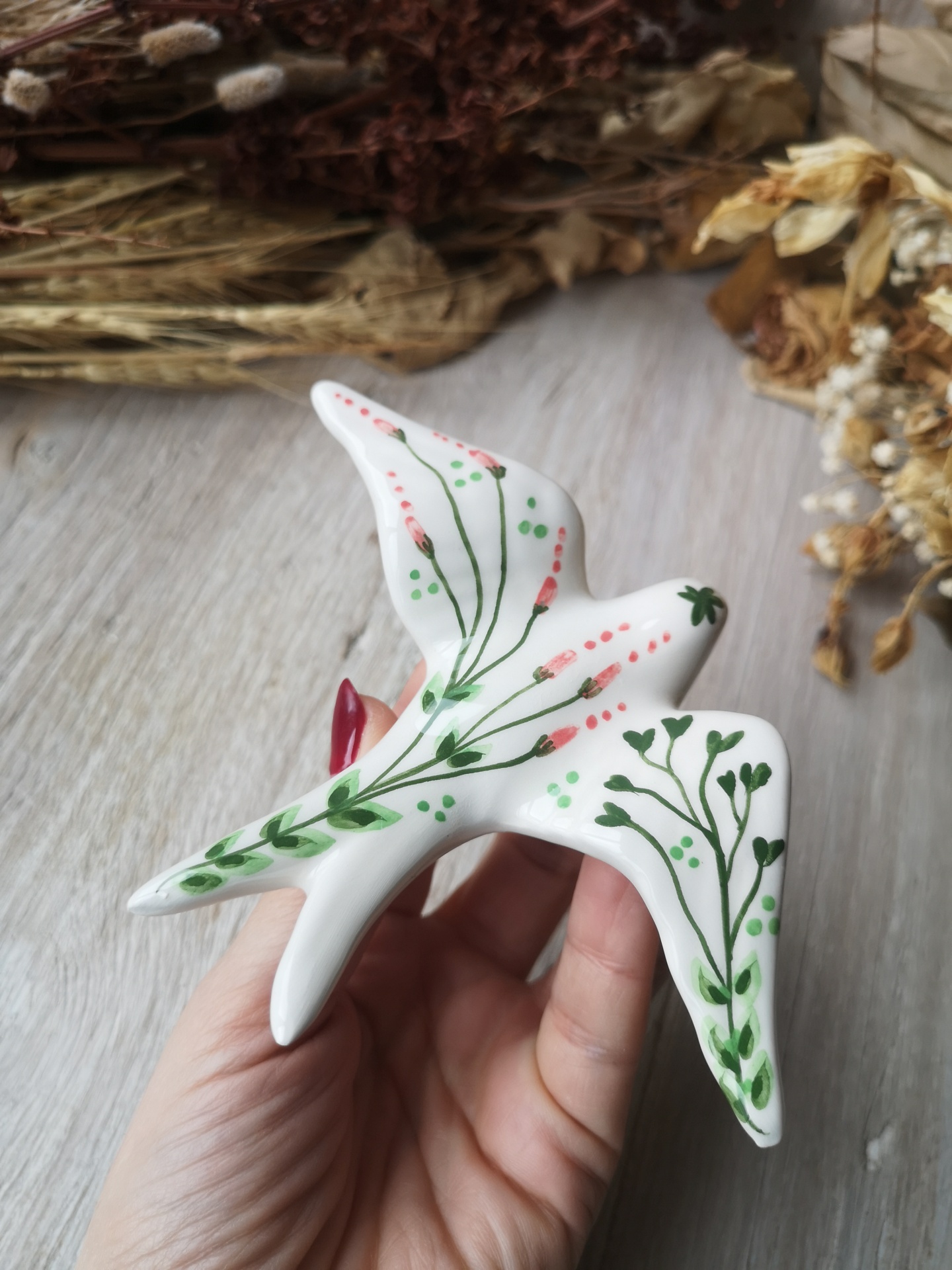 Andorinha em cerâmica, pintada à mão , padrão floral