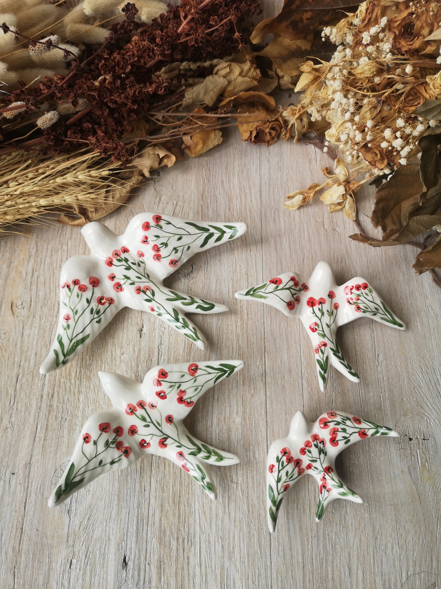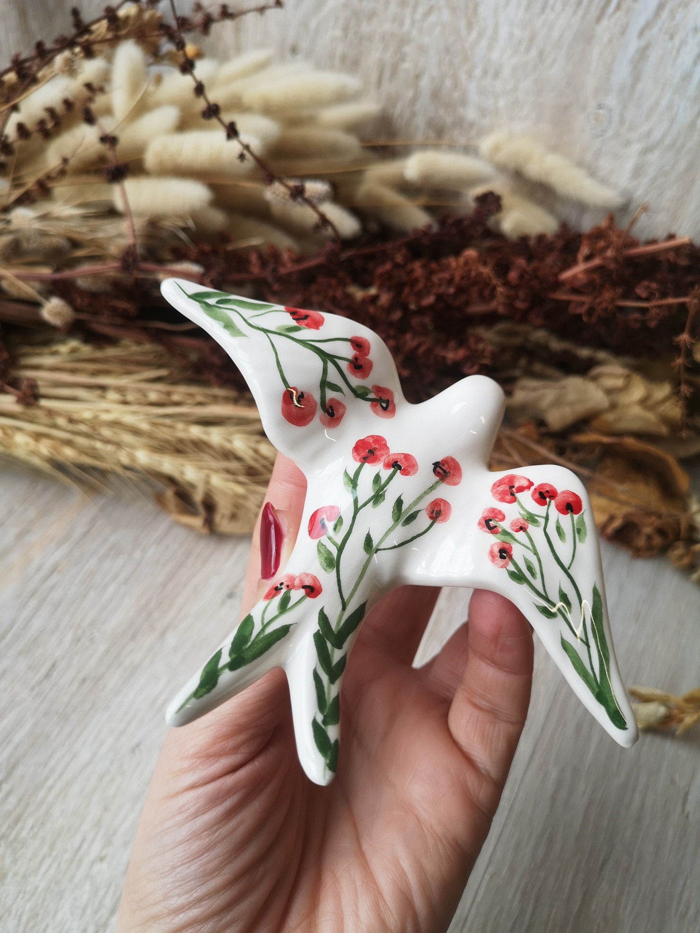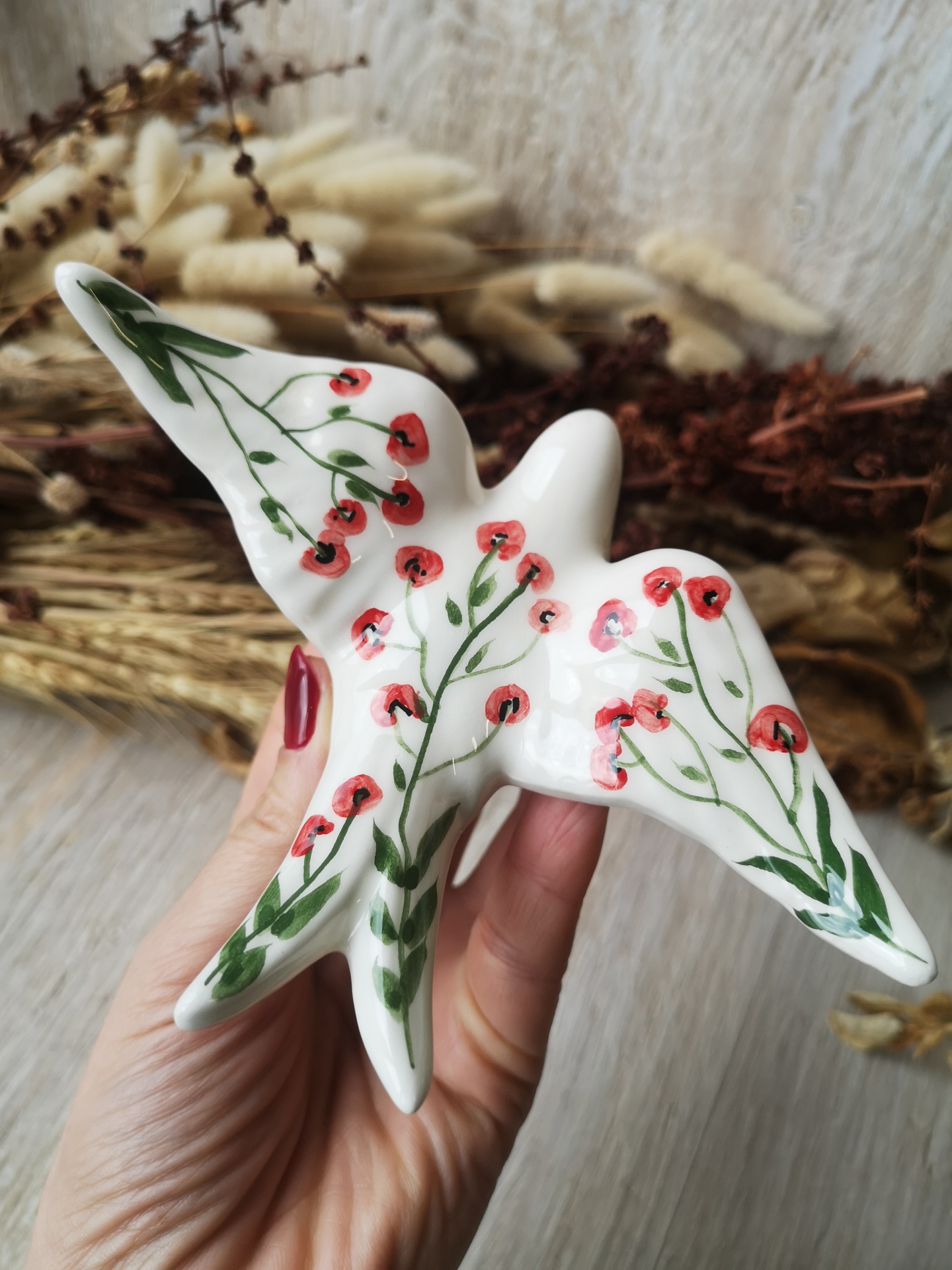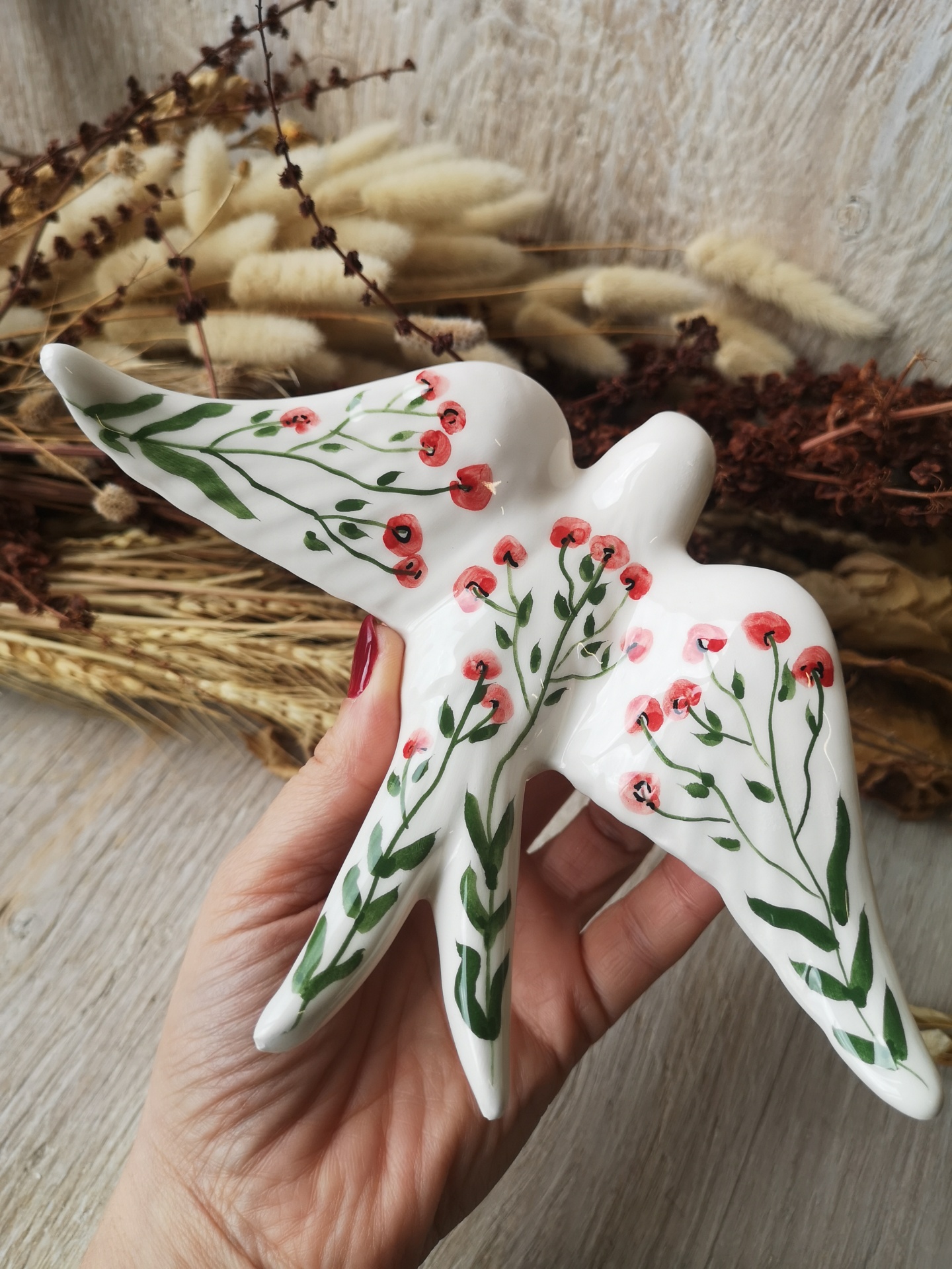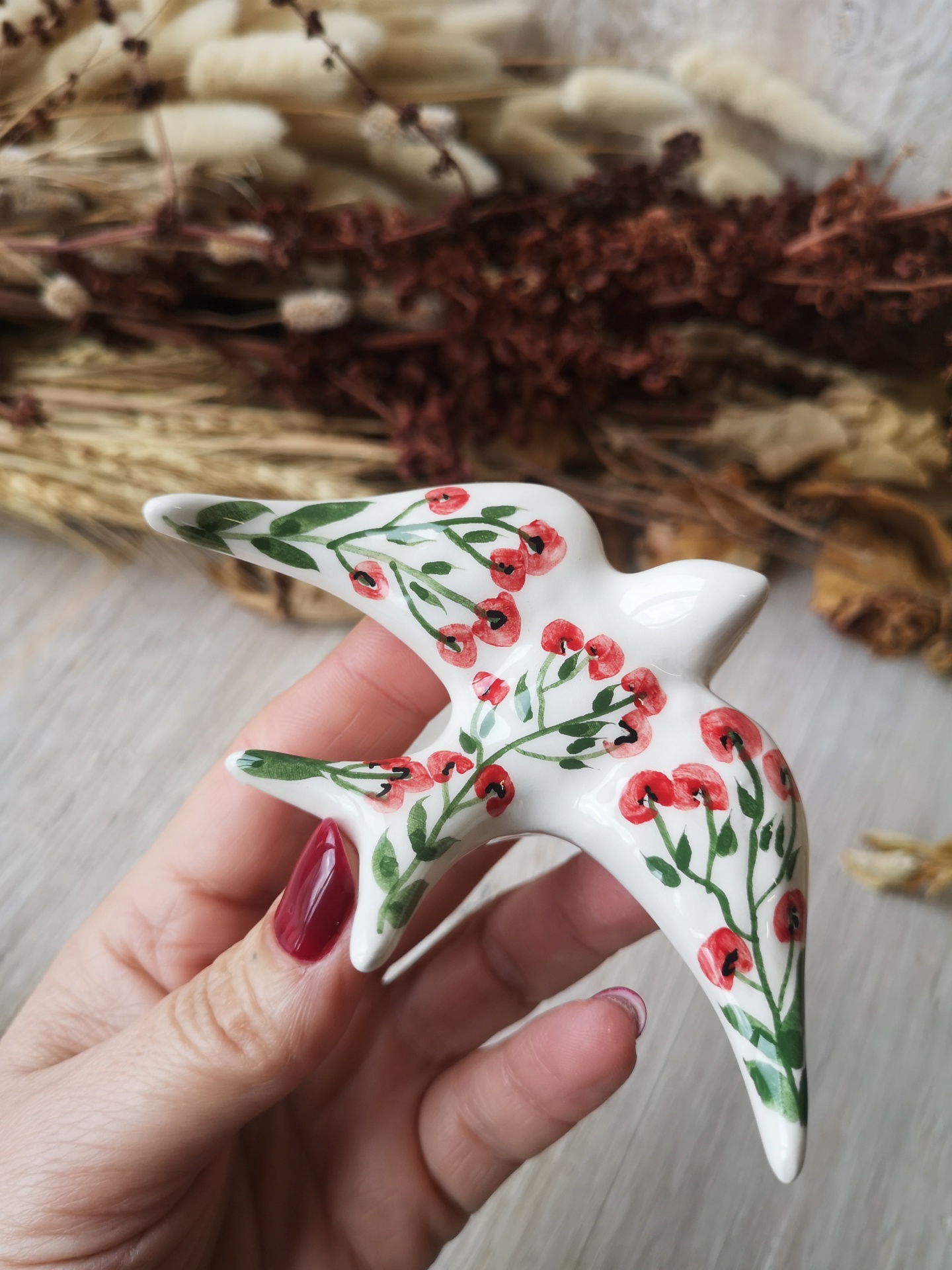 Andorinha em cerâmica, pintada à mão , padrão Papoila.