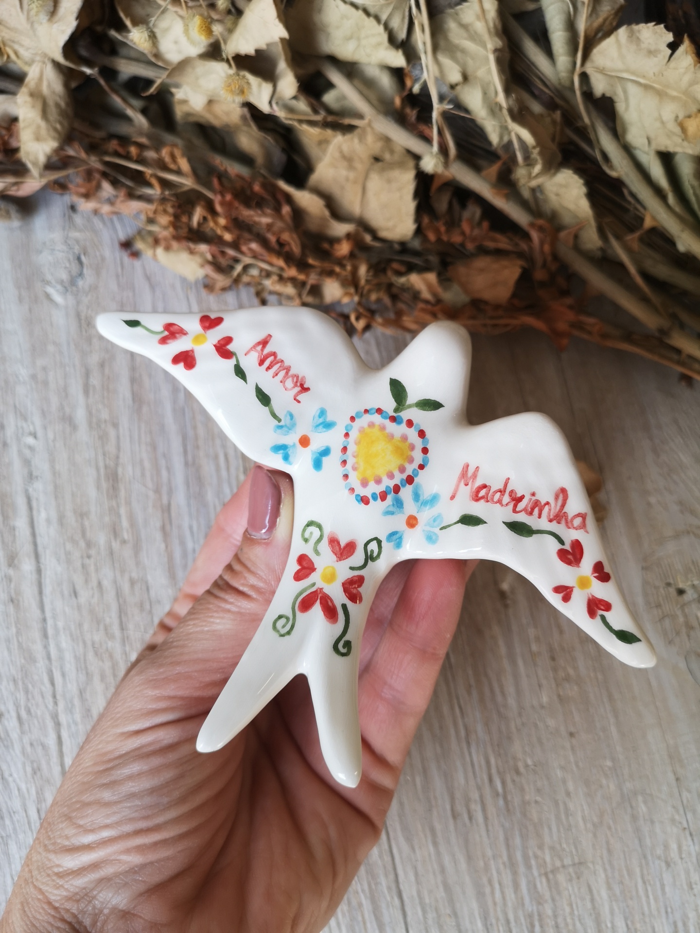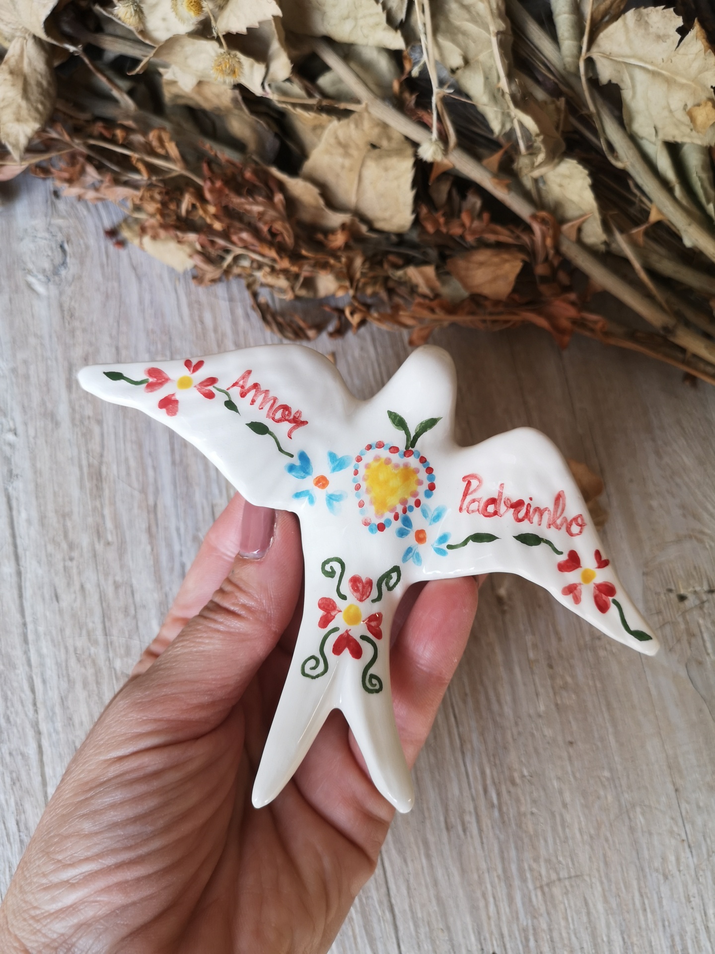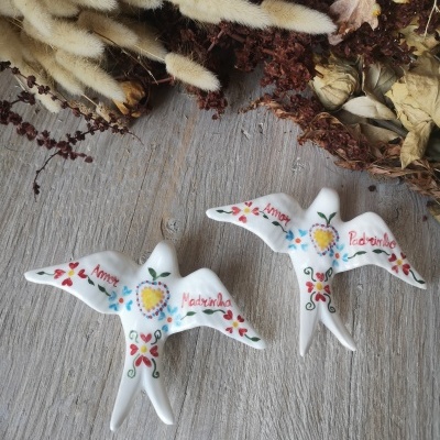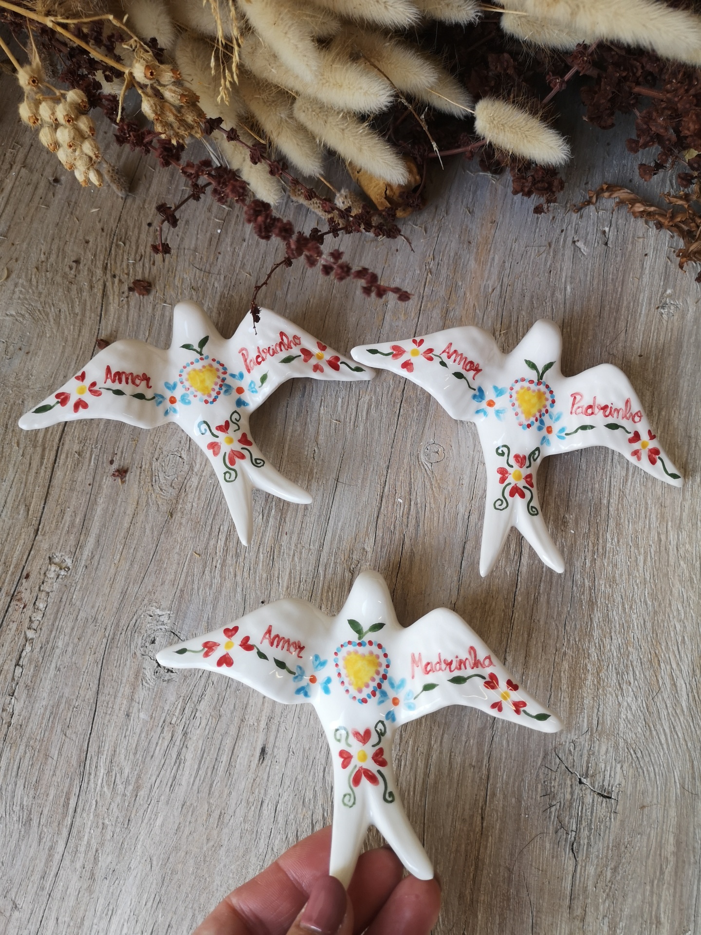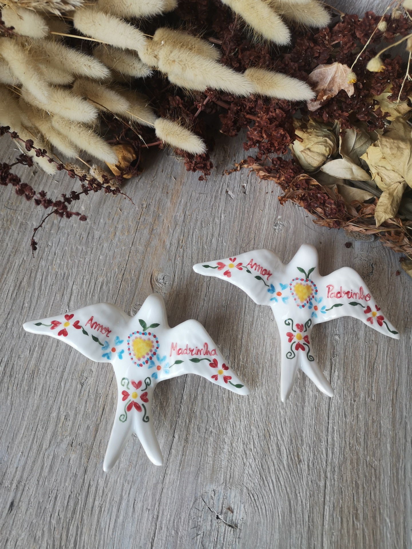 Andorinha lenços dos namorados em cerâmica, pintadas à mão, com palavra Amor e Madrinha ou Amor e Padrinho