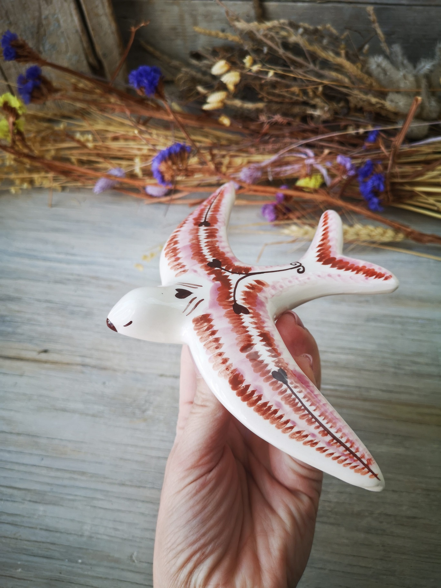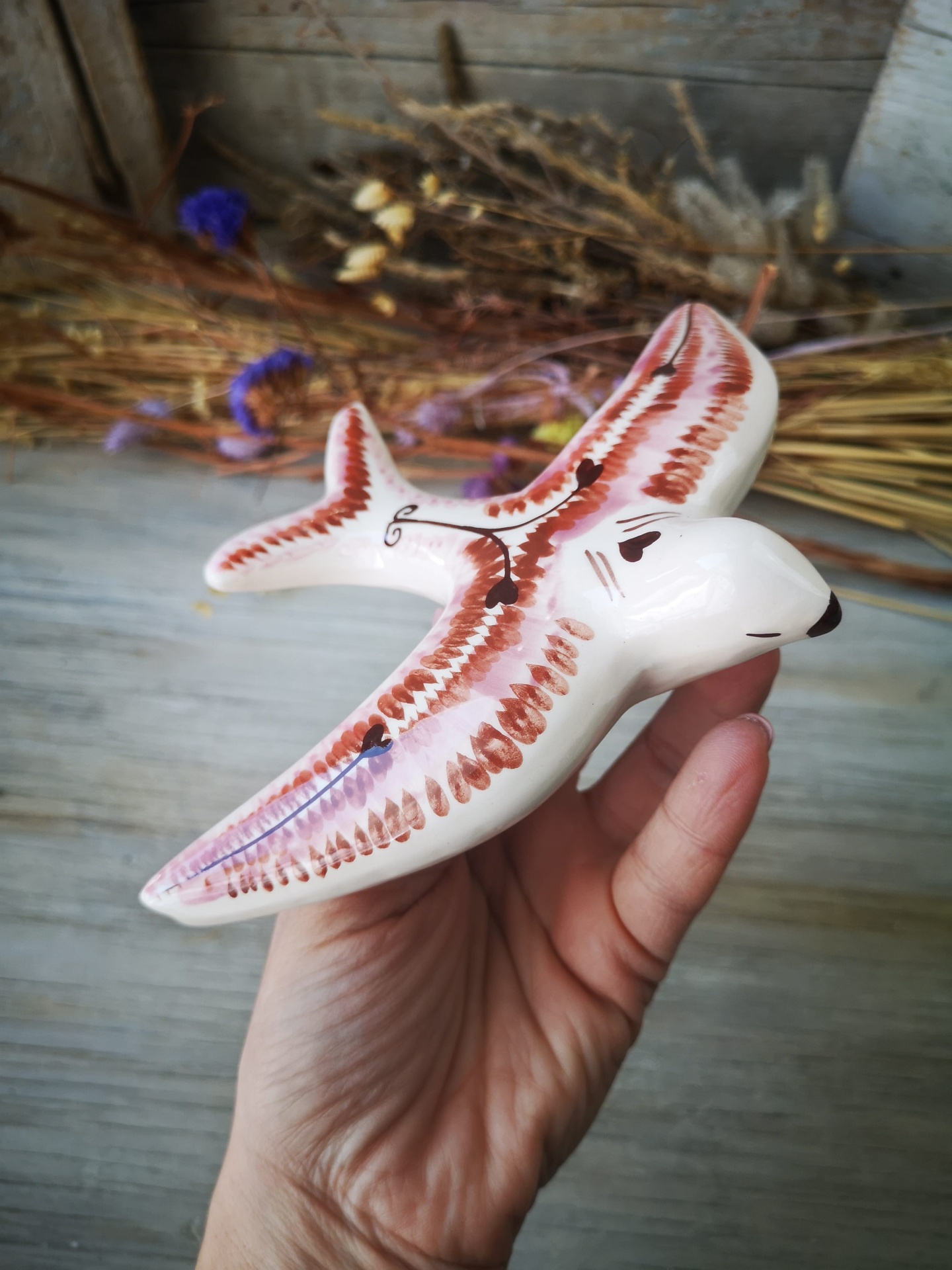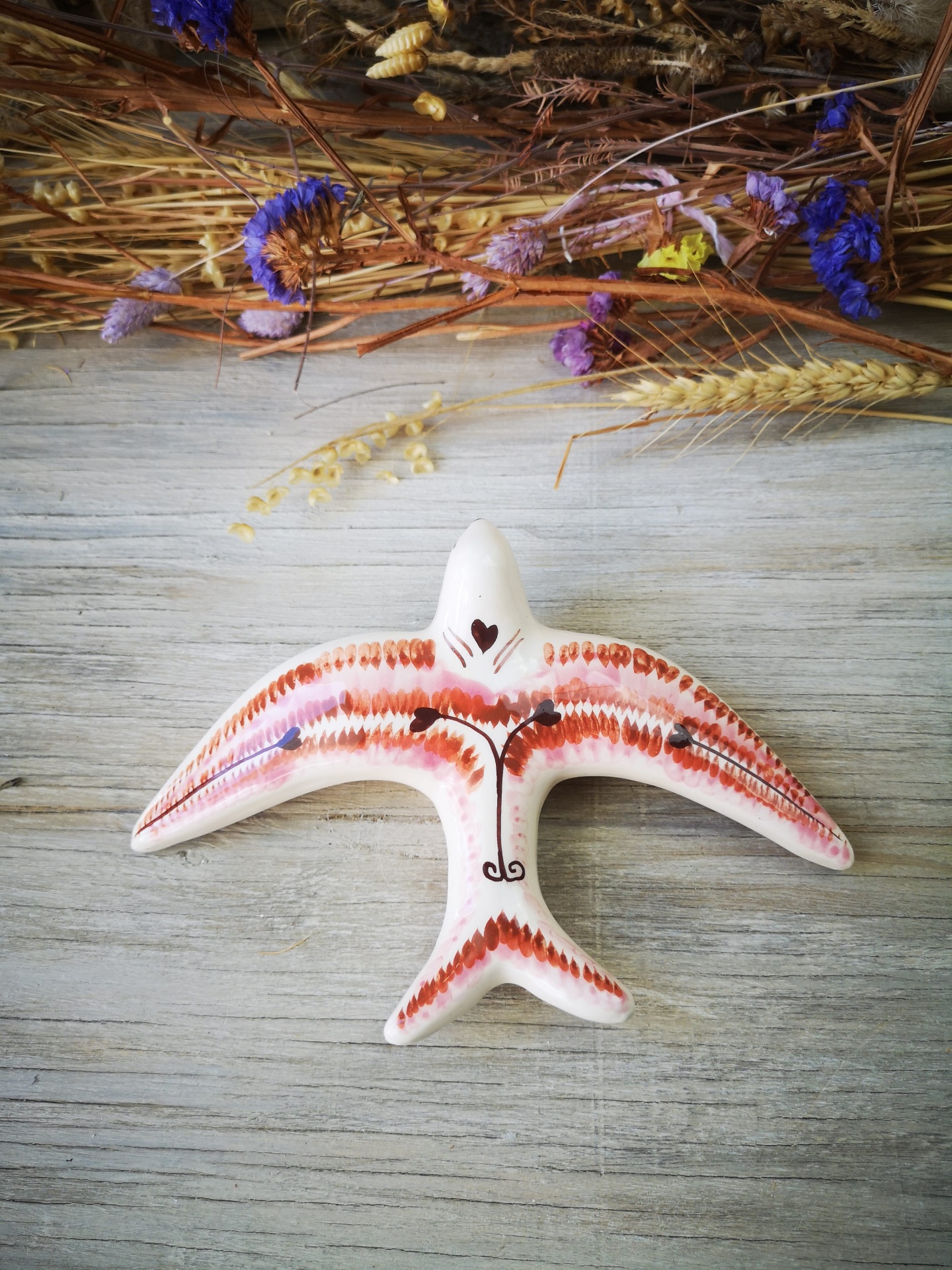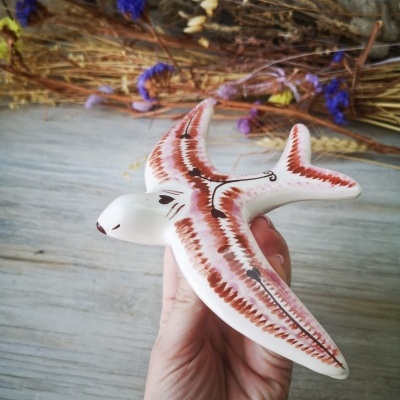 Andorinha modelo vintage, em cerâmica com padrão étnico em rosa e castanho, pintadas à mão.