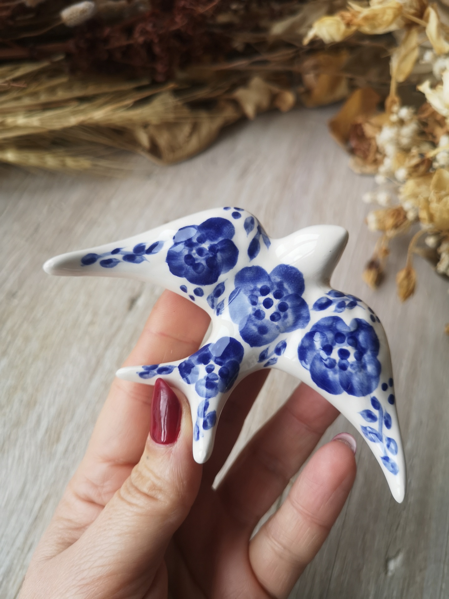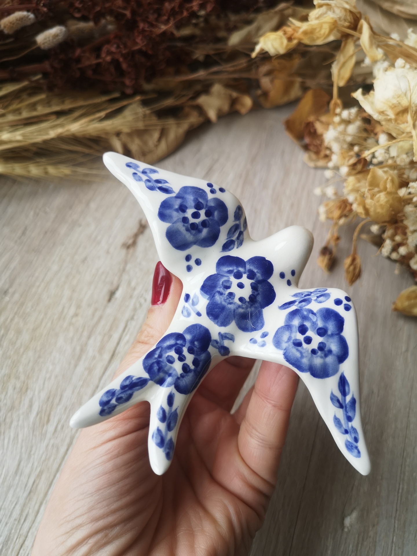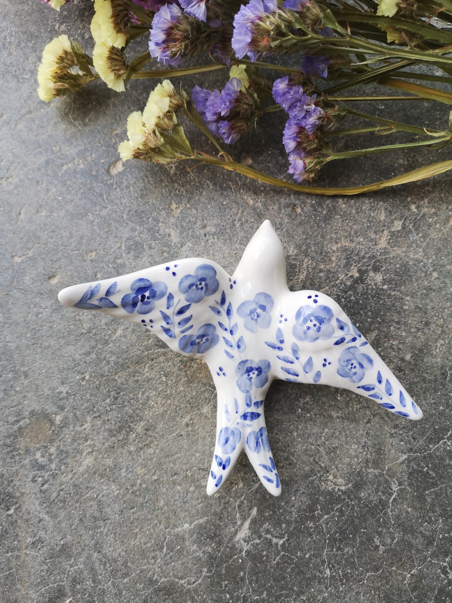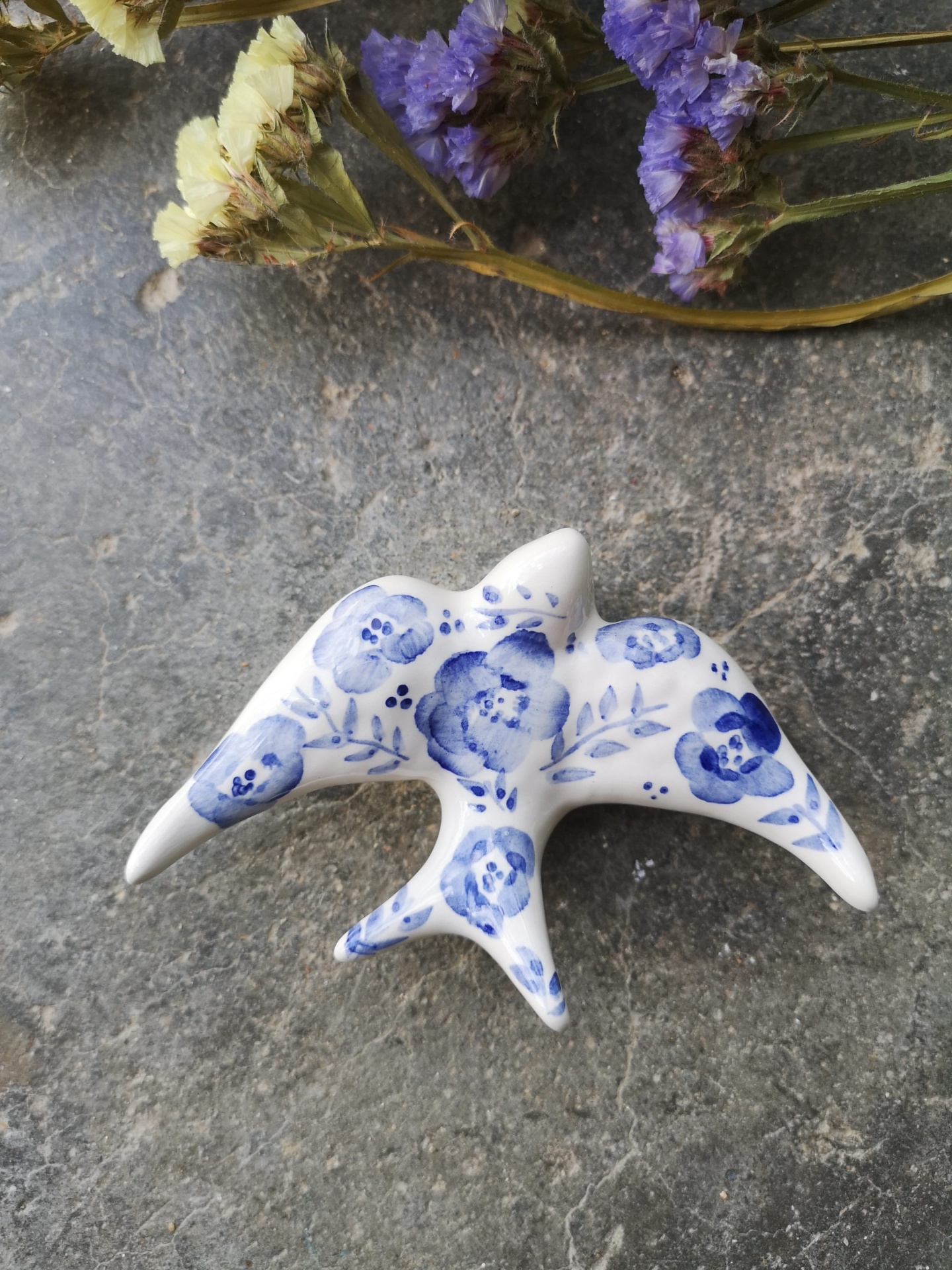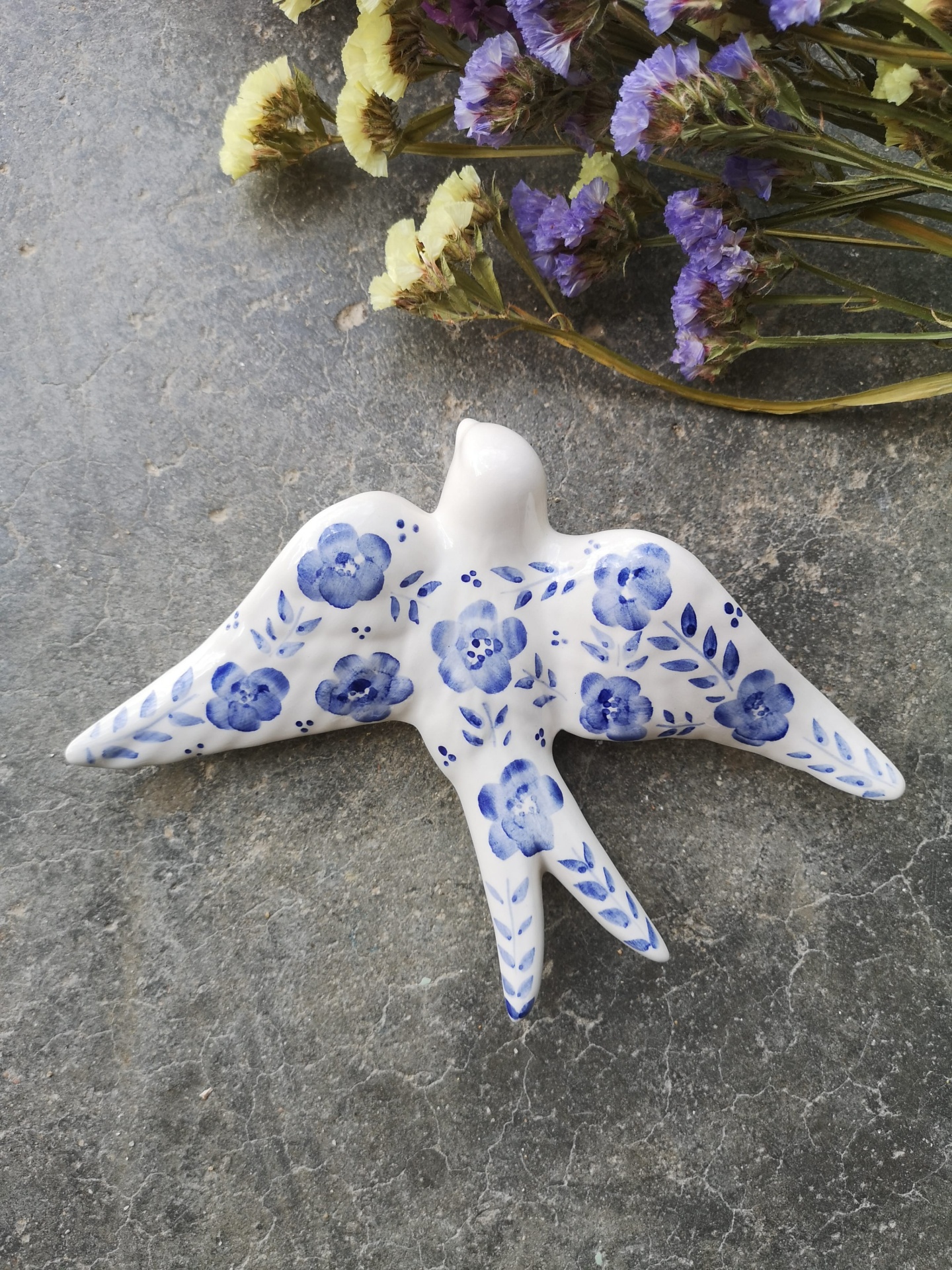 Andorinha padrão floral azul cobalto em cerâmica, pintados à mão.