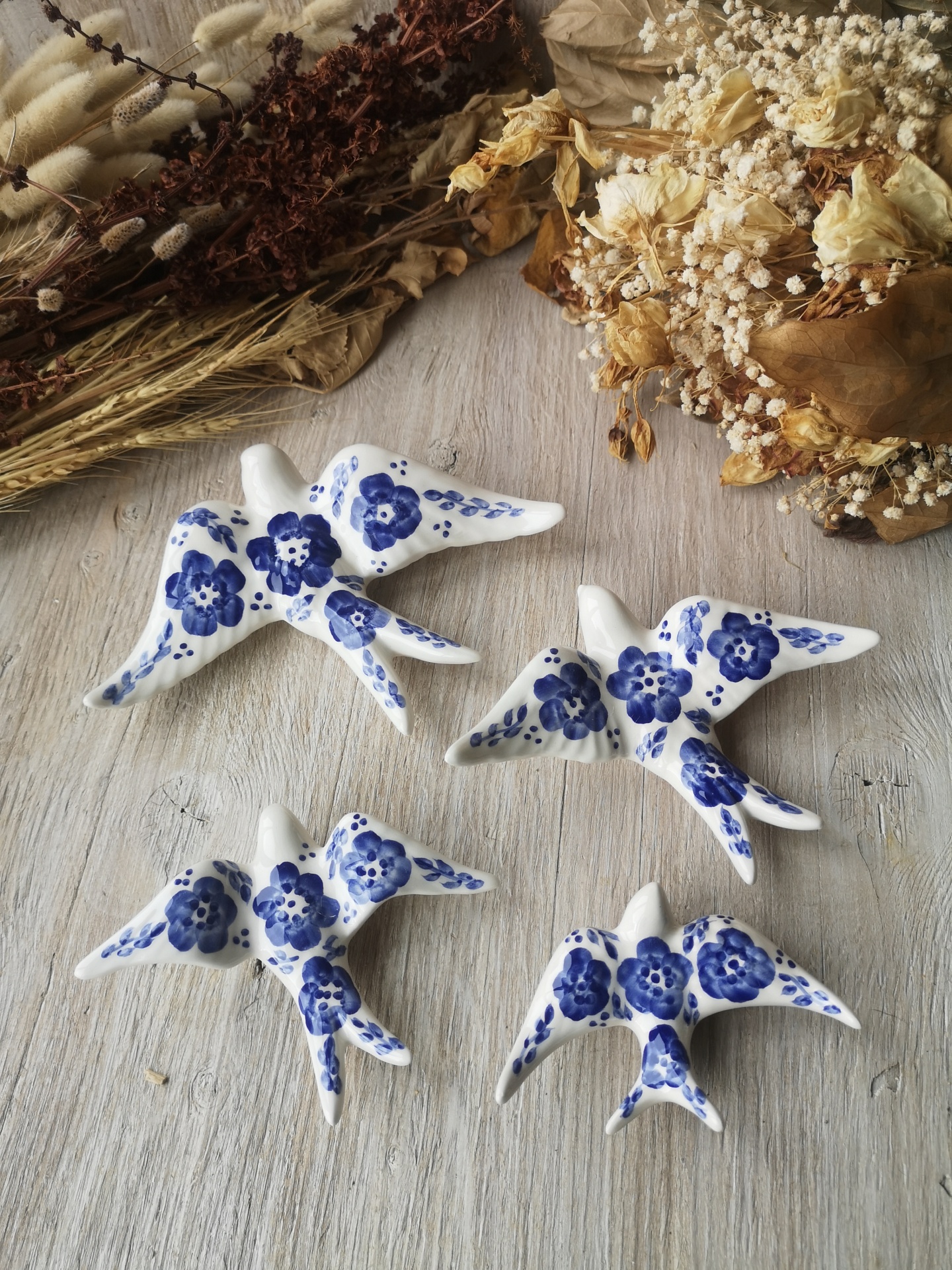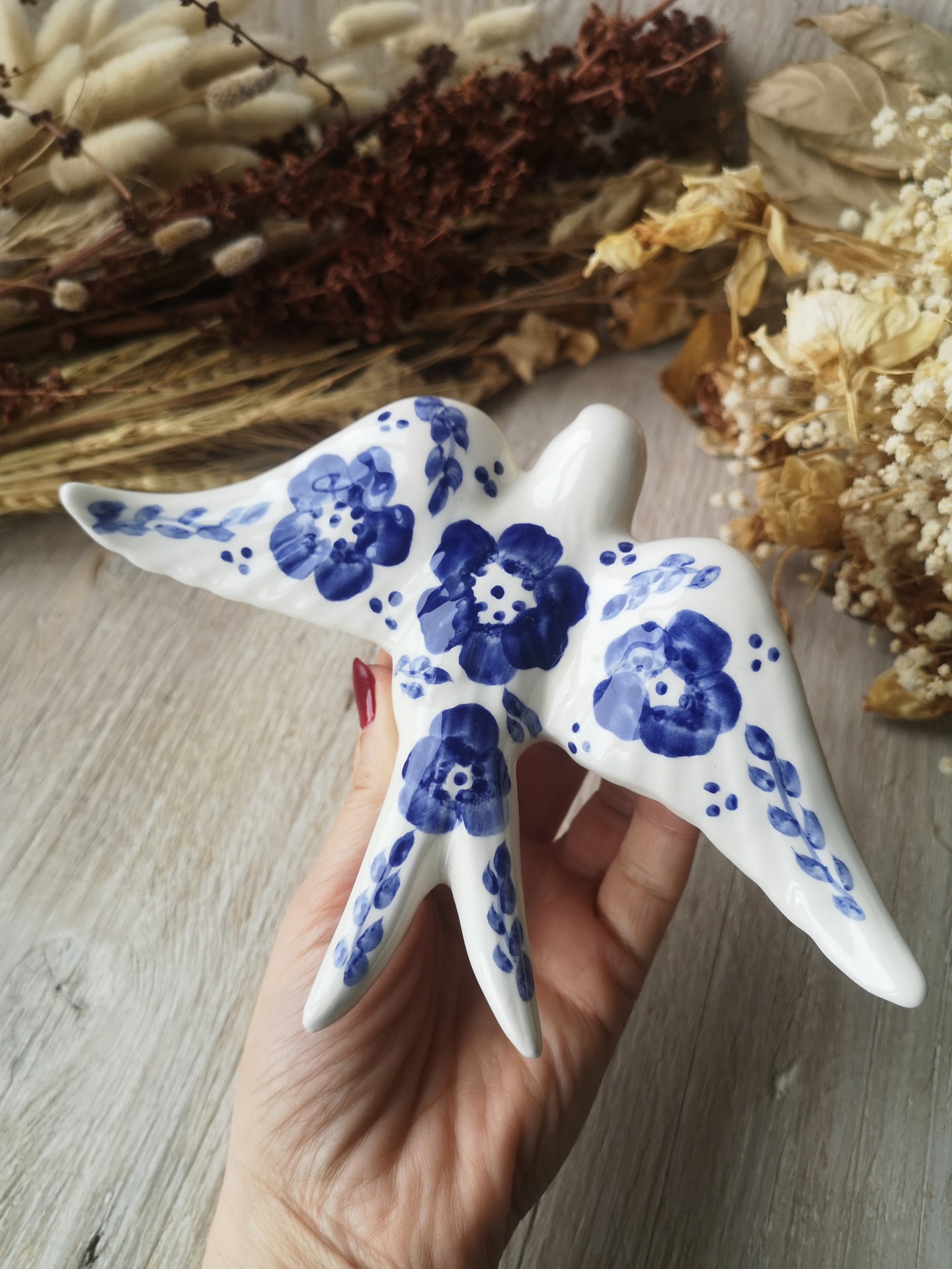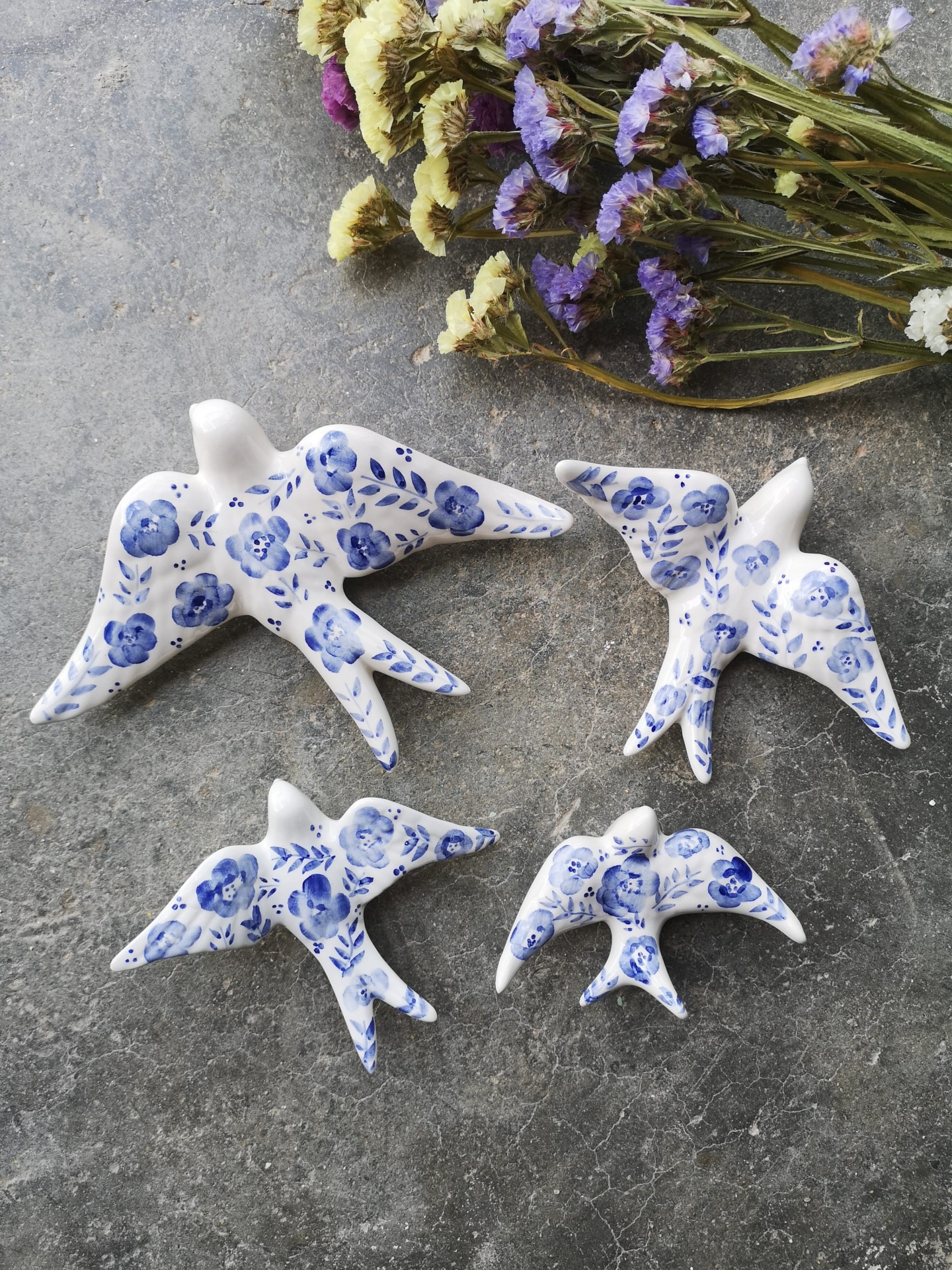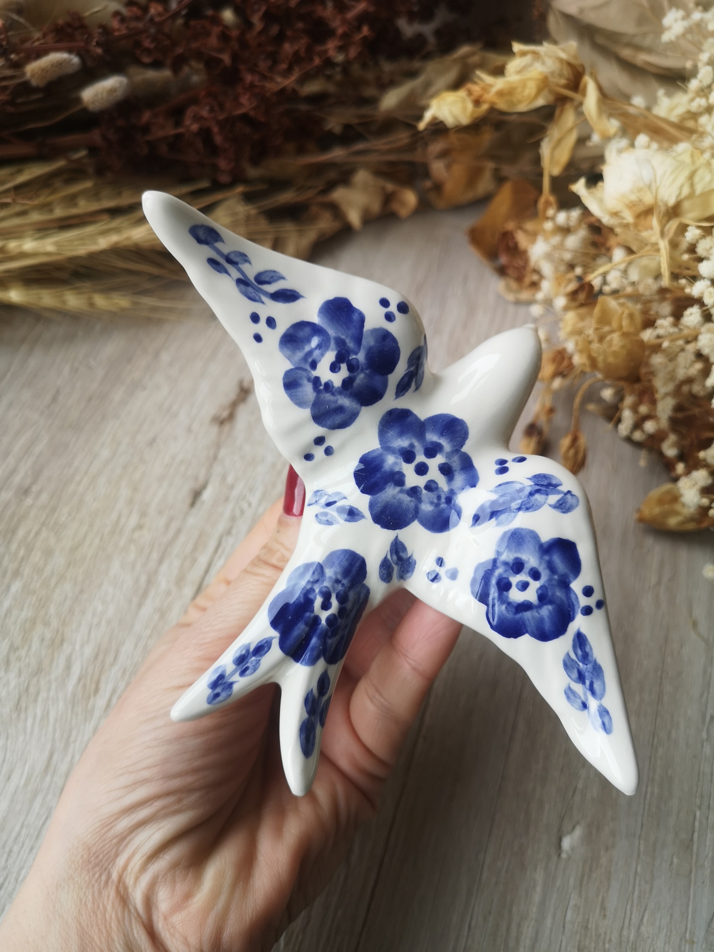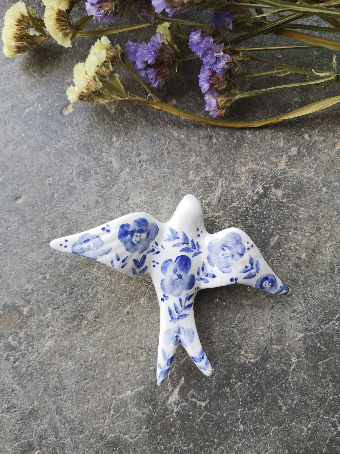 Andorinha padrão floral azul cobalto em cerâmica, pintados à mão.