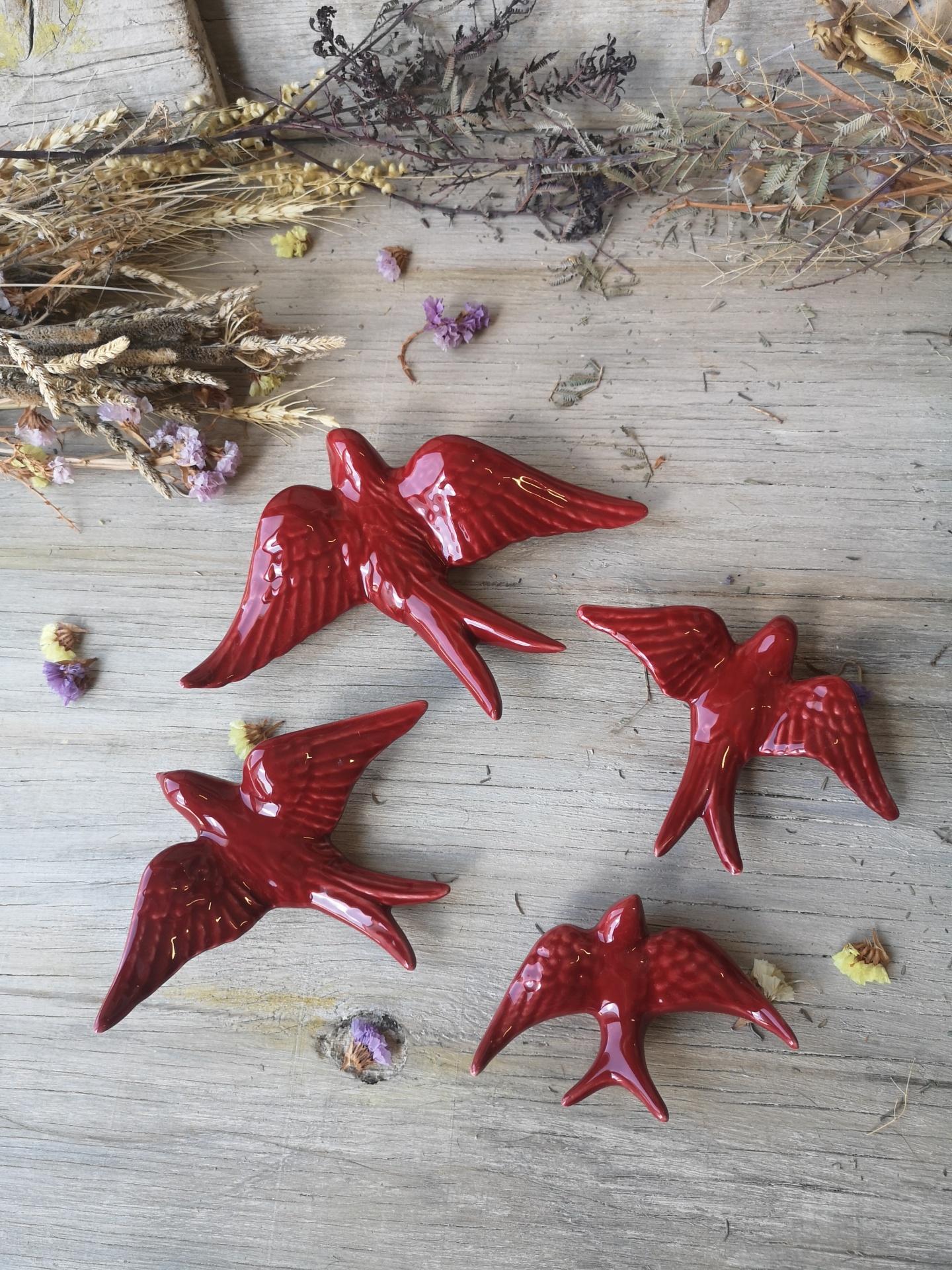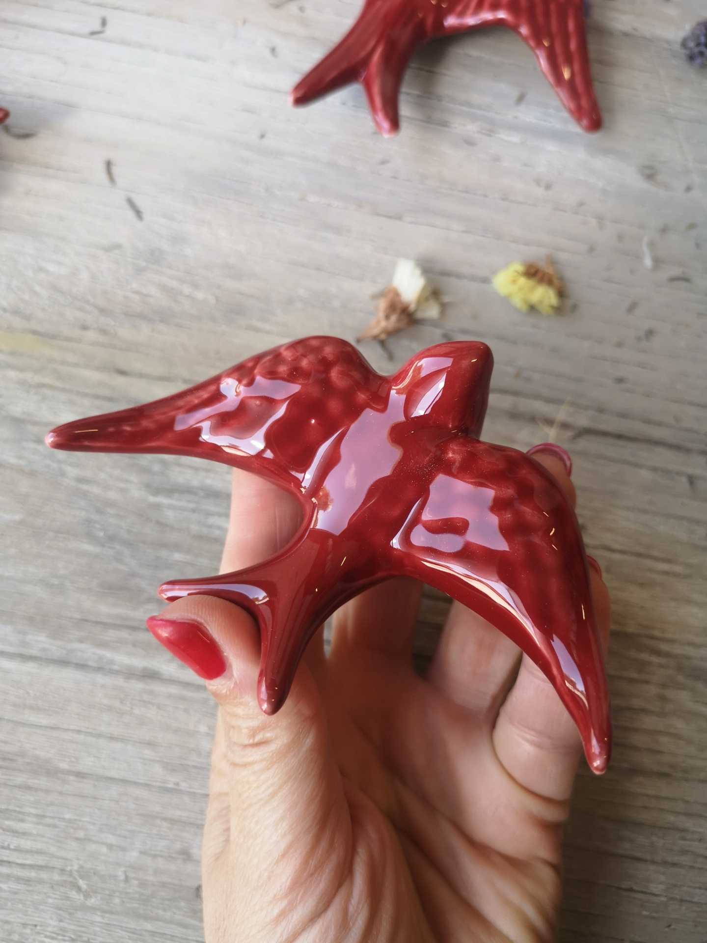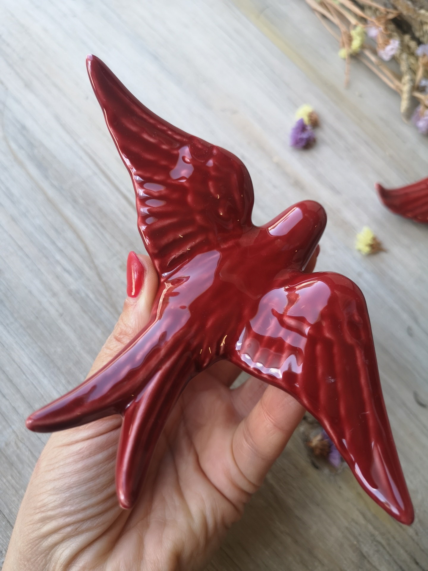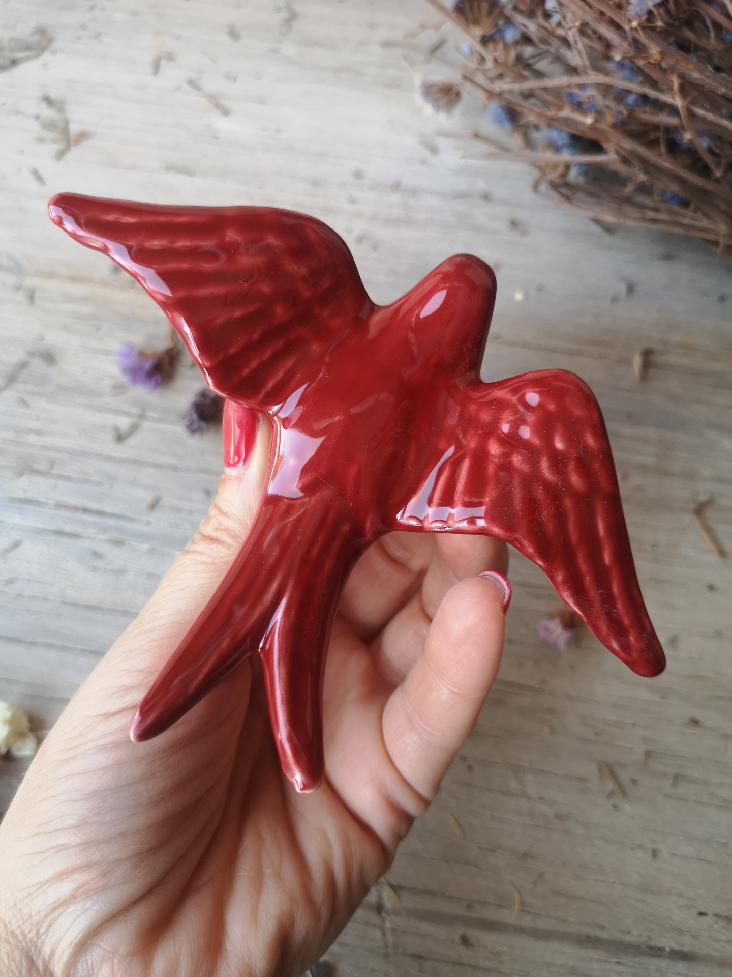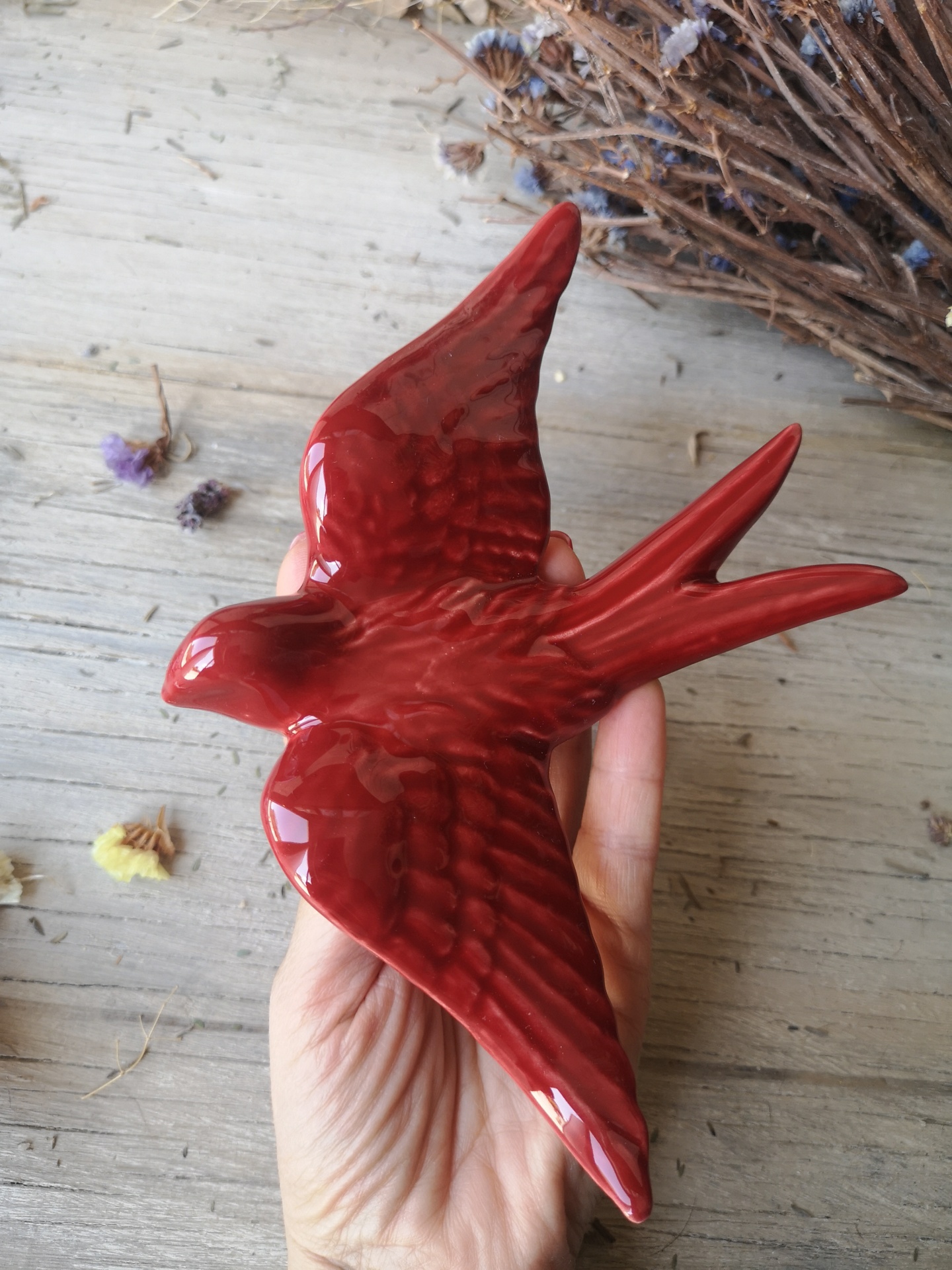 Andorinha vermelho escuro em cerâmica.