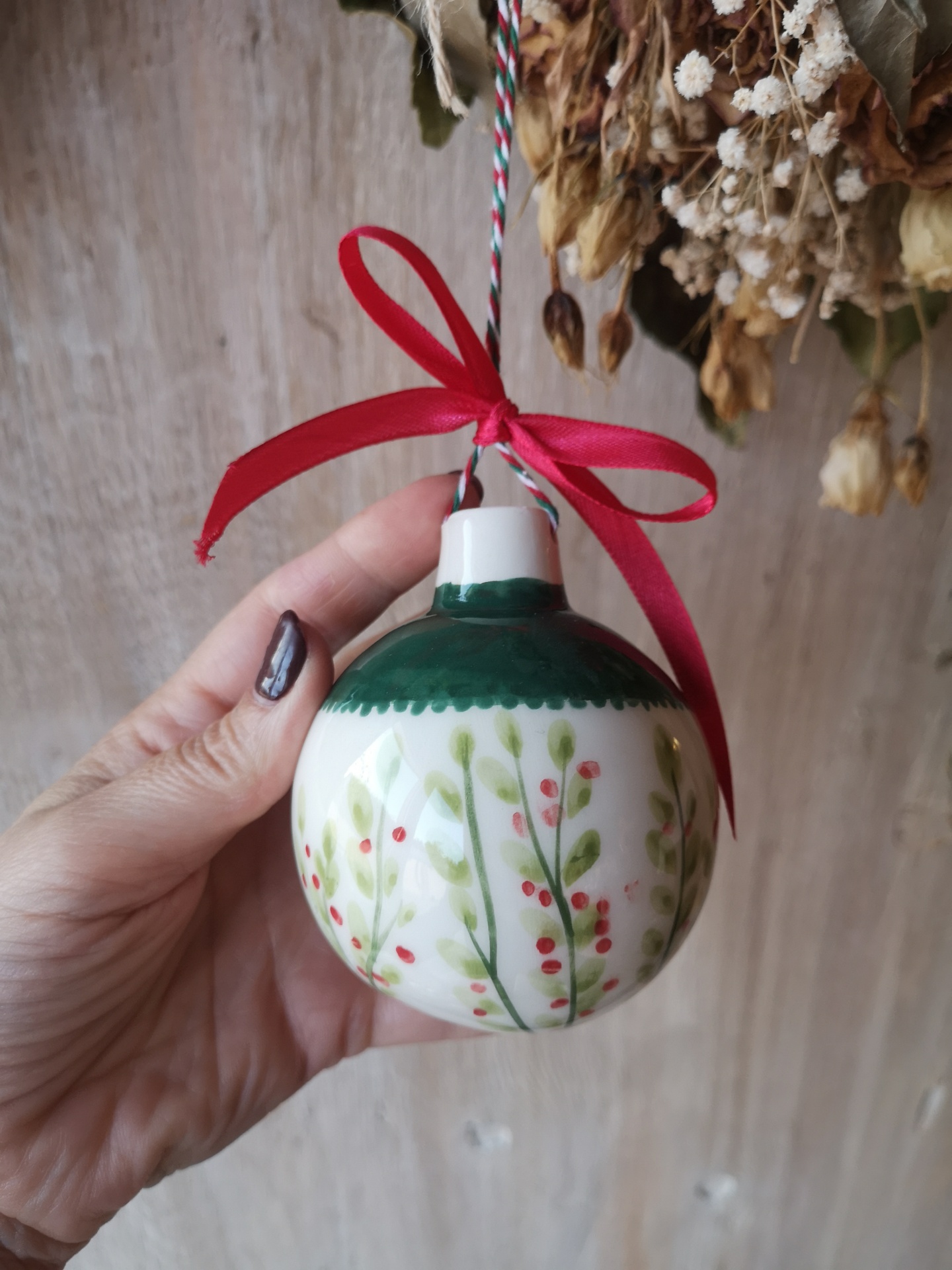 Bola de Natal em cerâmica com folhagem pintada e laço vermelho