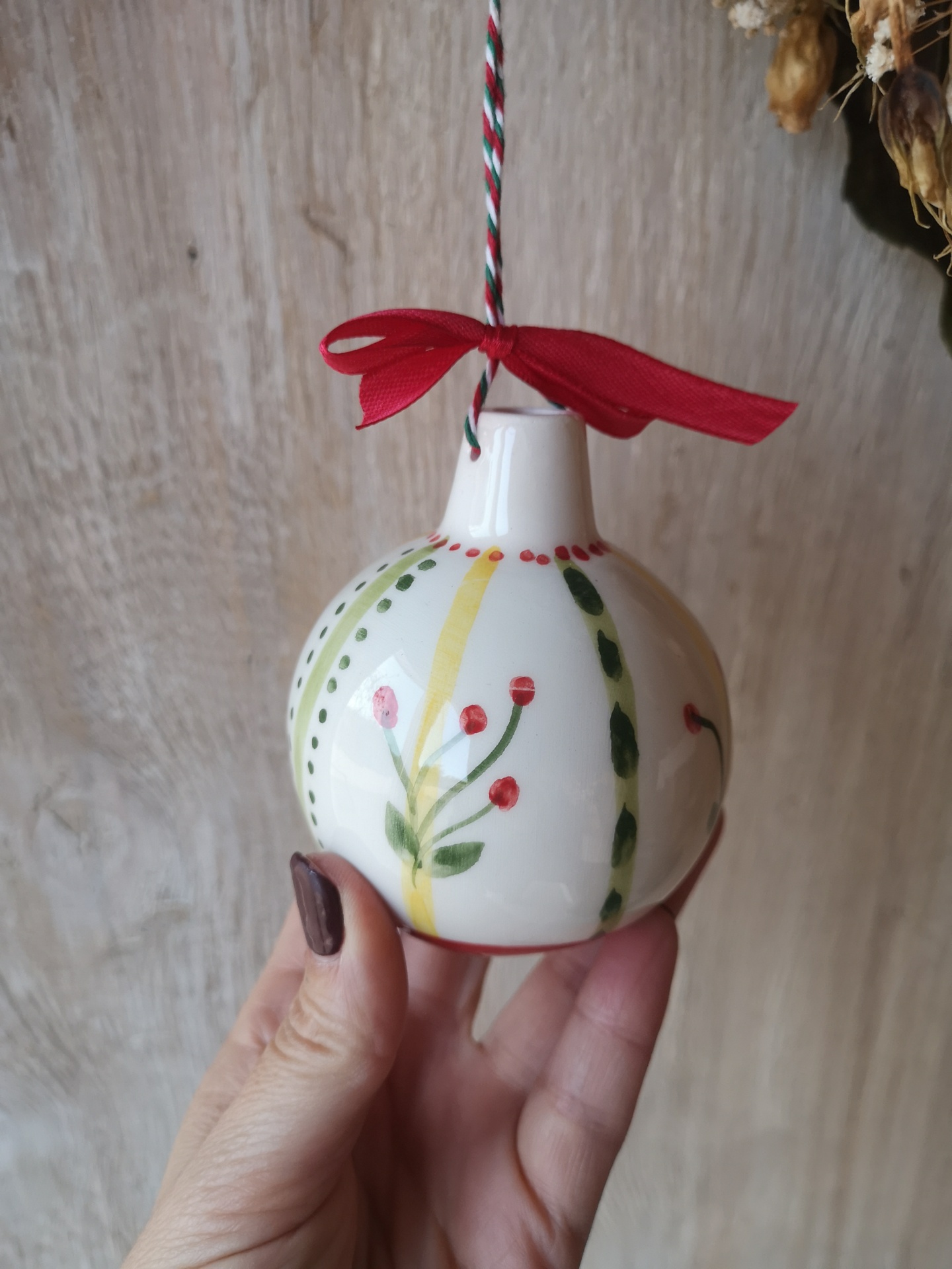 Conjunto de bolas de Natal cerâmicas decoradas à mão com fitas vermelhas