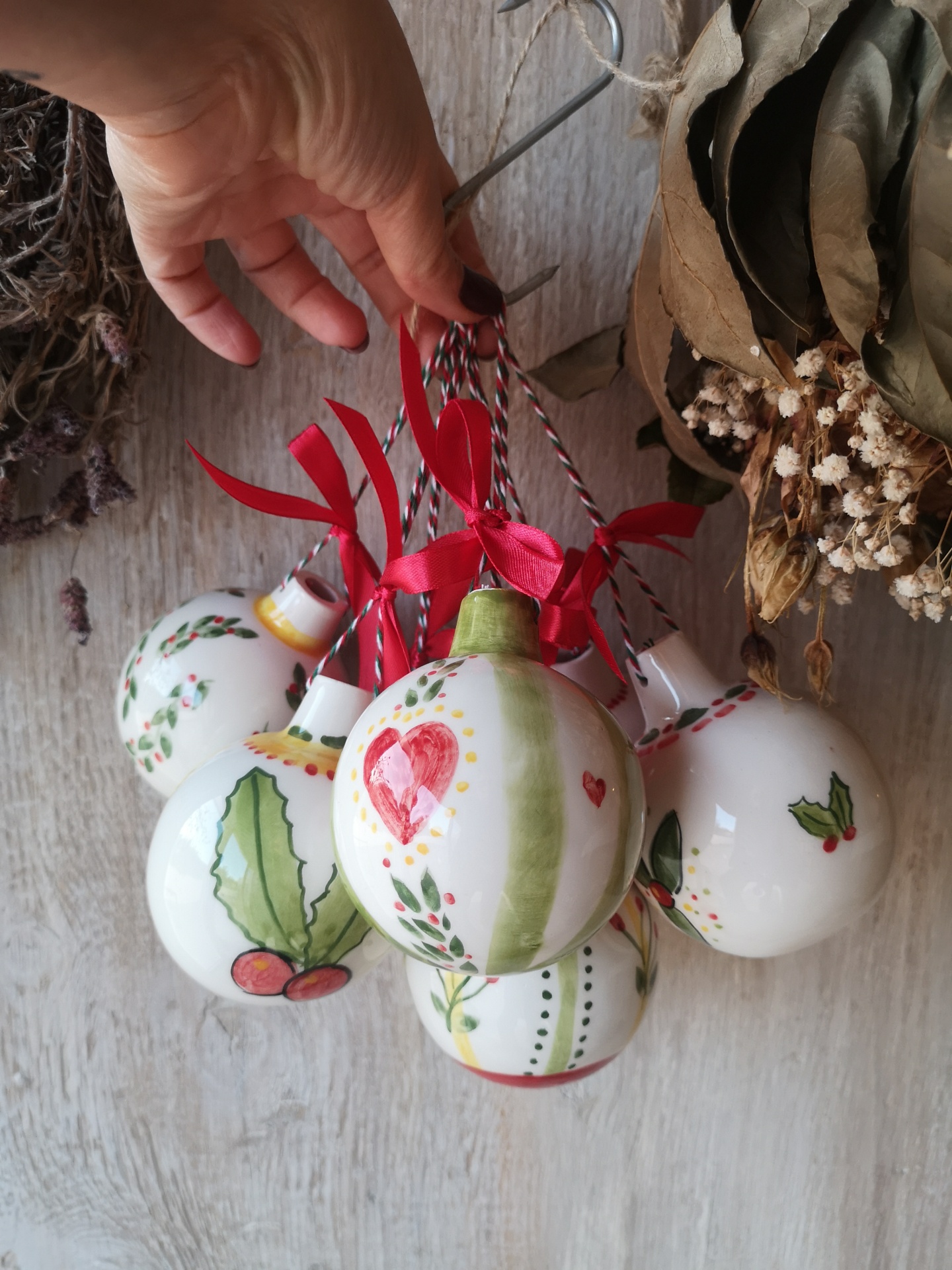 Conjunto de bolas de Natal cerâmicas decoradas à mão com fitas vermelhas