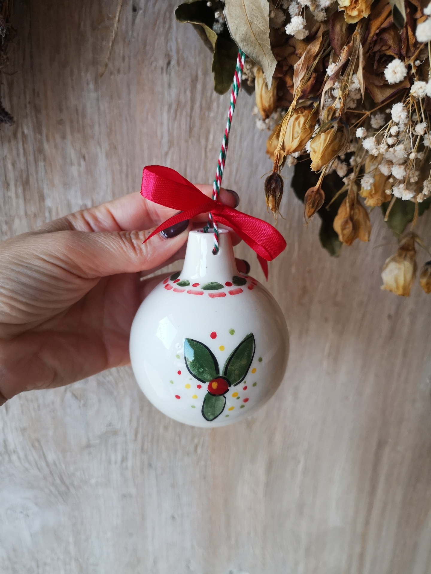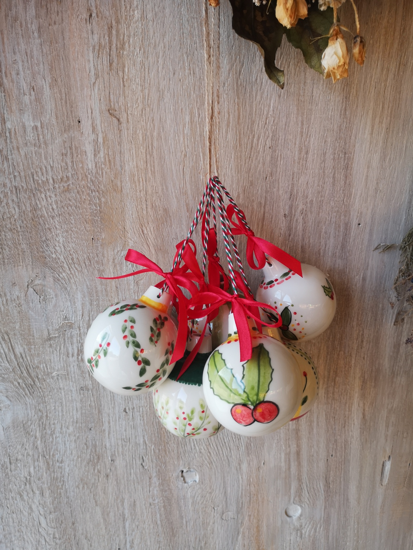 Conjunto de bolas de Natal em cerâmica branca com desenhos de folhas e bagas, com fitas vermelhas, penduradas contra um fundo de madeira clara.