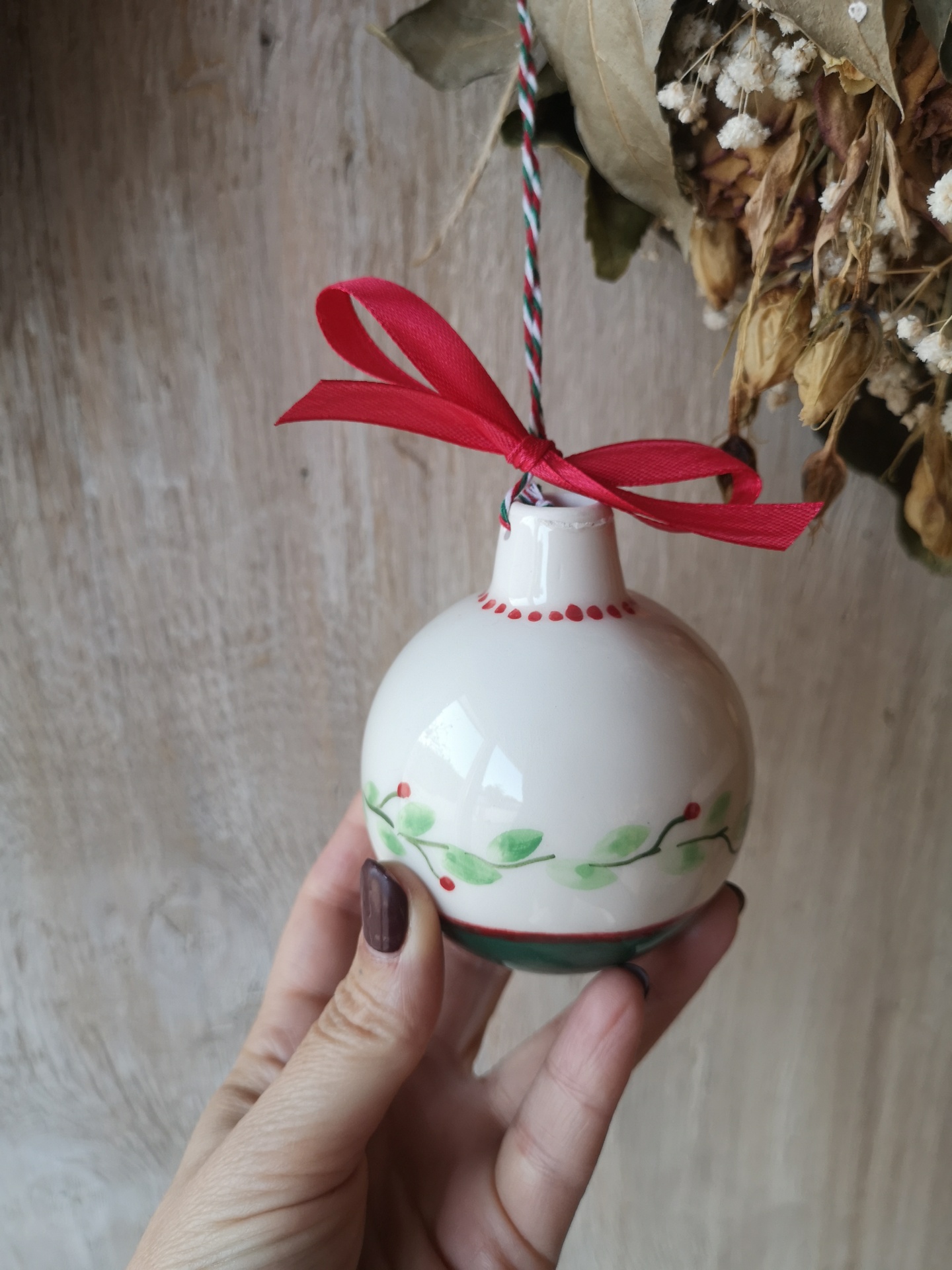 Bola de cerâmica branca decorada com ramos verdes e bagas vermelhas, com fita vermelha e cordão para pendurar.