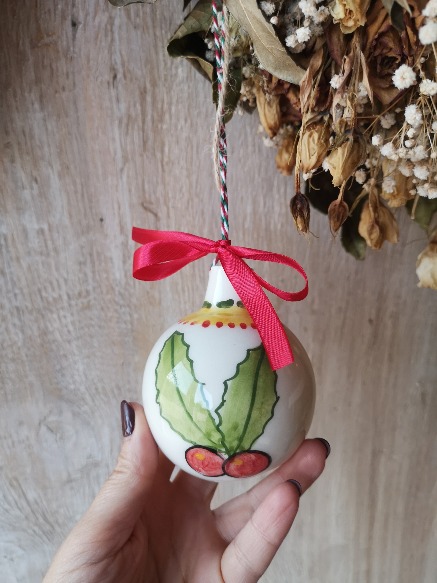 Bola de Natal cerâmica branca com folhas verdes e bagas vermelhas, laço vermelho, mão segurando, fundo madeira e flores secas