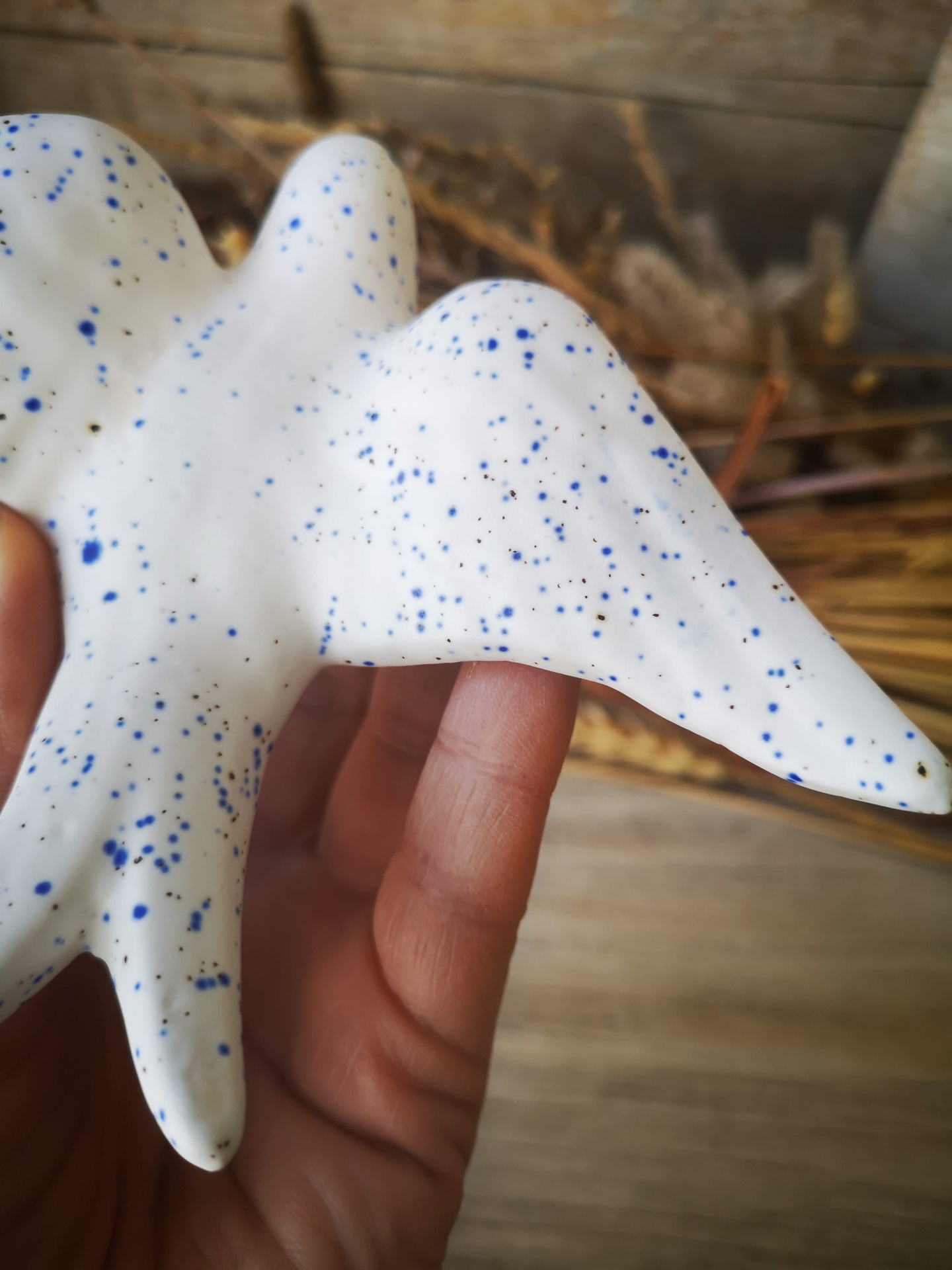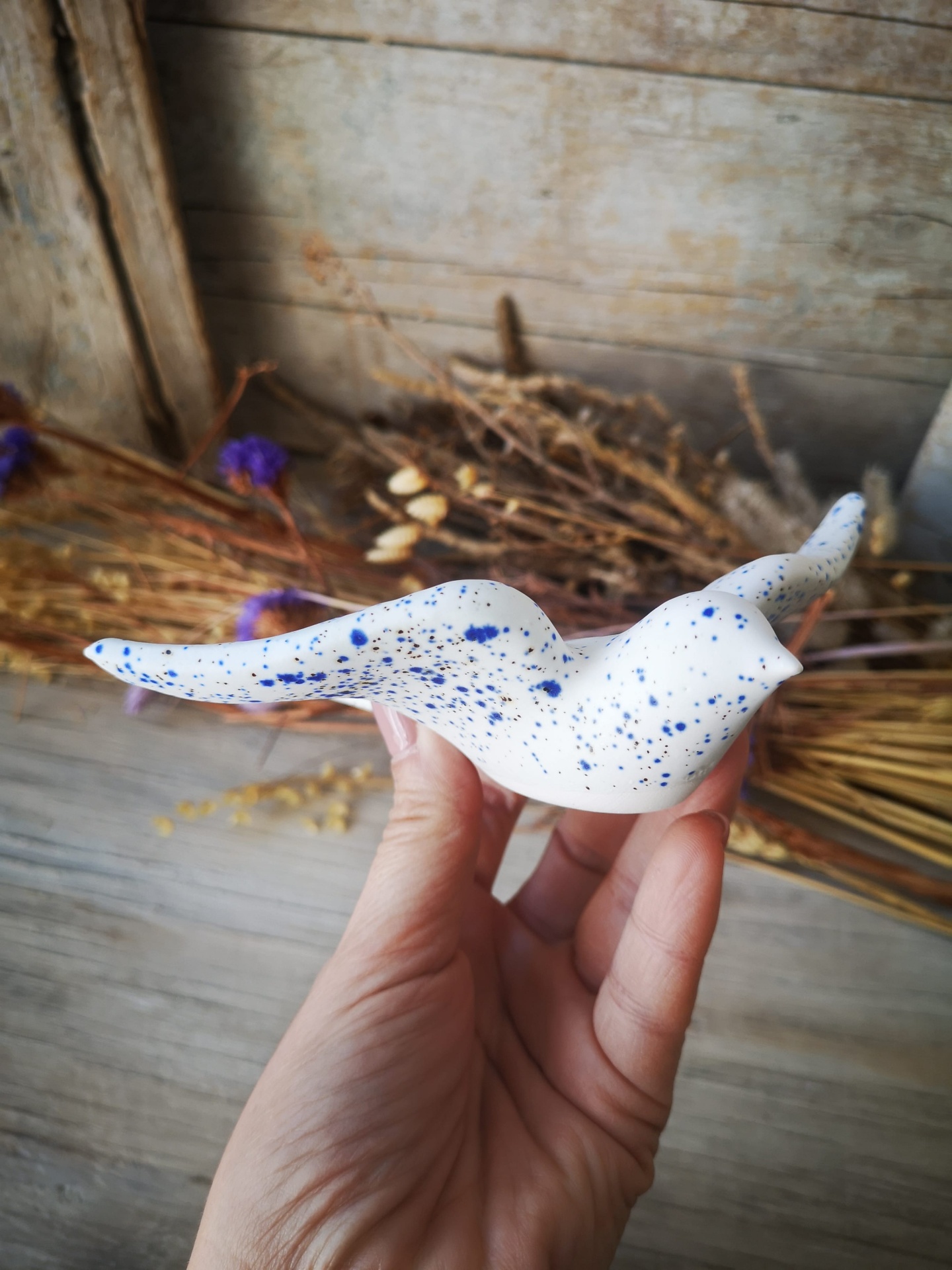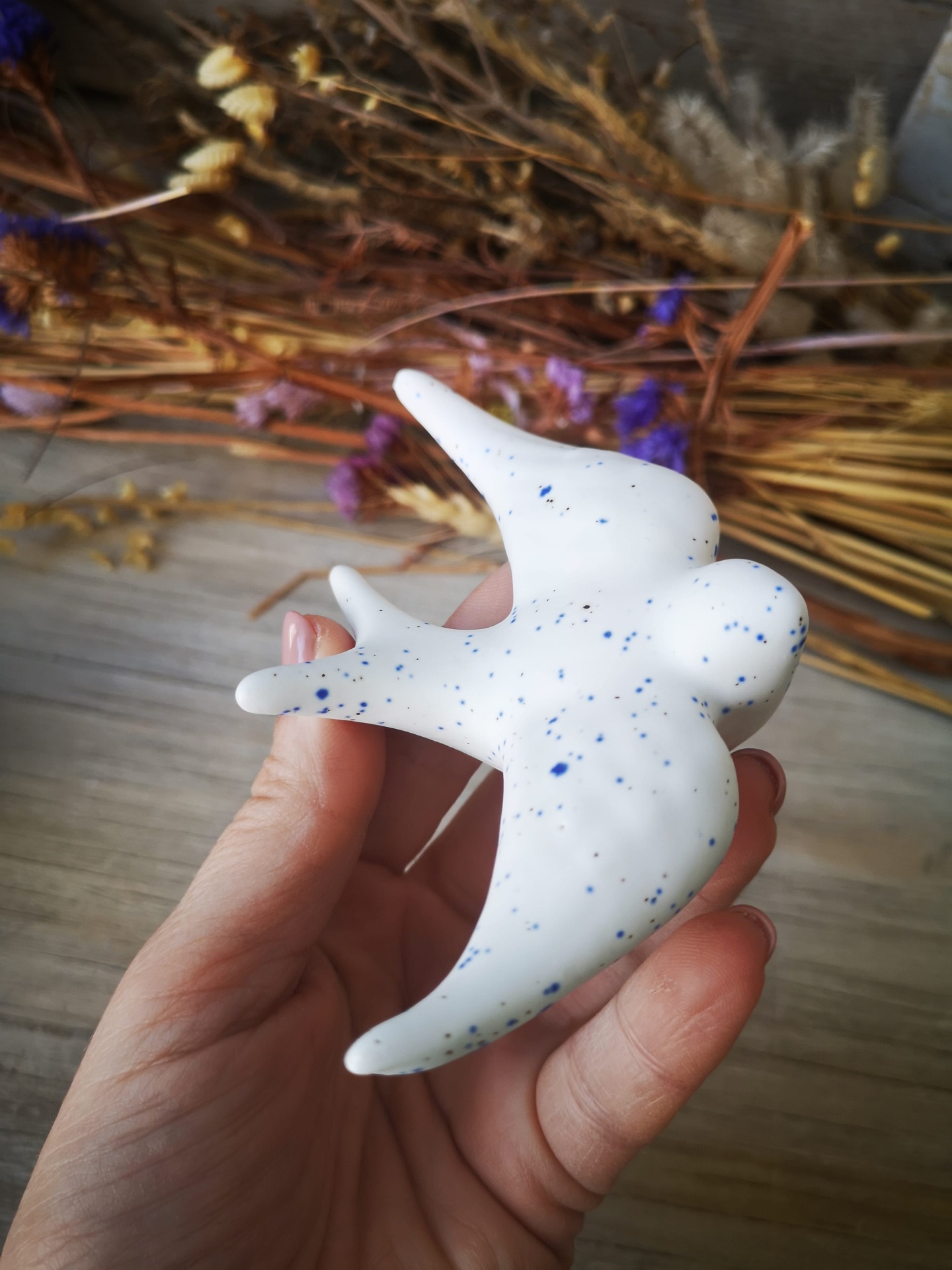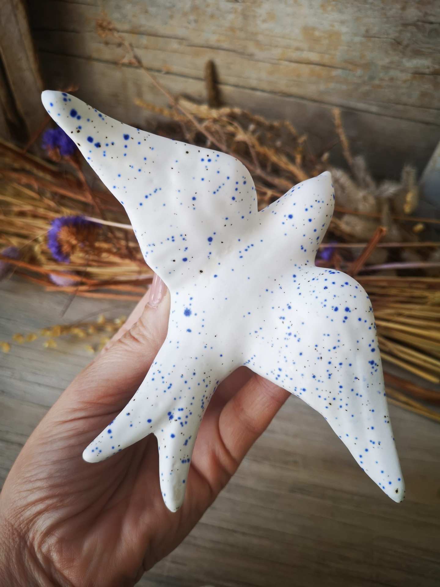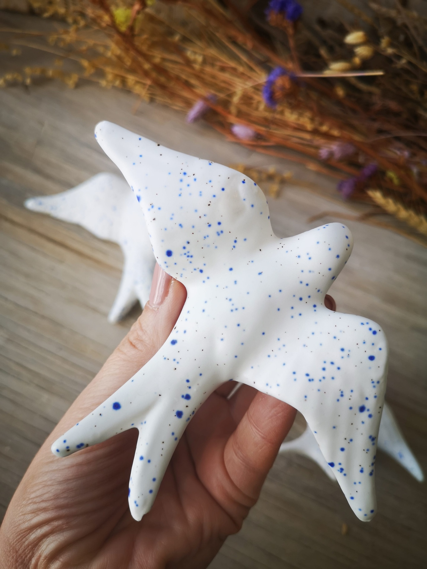 Conjunto de 3 andorinhas em cerâmica, cor branco pintas azuis.