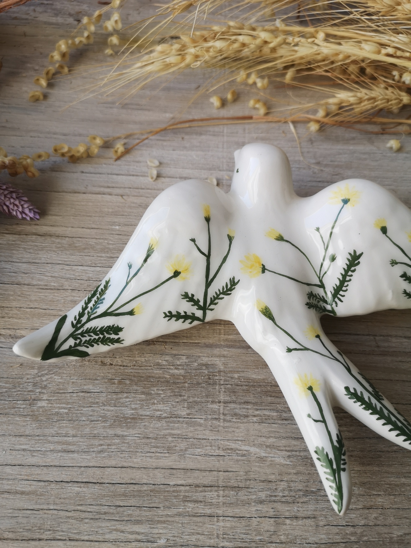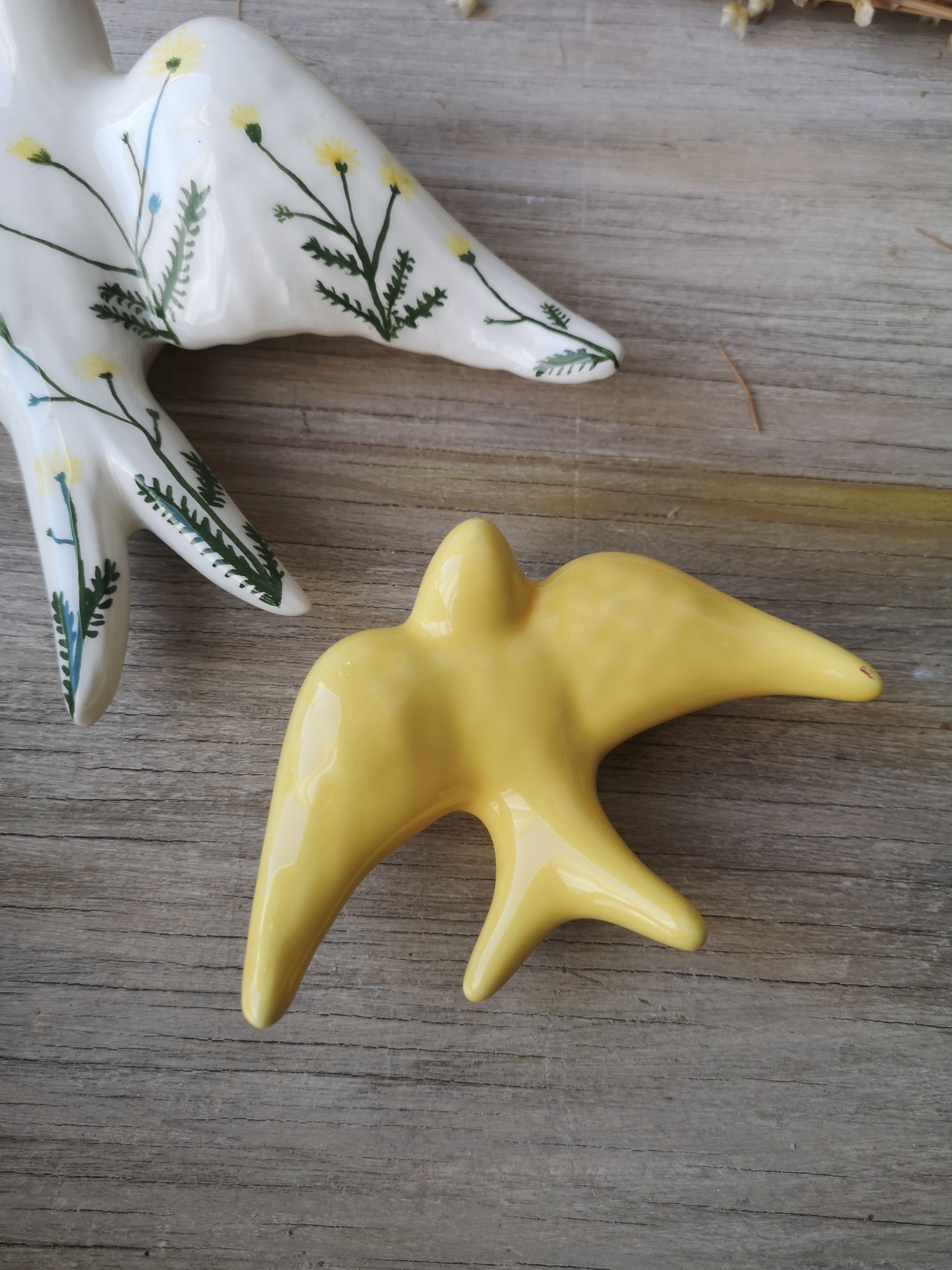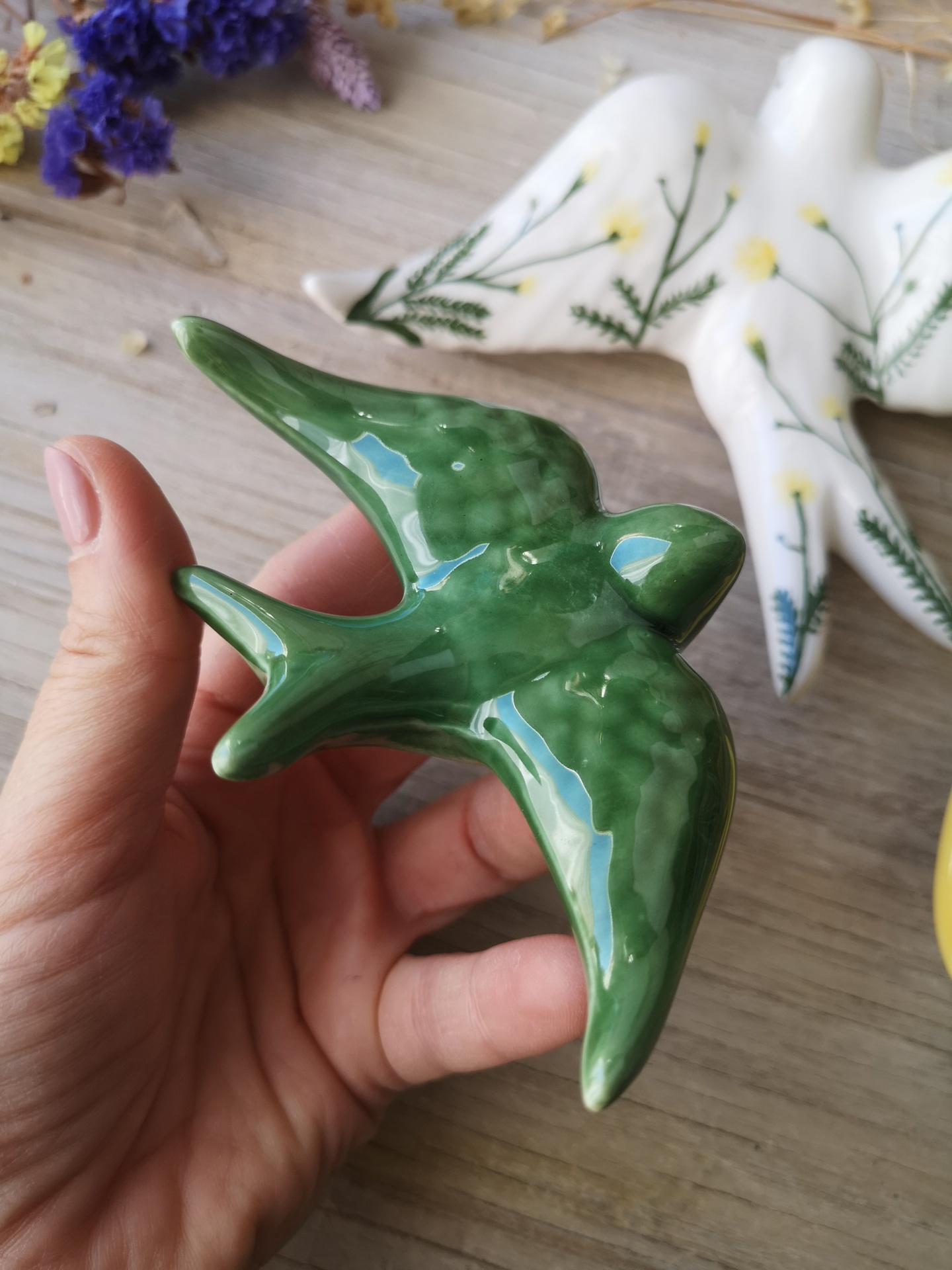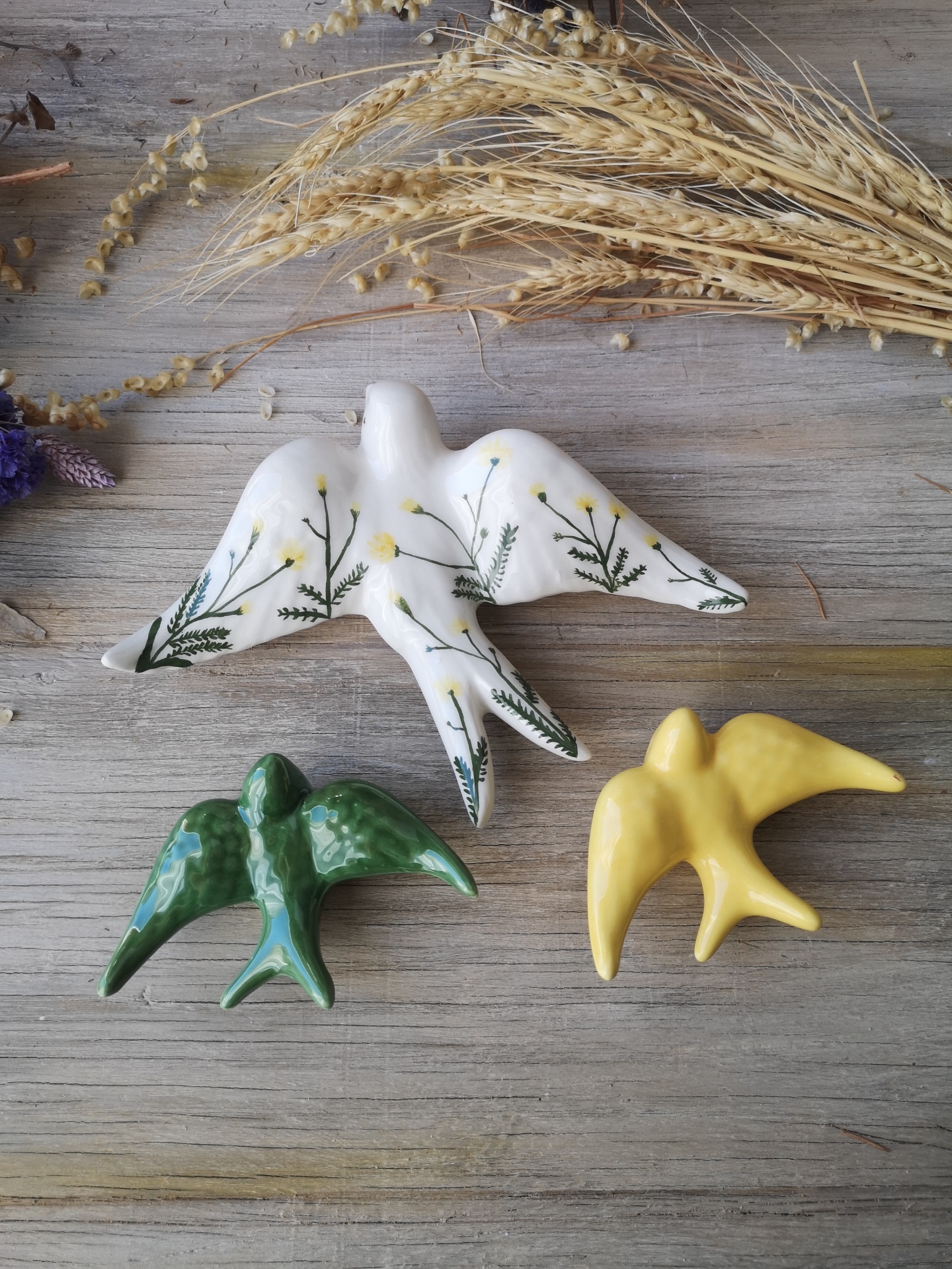 Conjunto de 3 andorinhas em cerâmica, Tamanho L padrão floral , Tamanho XS Verde e Tamanho XS Amarelo