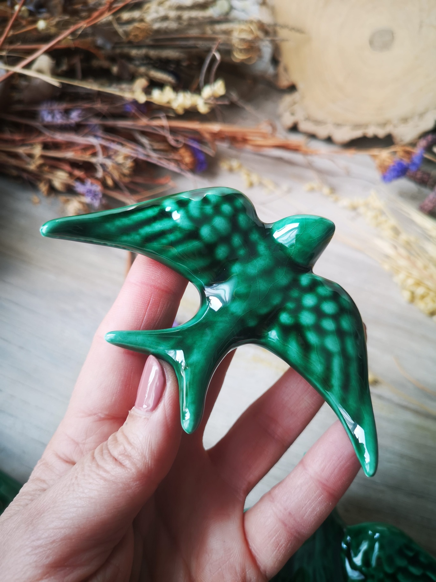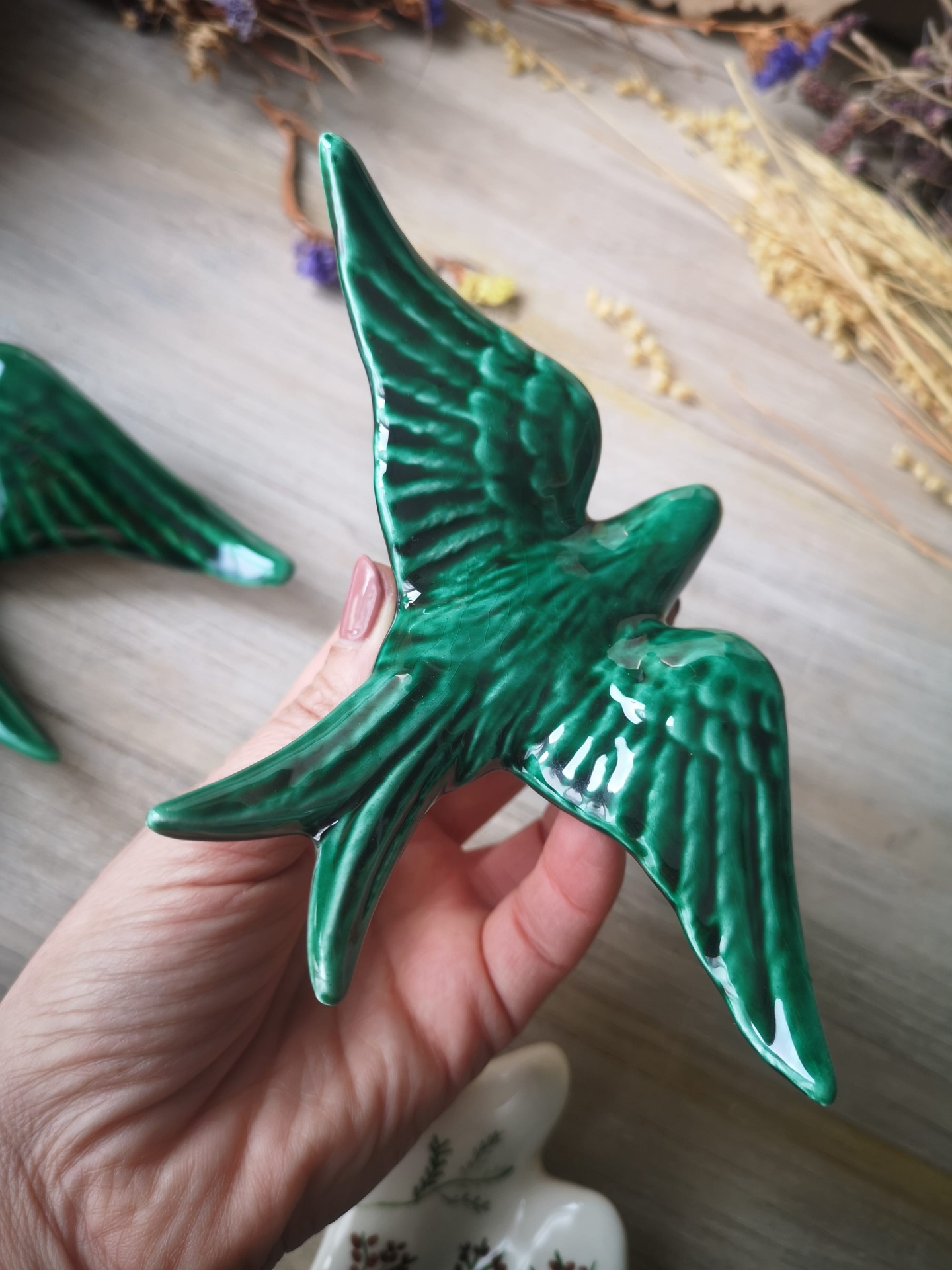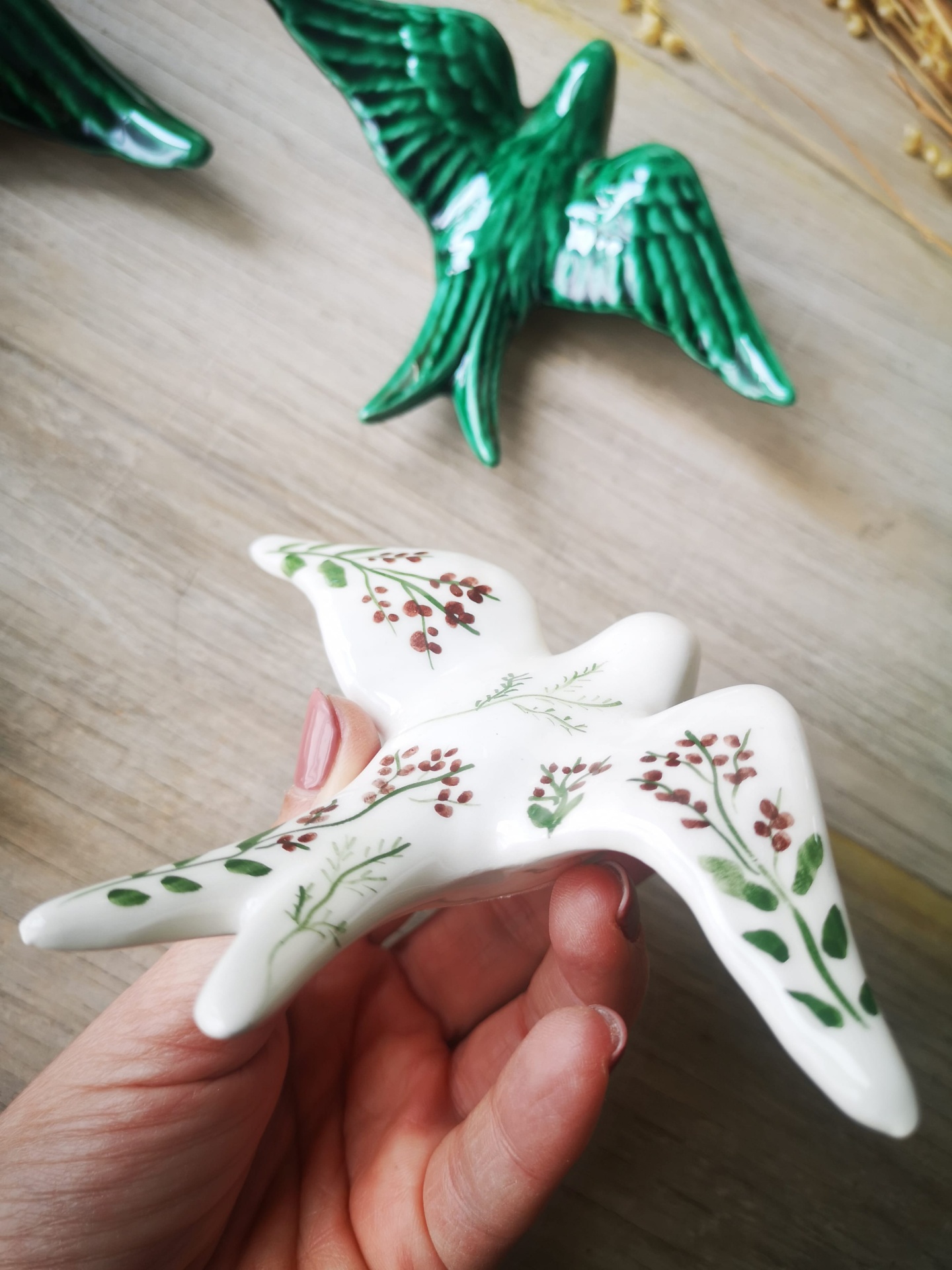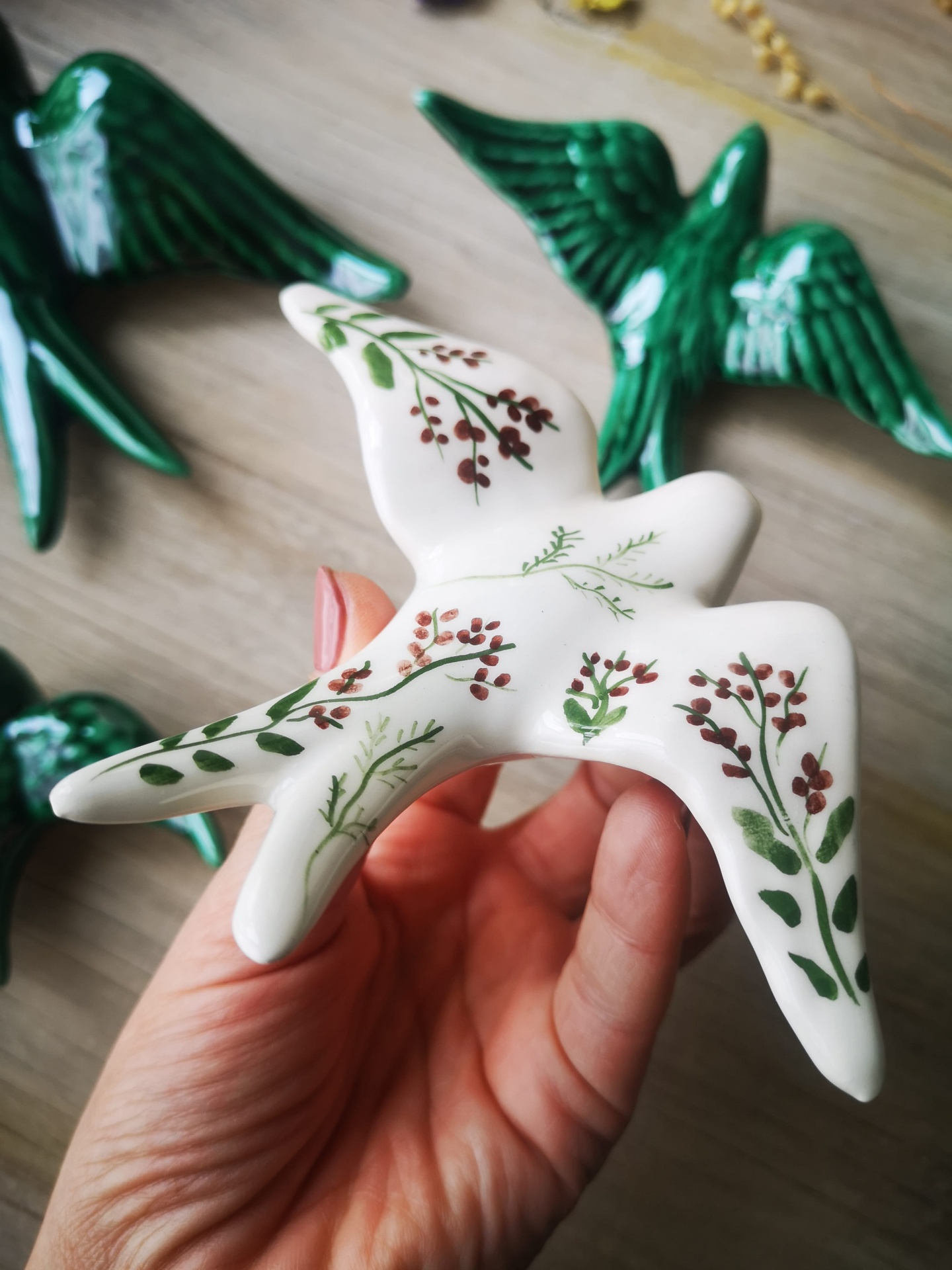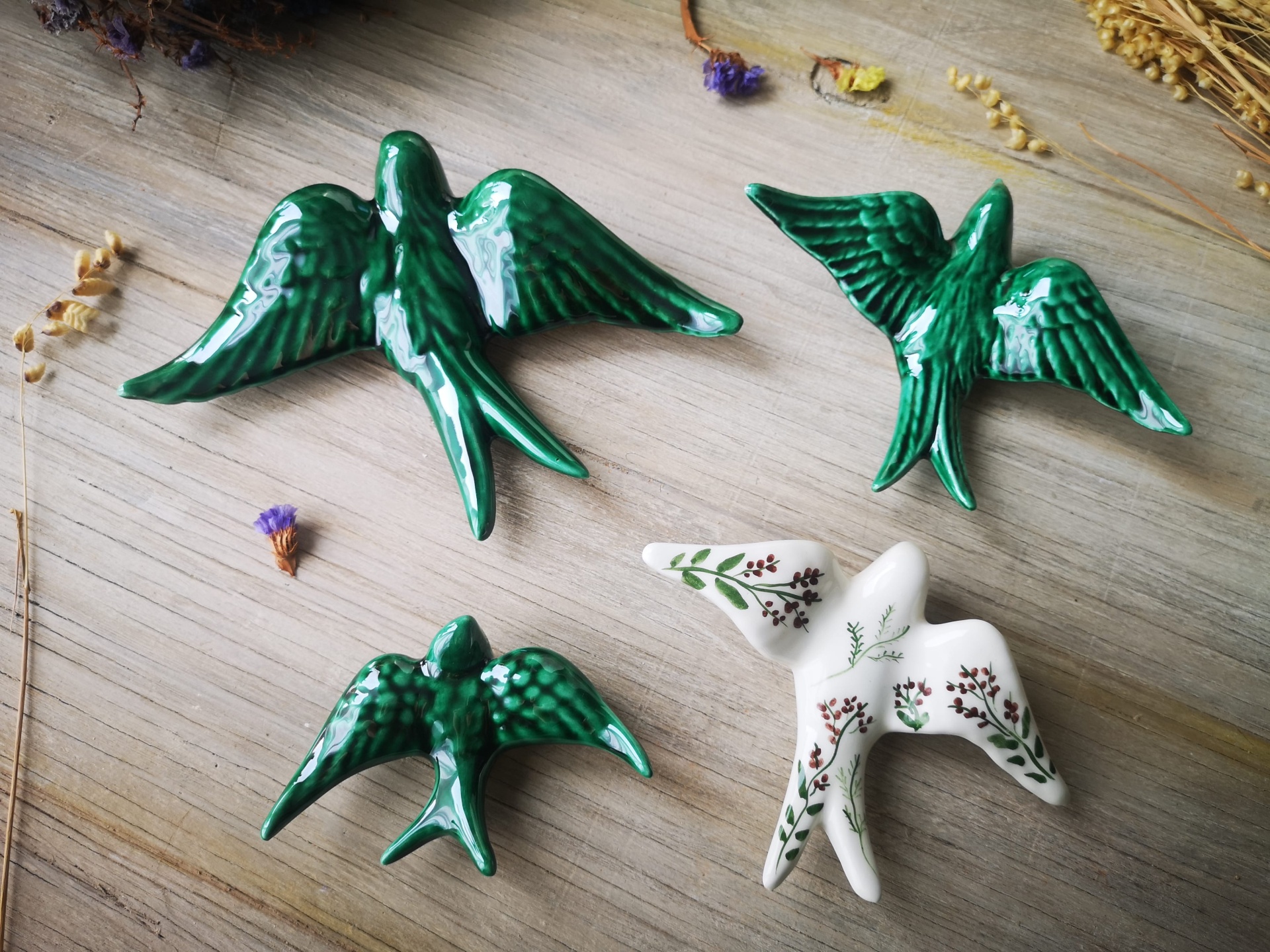 Conjunto de 4 andorinhas em cerâmica, Tamanho L Verde Caldas , Tamanho M Verde Caldas, Tamanho S padrão floral e Tamanho XS Verde Caldas.