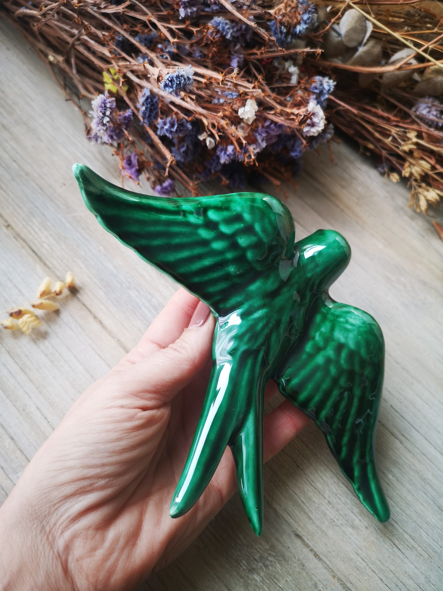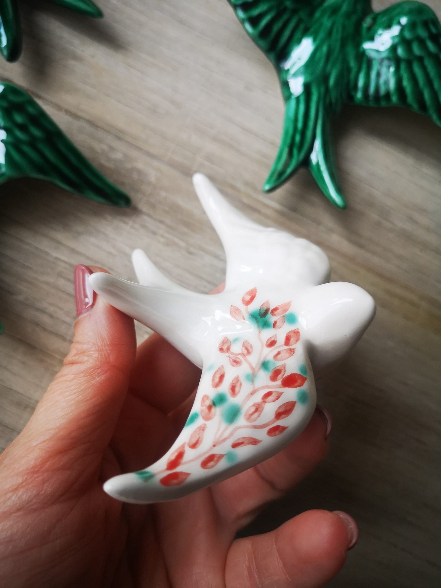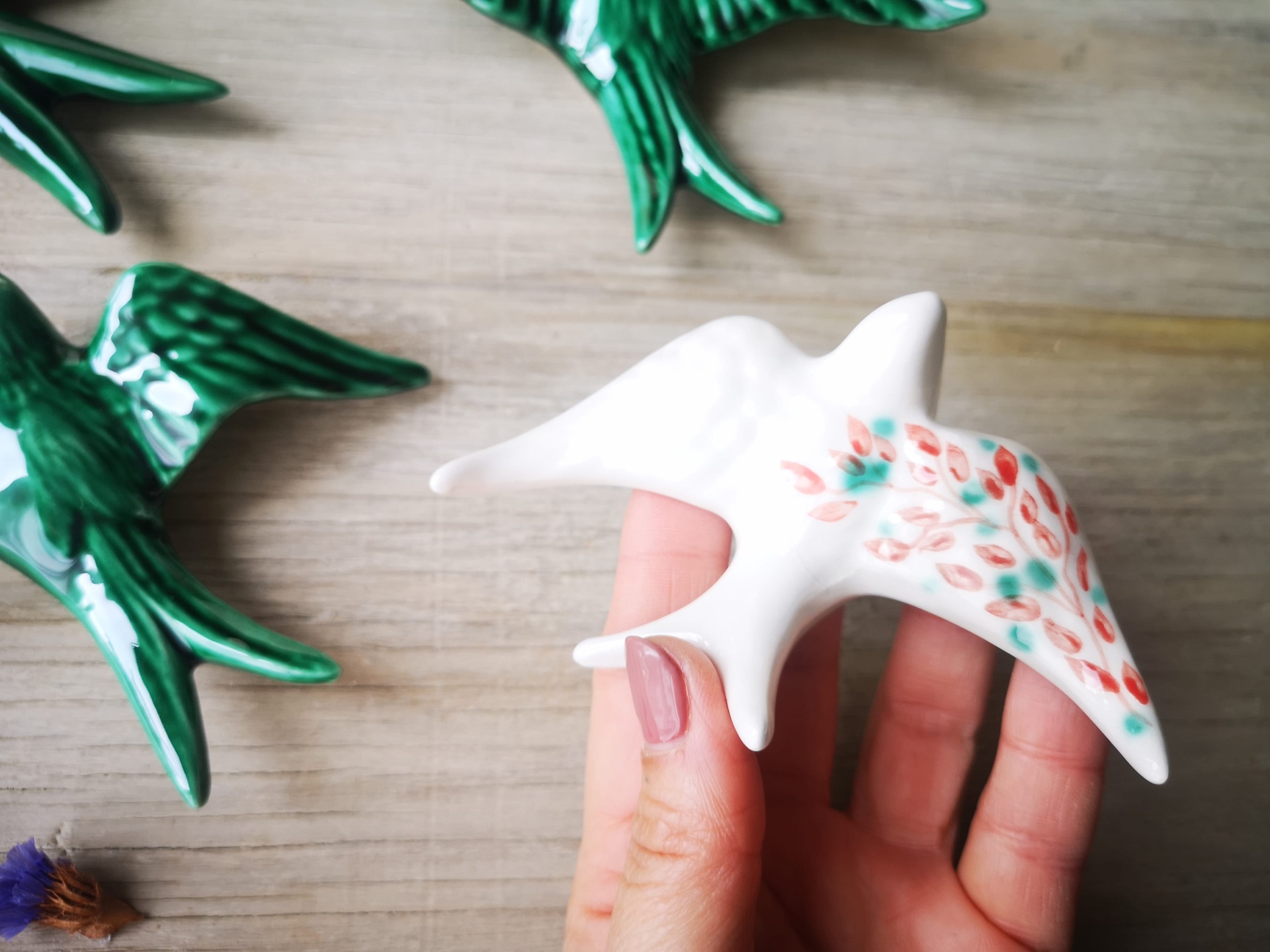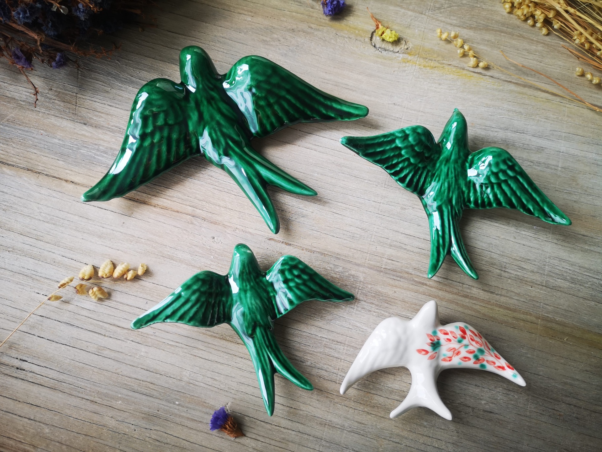 Conjunto de 4 andorinhas em cerâmica, Tamanho L Verde Caldas , Tamanho M Verde Caldas, Tamanho S Verde Caldas e Tamanho XS padrão floral.
