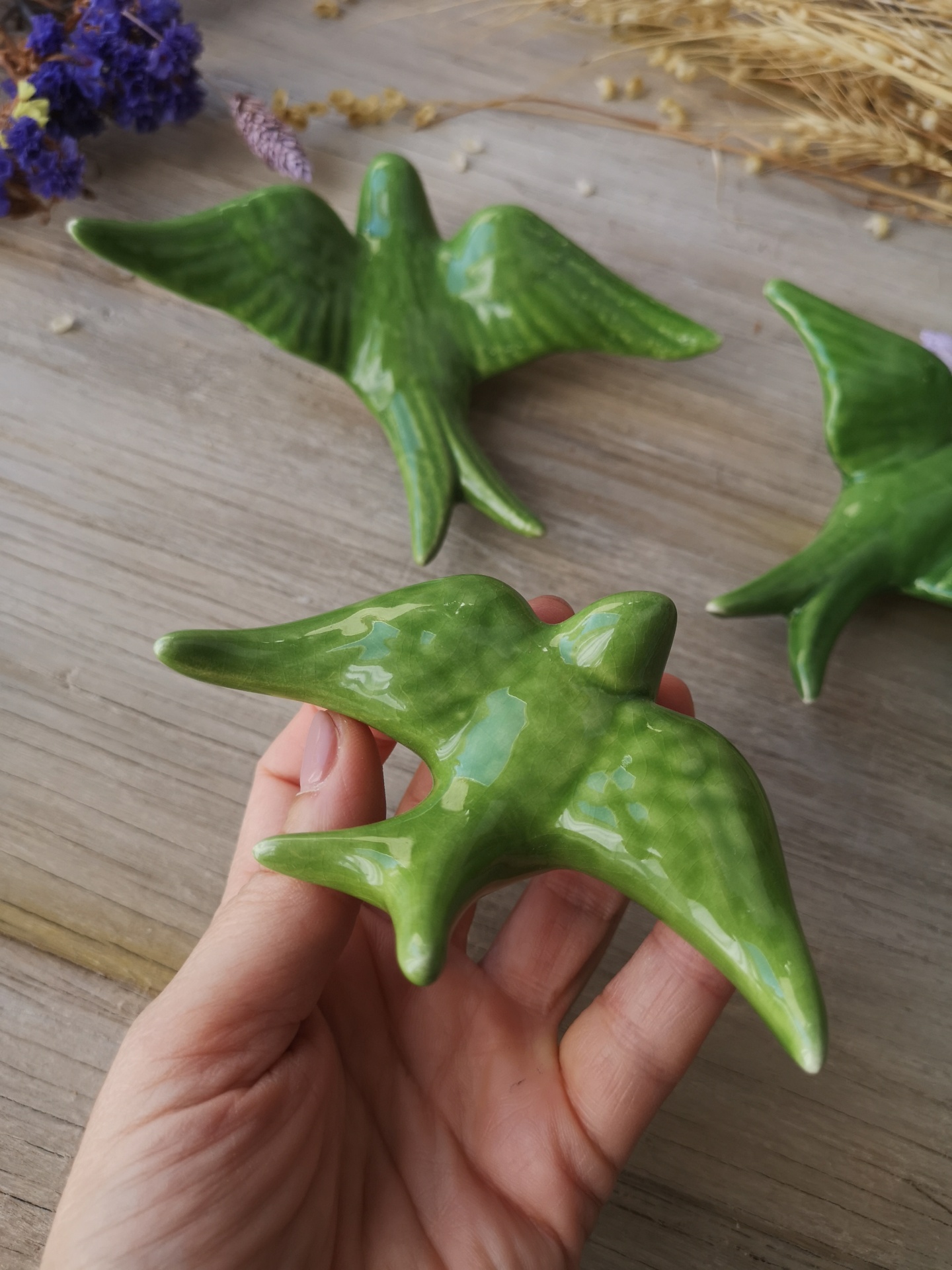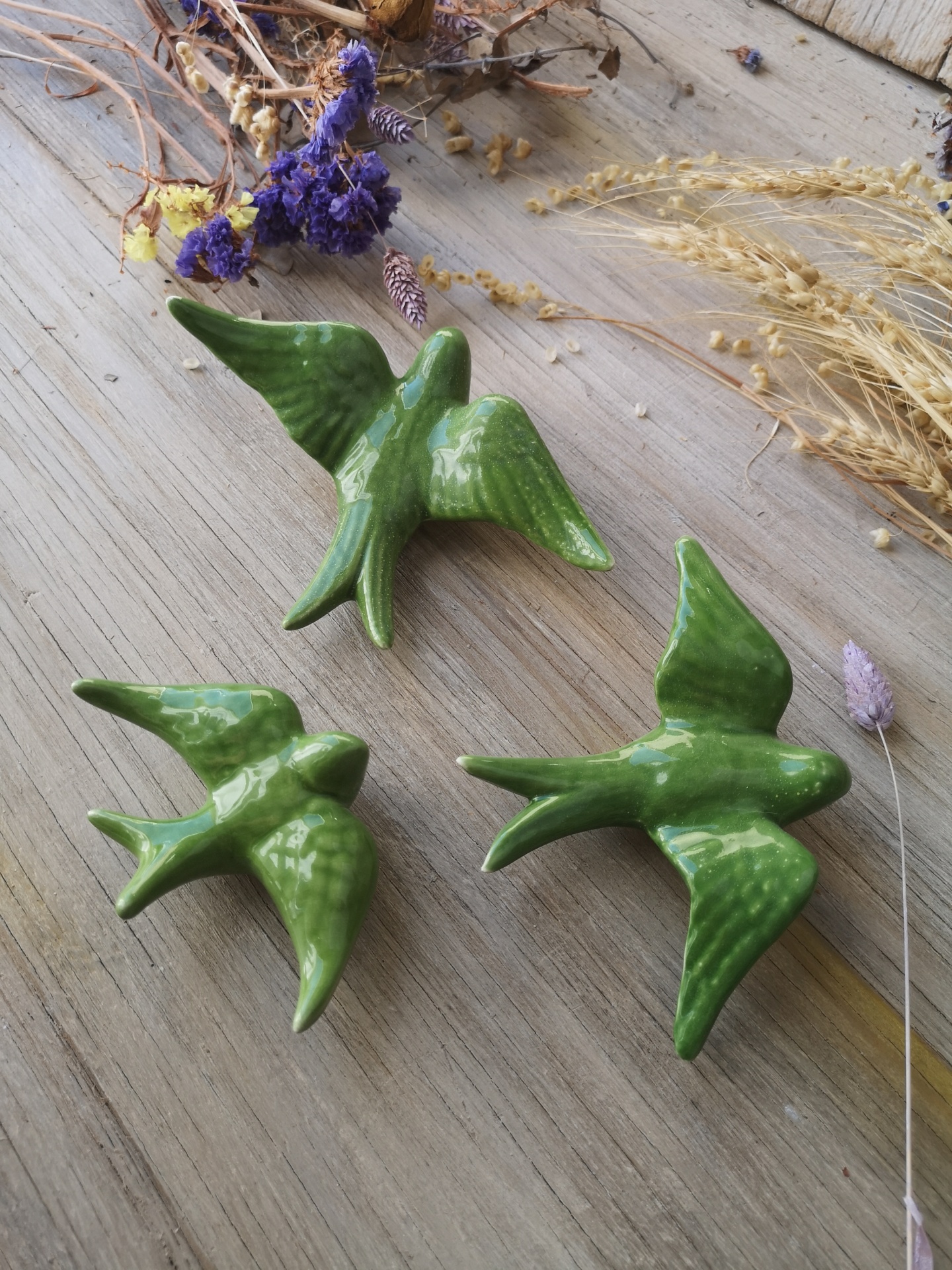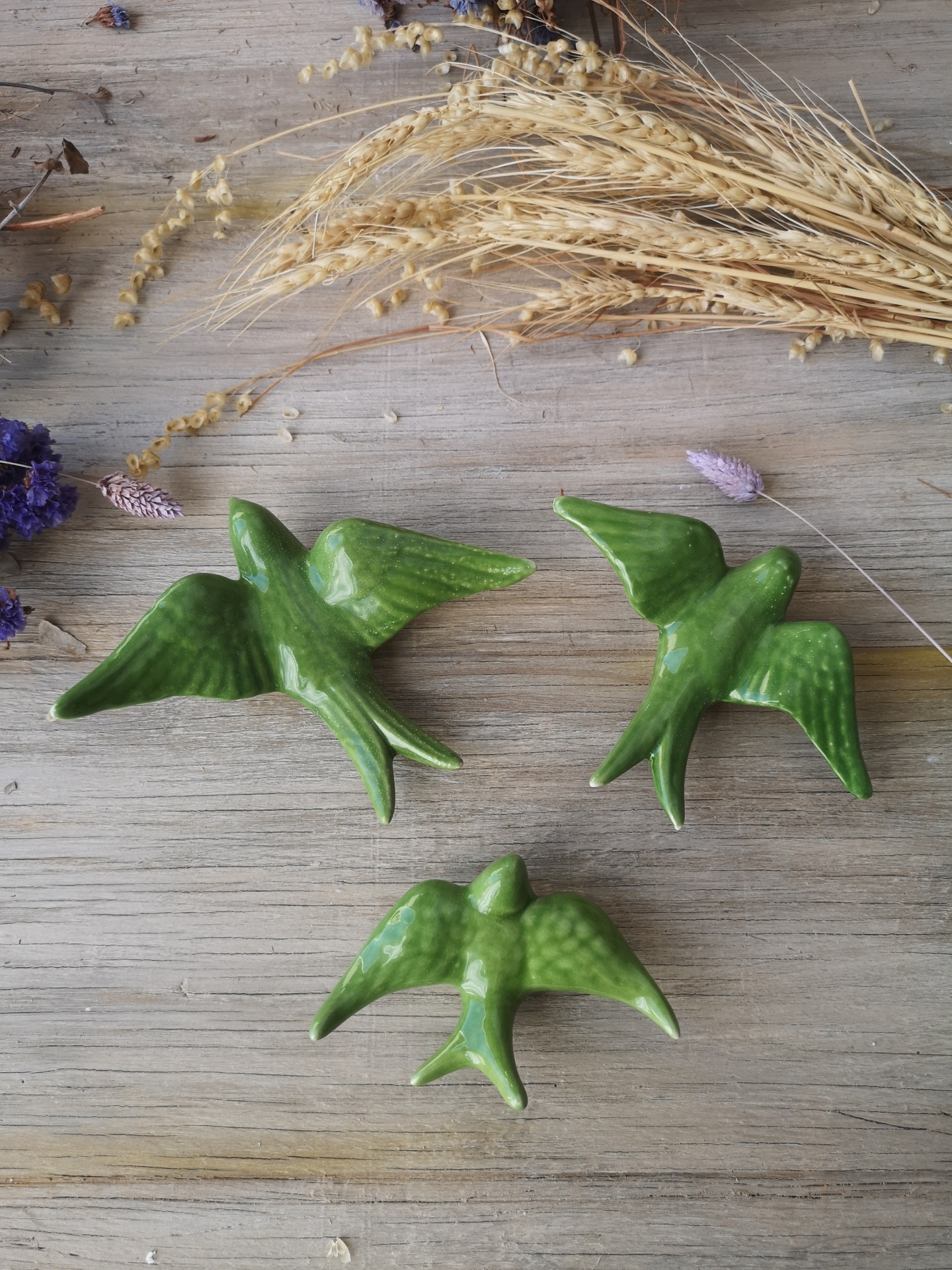 Conjunto de 3 andorinhas em cerâmica, cor verde.
