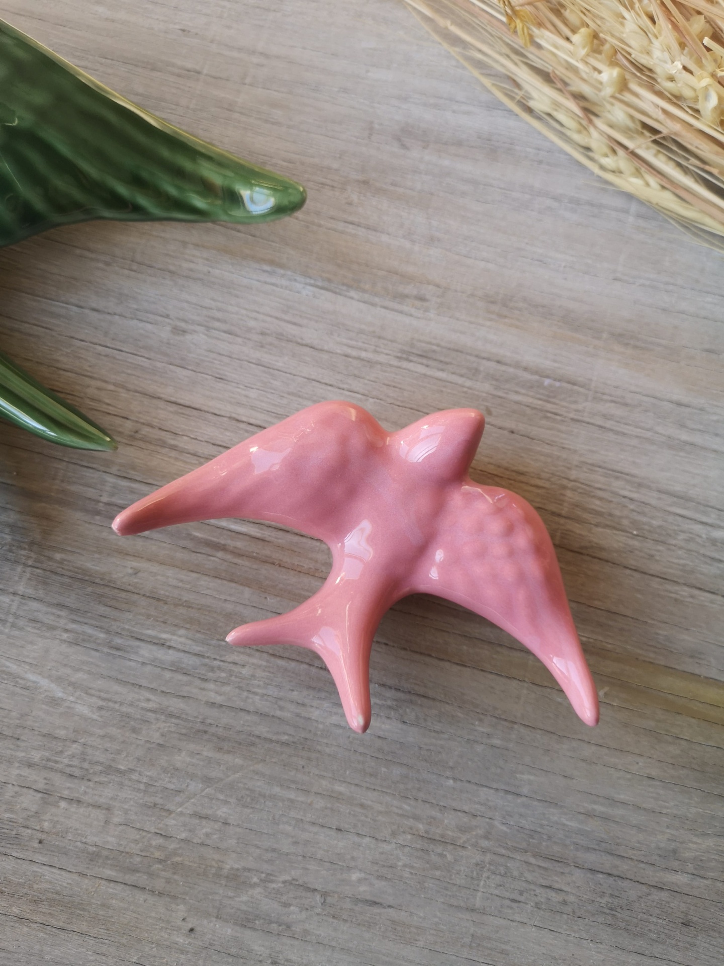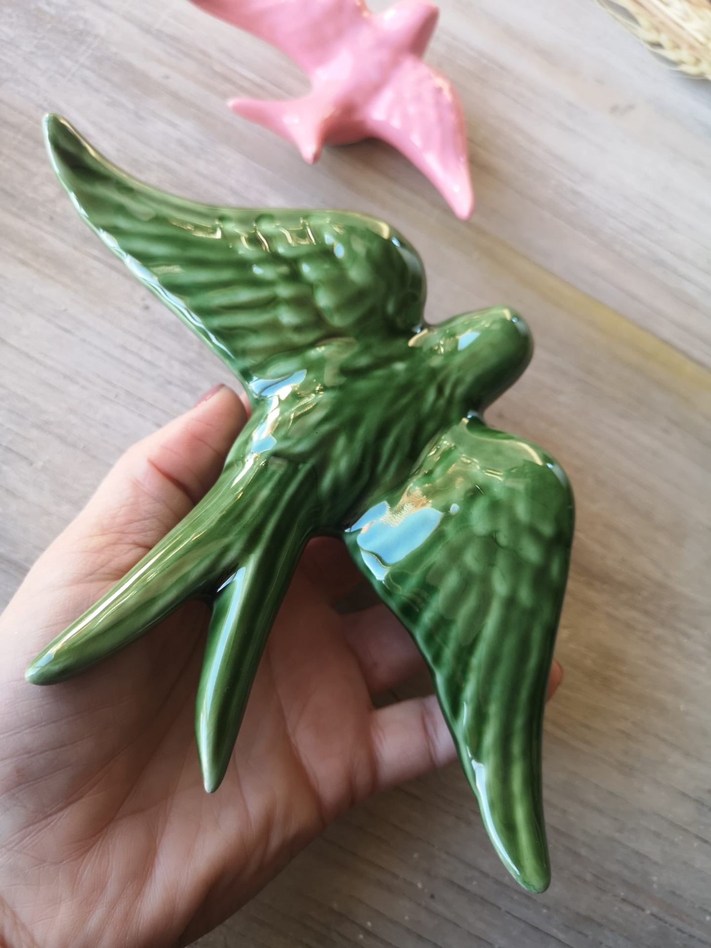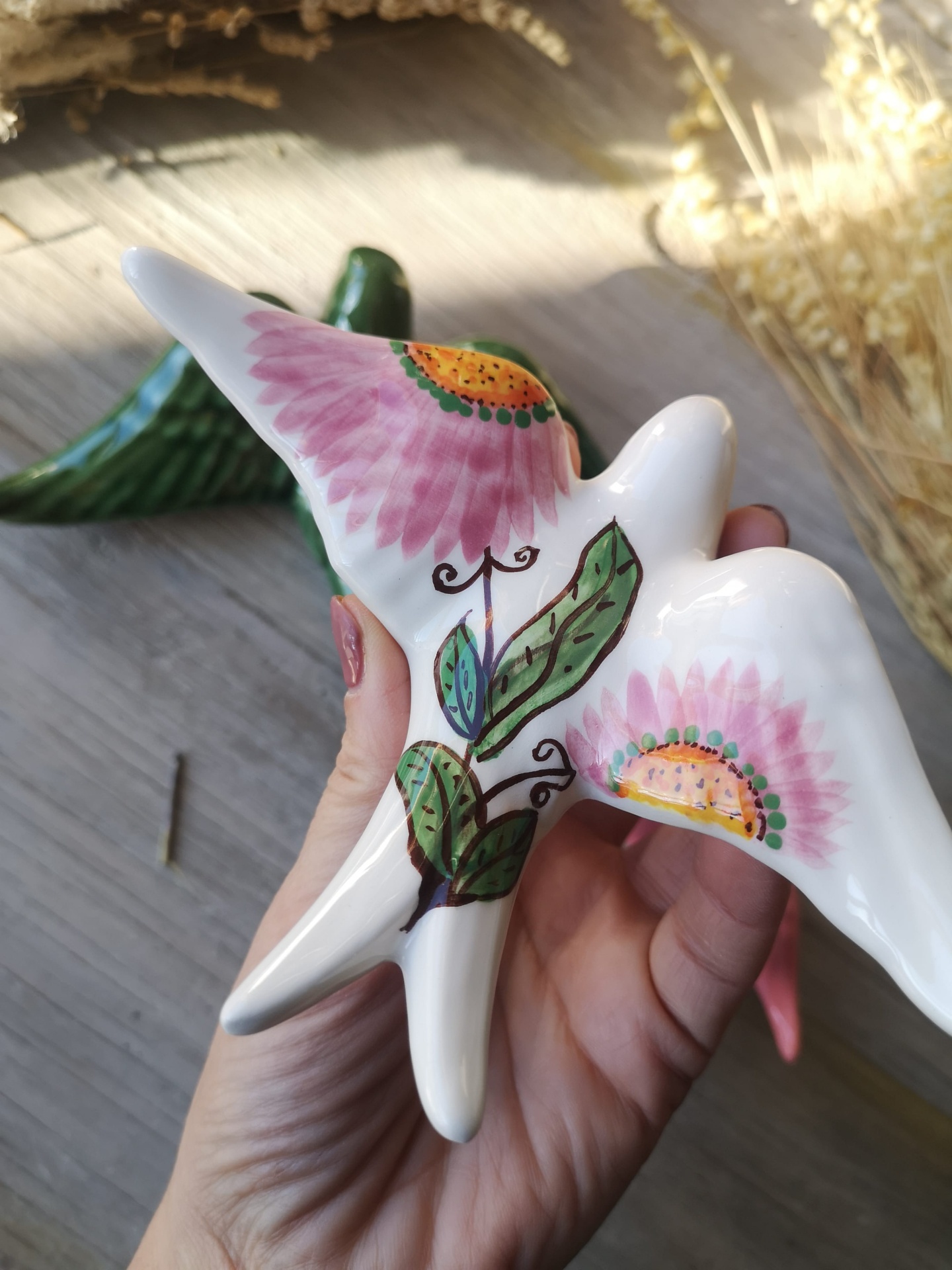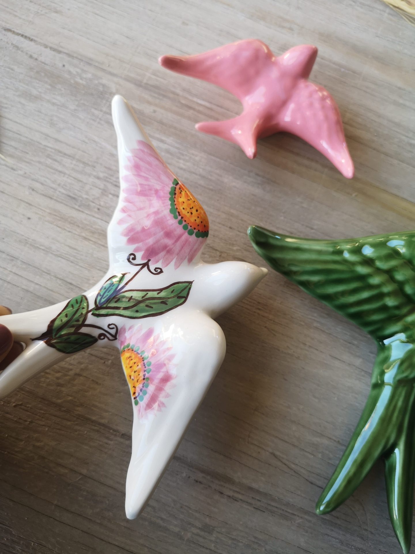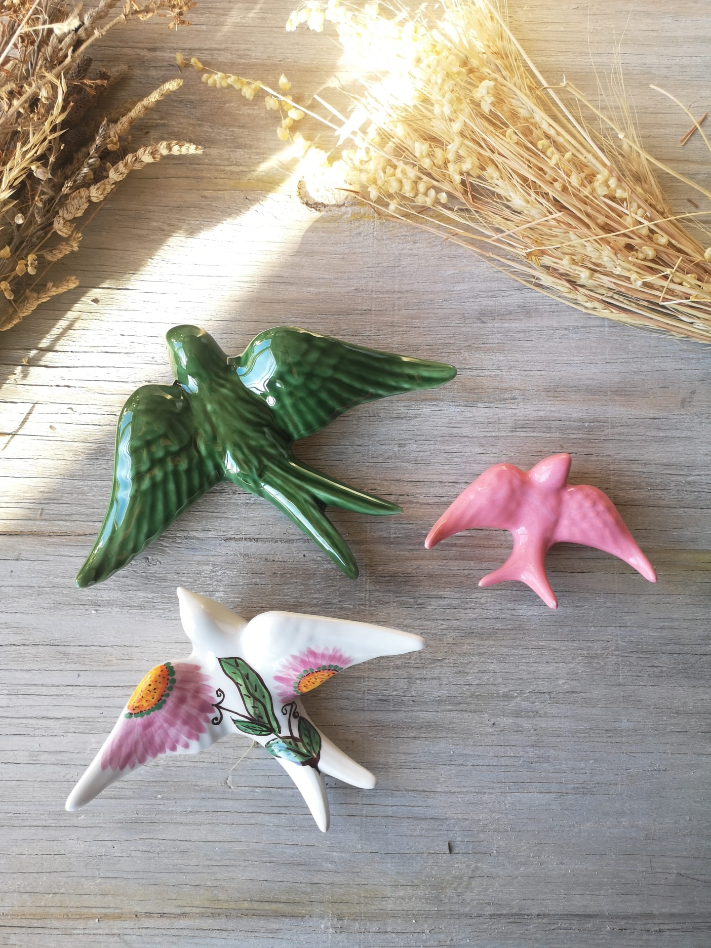 Conjunto de 3 andorinhas em cerâmica com padrão floral, pintadas à mão.