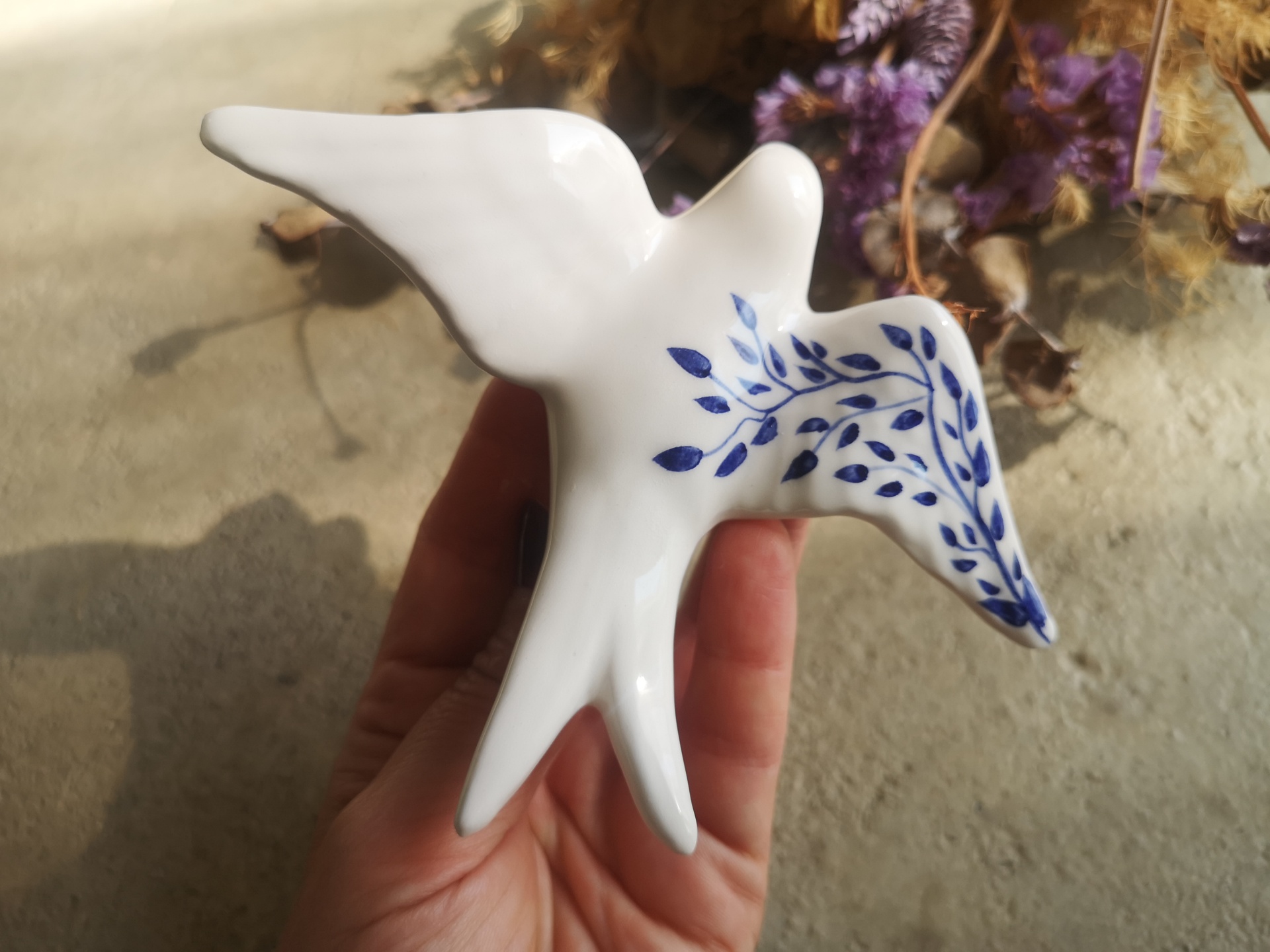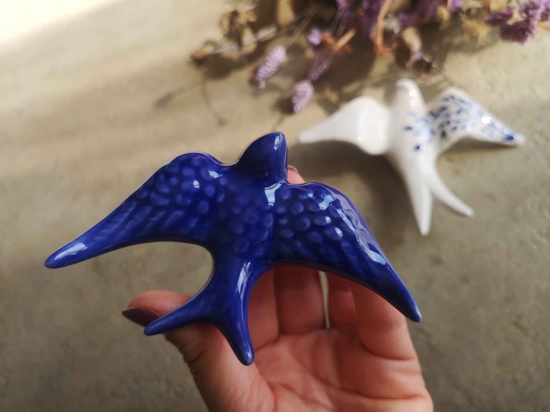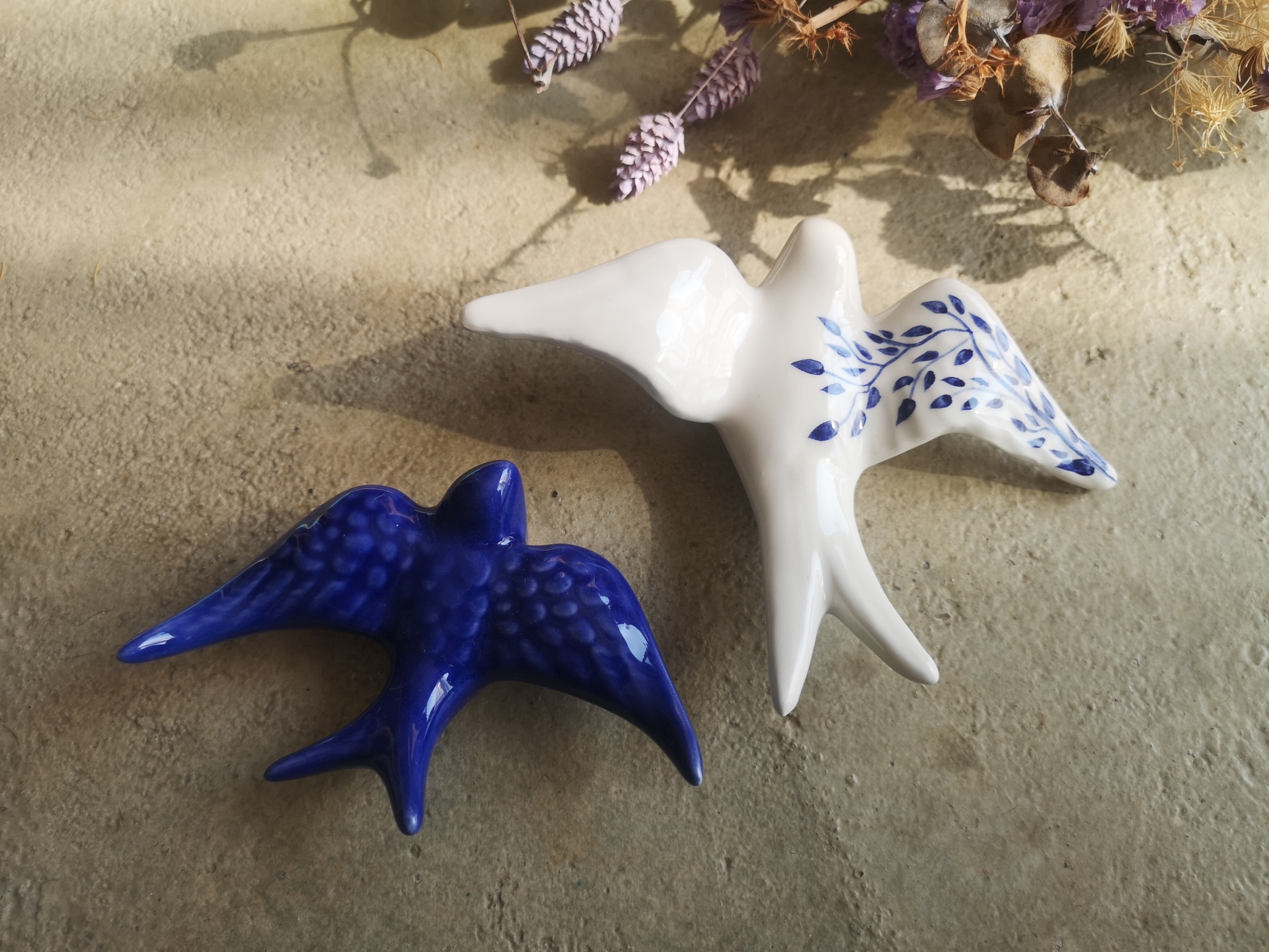 Conjunto de 2 andorinhas em cerâmica, Tamanho S padrão floral, Tamanho XS azul cobalto.