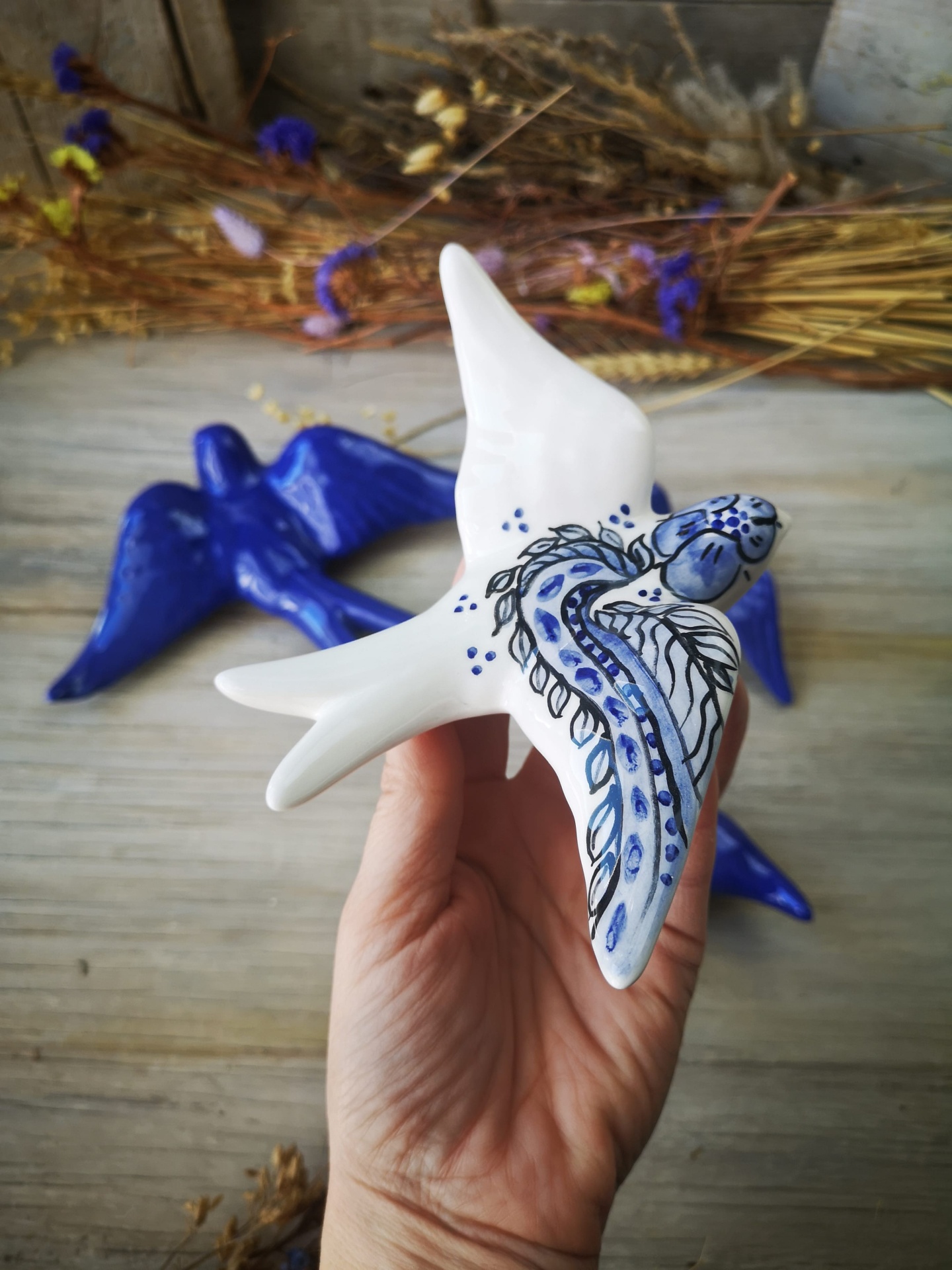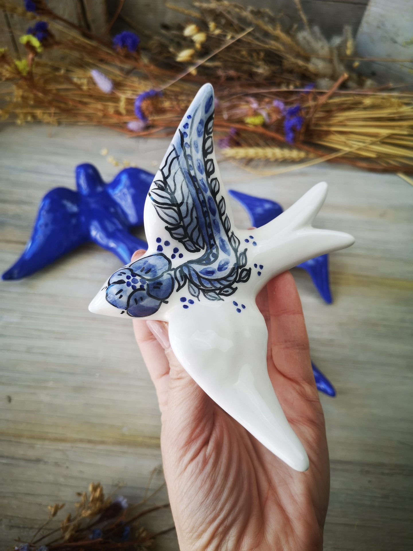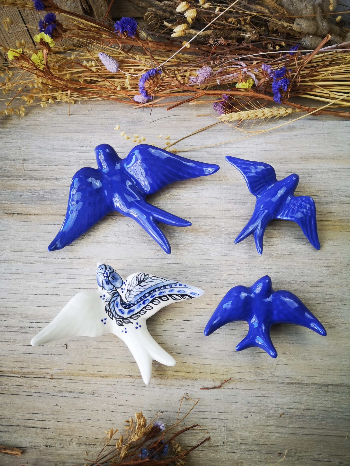 Conjunto de 4 andorinhas em cerâmica, pintadas à mão.