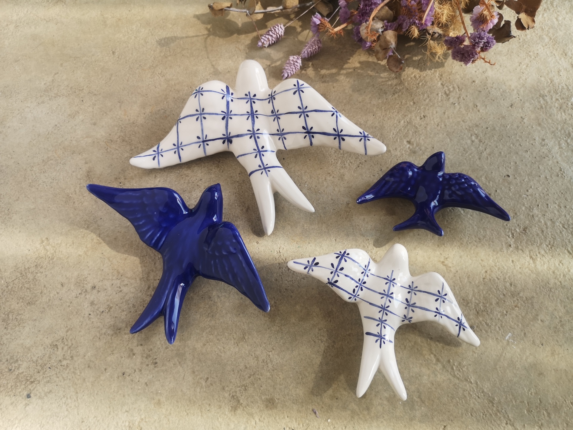 Conjunto de 4 andorinhas em cerâmica, Tamanho L padrão tradicional, Tamanho M azul cobalto, Tamanho S padrão tradicional, Tamanho XS azul cobalto.