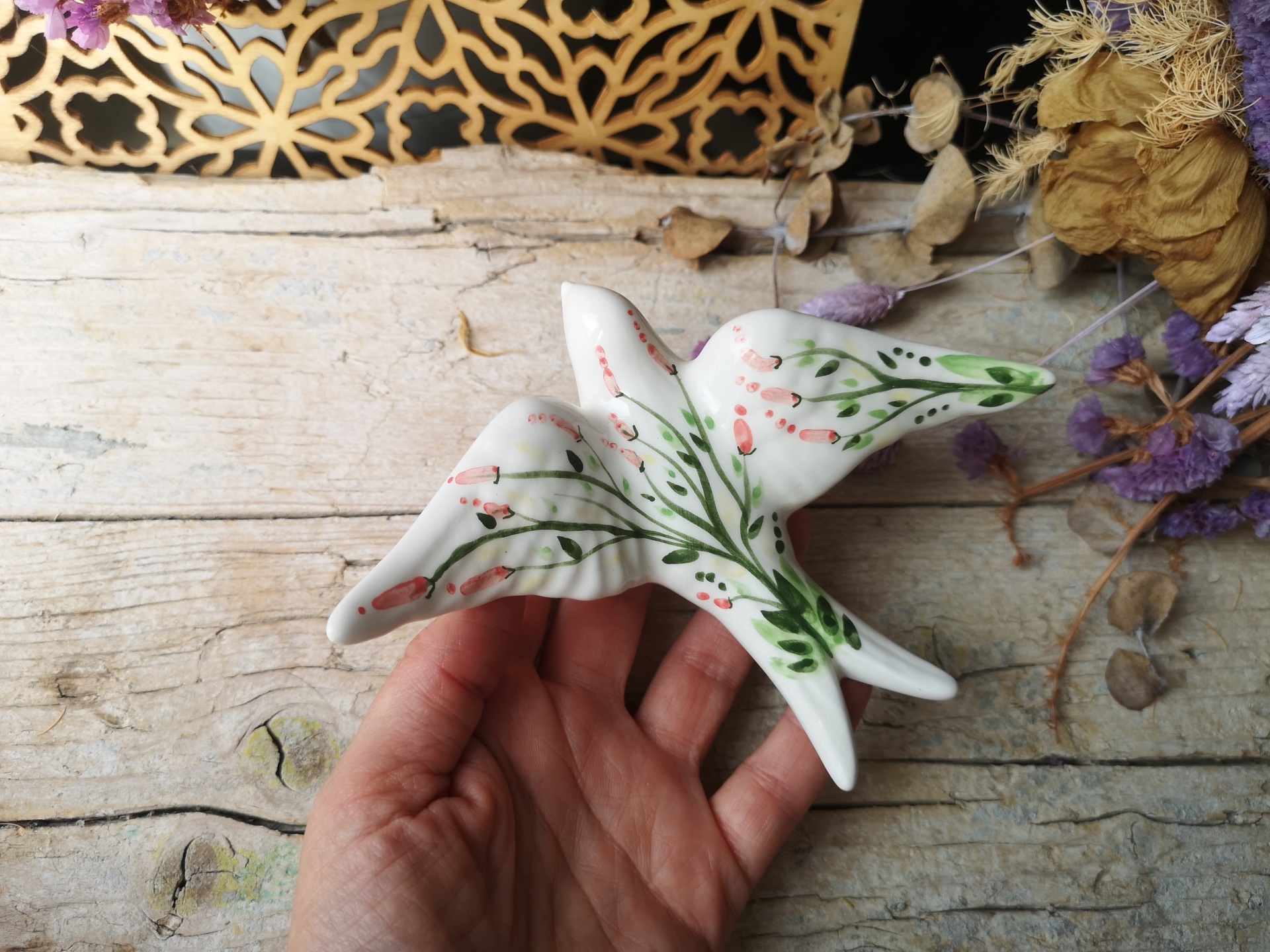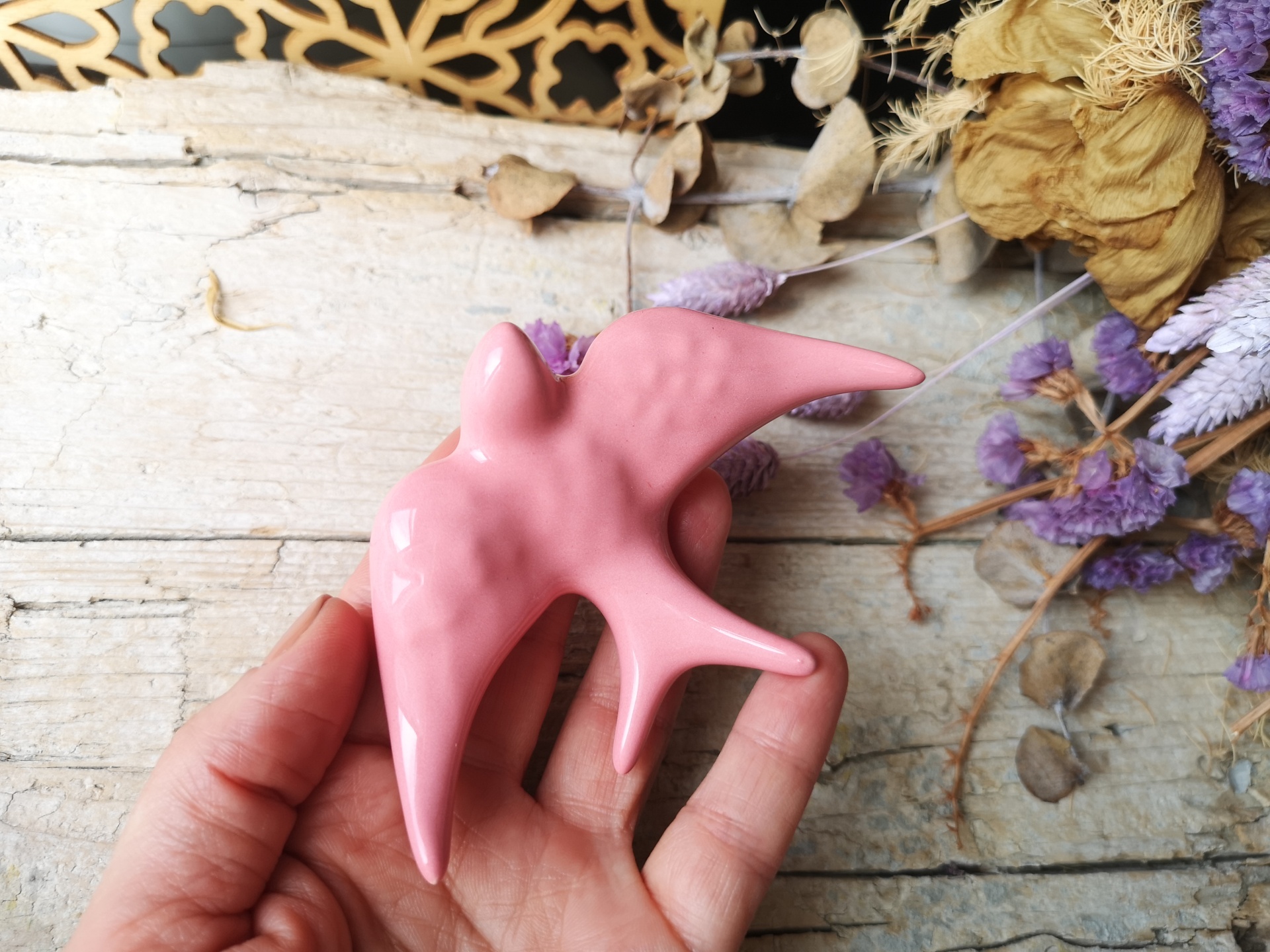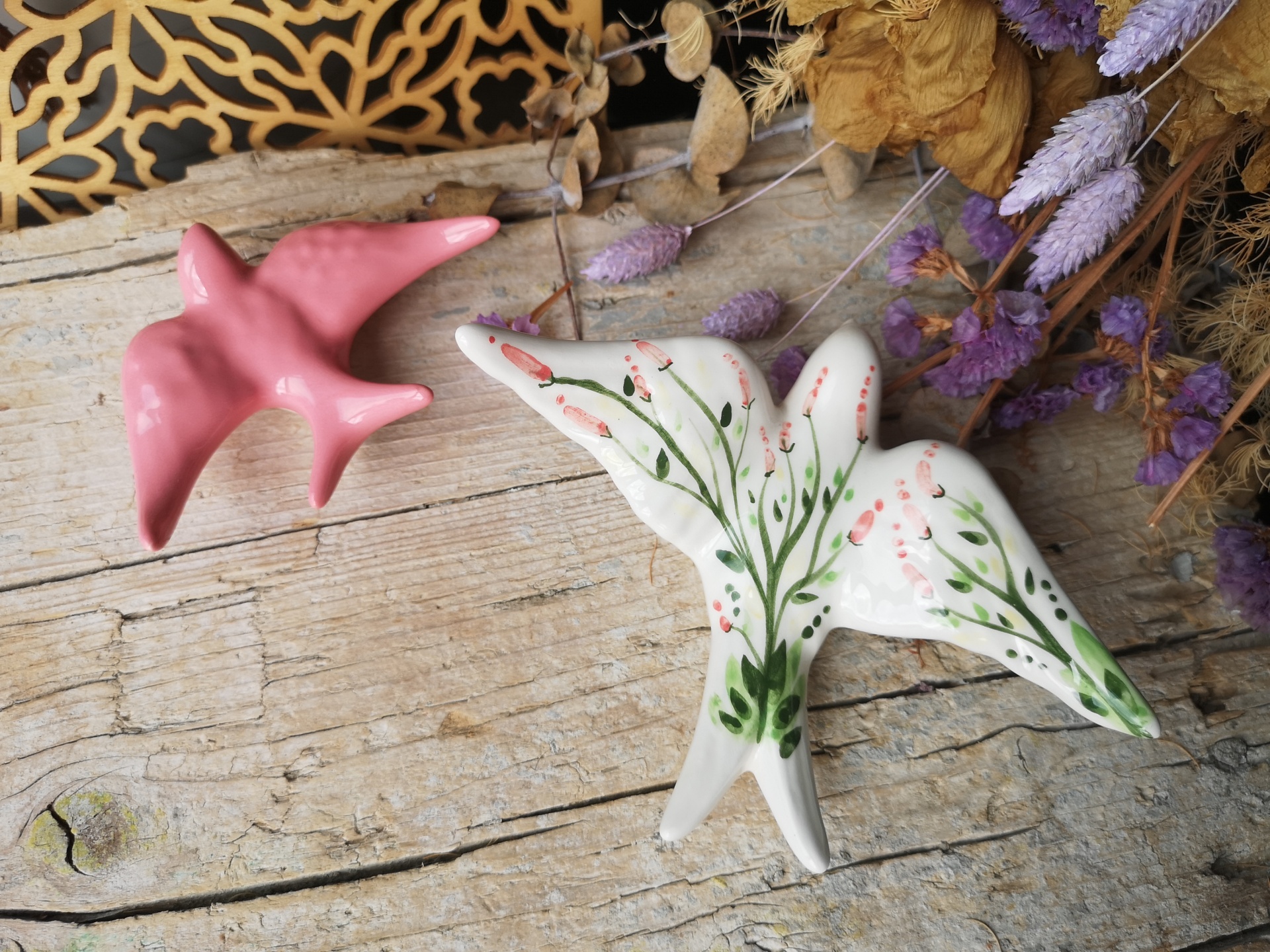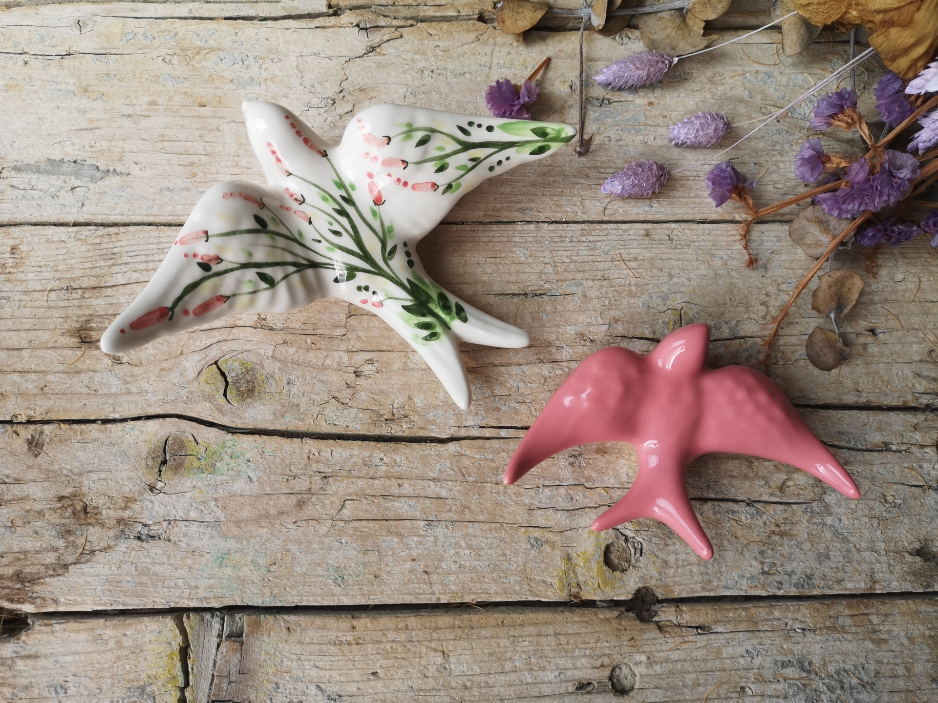 Conjunto de 2 andorinhas em cerâmica, Tamanho M padrão floral, Tamanho XS rosa.