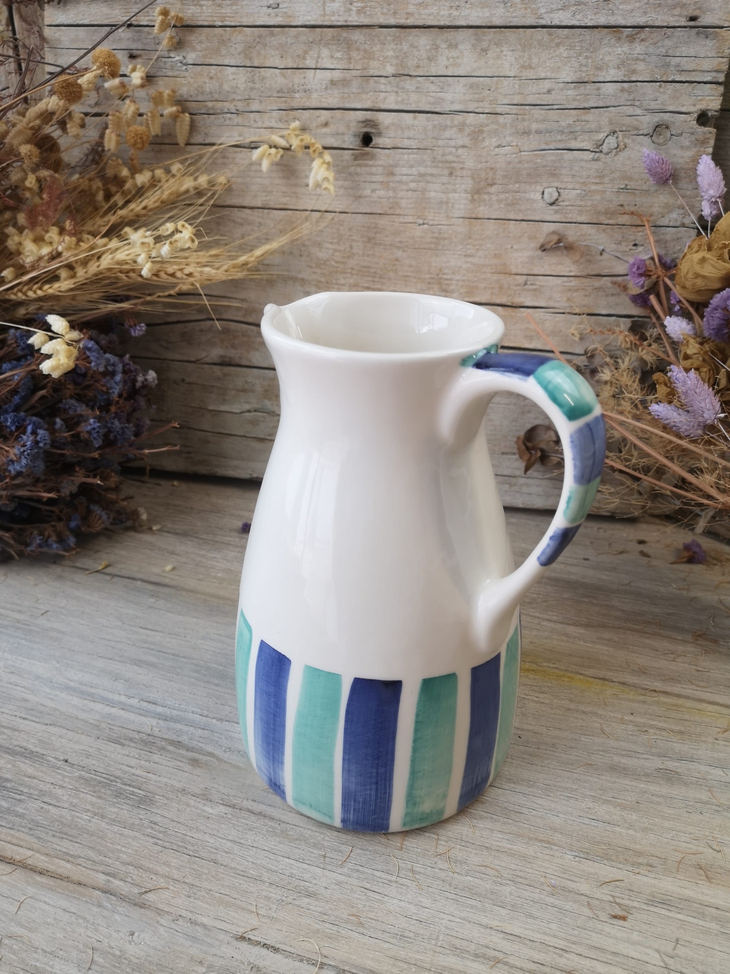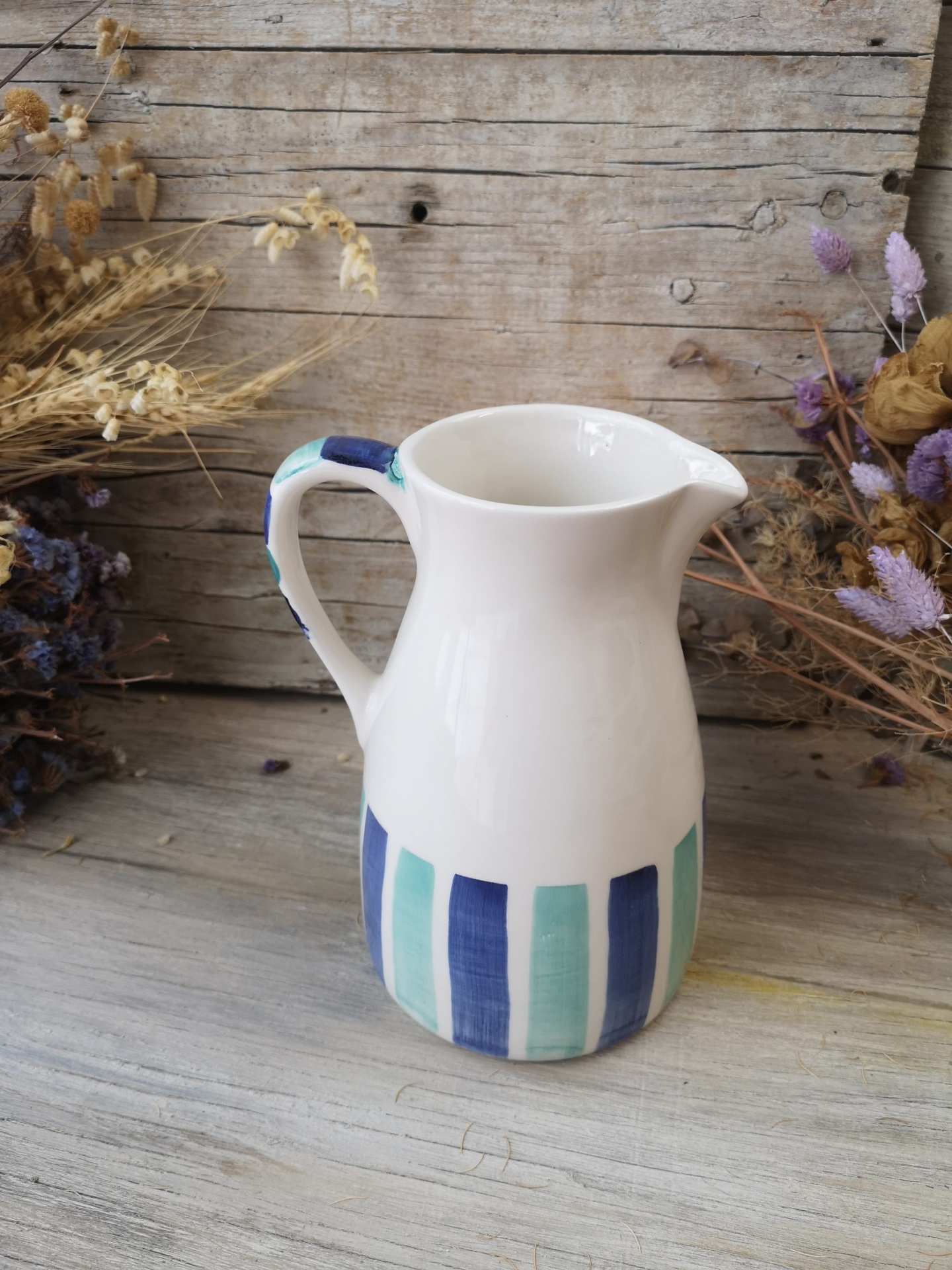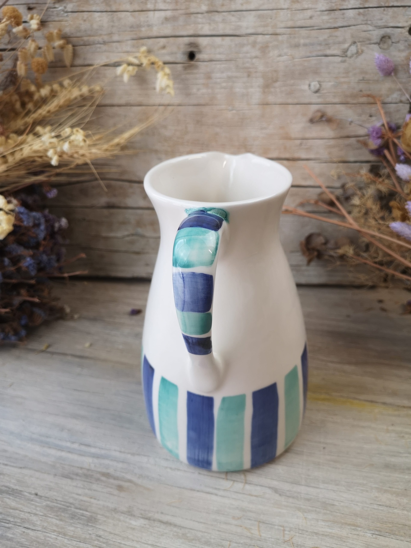 Jarro em cerâmica pintado à mão , padrão de riscas em azul cobalto e verde água.