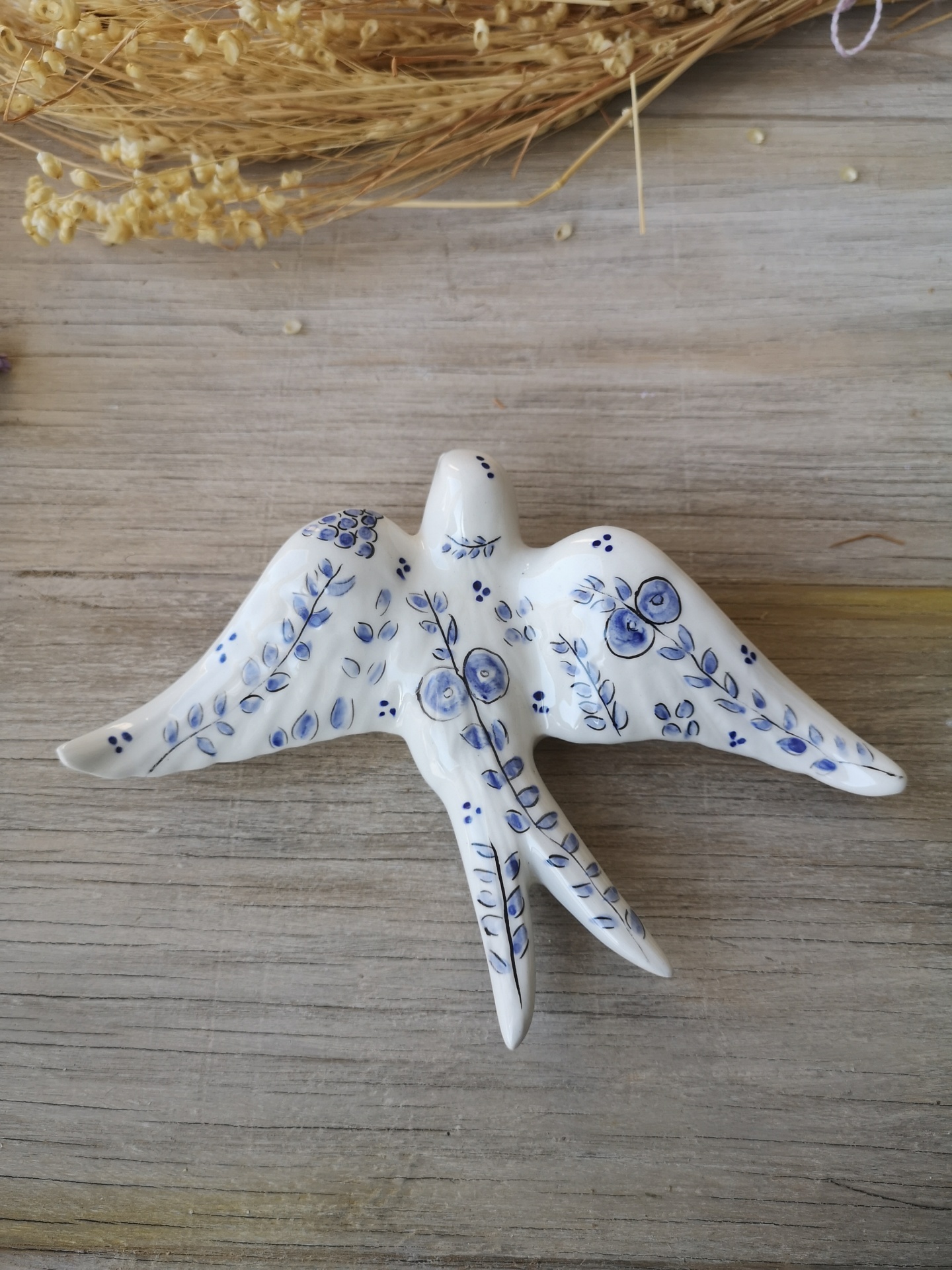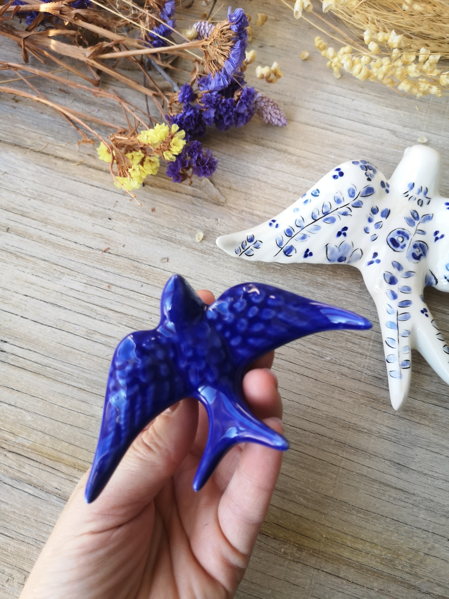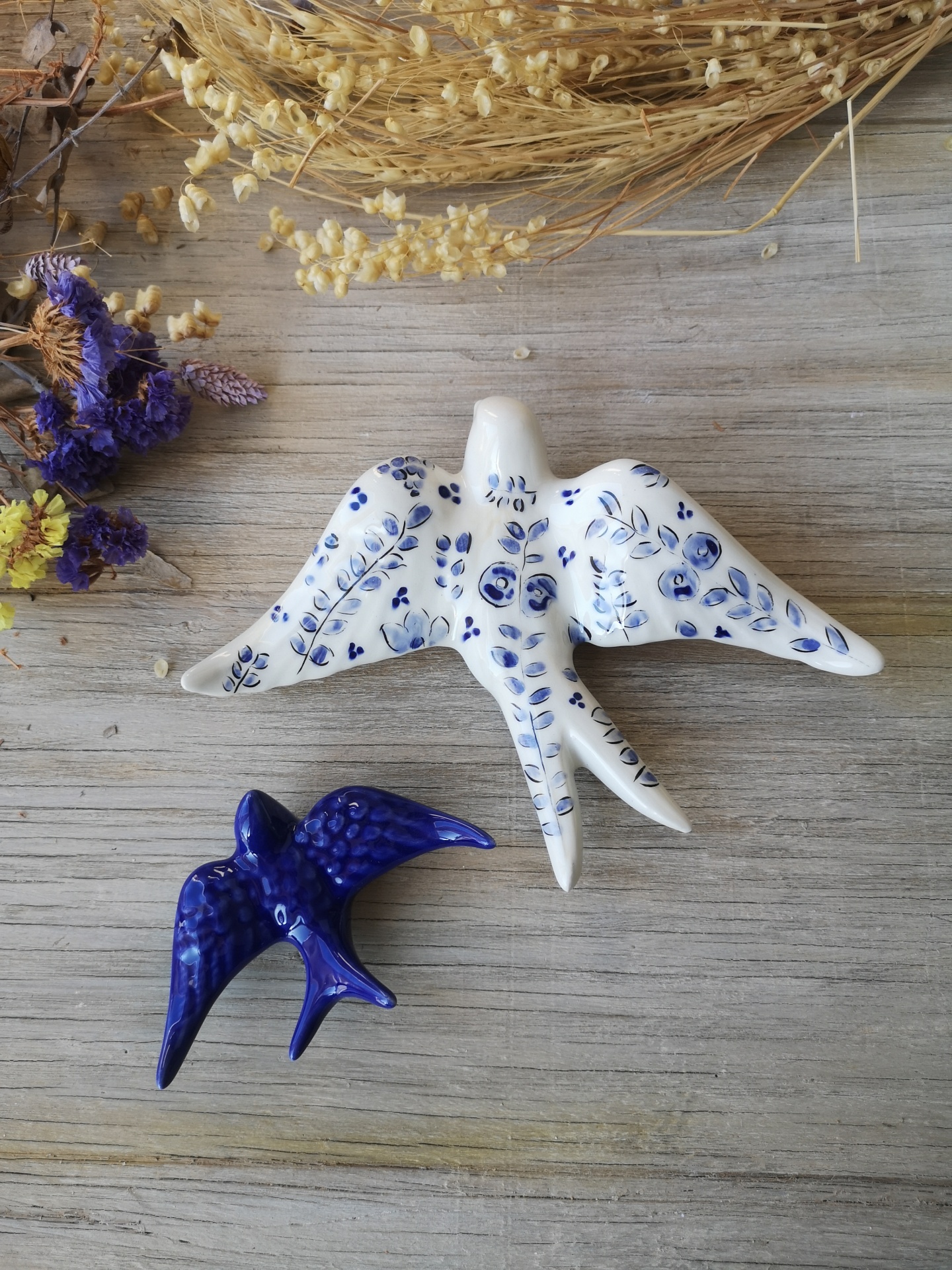 Conjunto de 2 andorinhas em cerâmica, Tamanho L padrão floral , Tamanho XS azul cobalto.