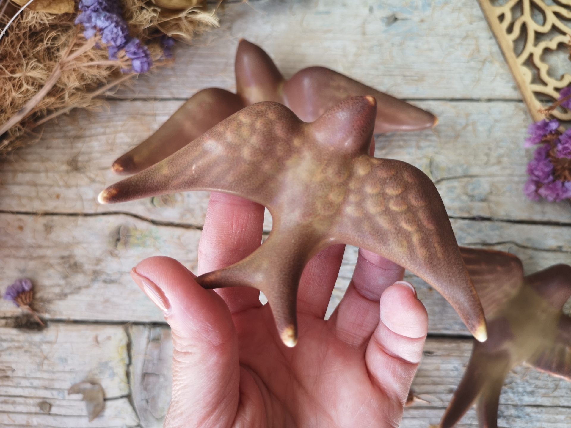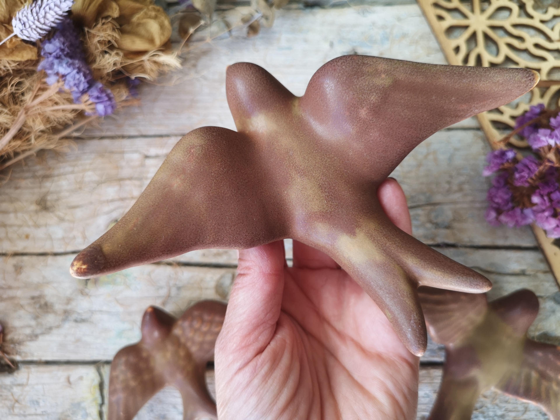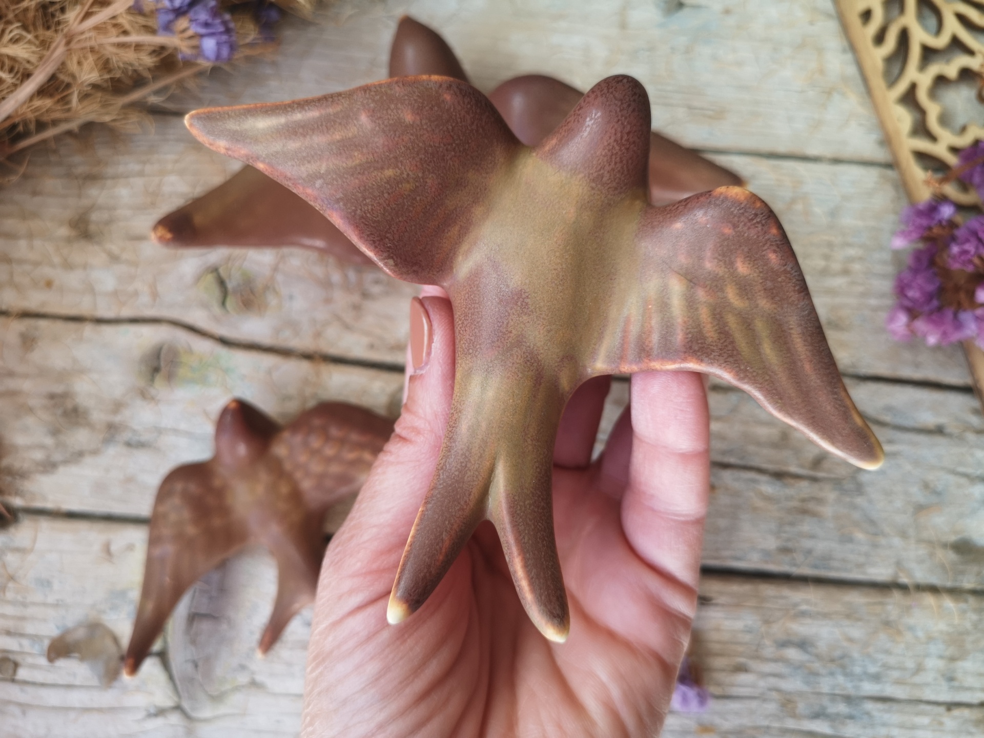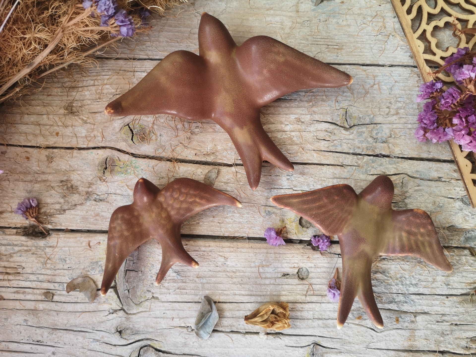 Conjunto de 3 andorinhas em cerâmica, sem brilho , cor couro.