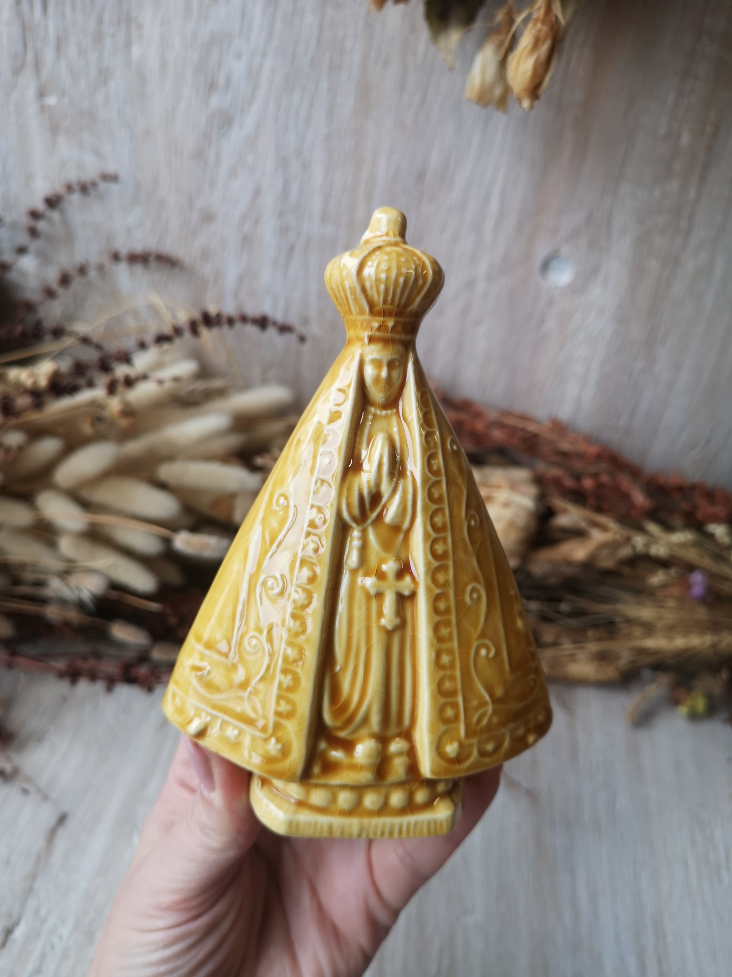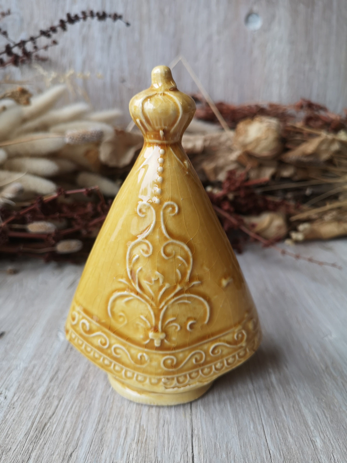 Estatueta cerâmica amarela de figura religiosa com coroa e vestido detalhado em relevo