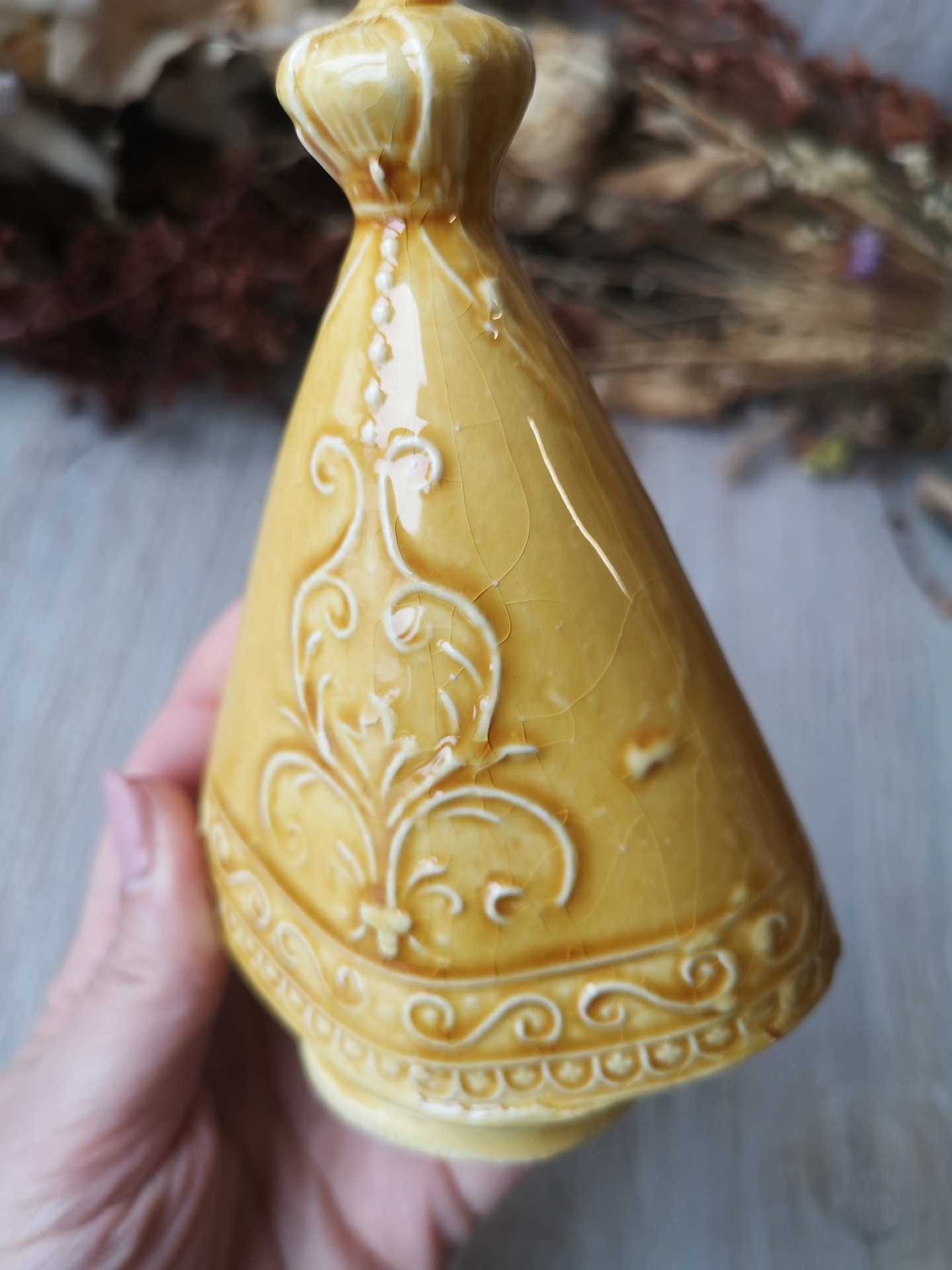 Objeto de cerâmica amarelo com relevo floral e geométrico em forma de cone