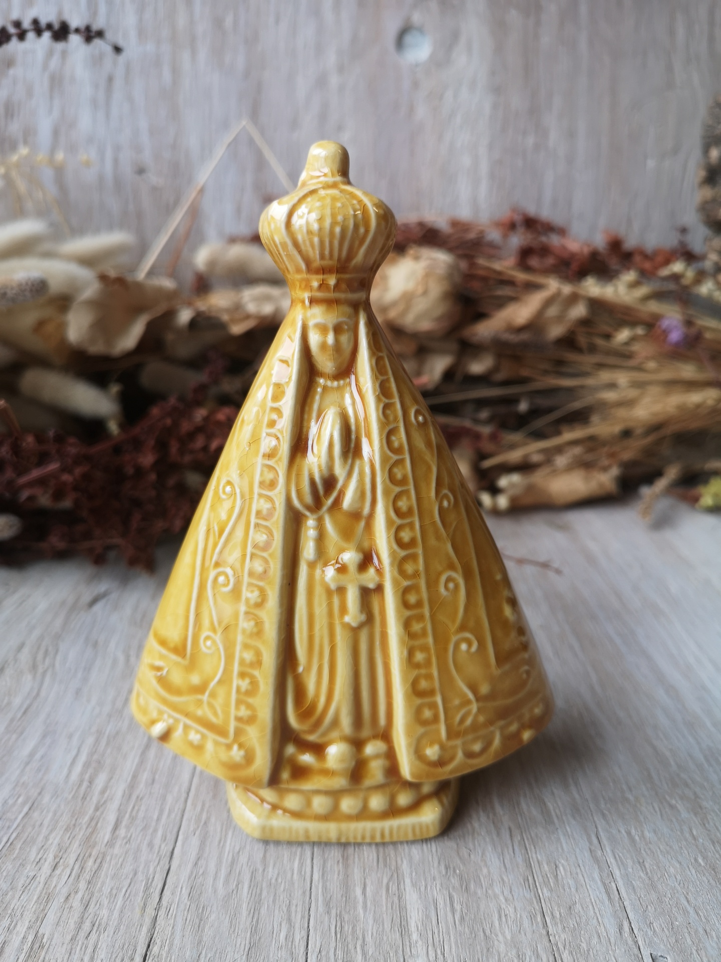 Nossa Senhora da Aparecida, em cerâmica , cor amarelo mel. Este vidrado amarelo é um vidrado craquelê (estala).
