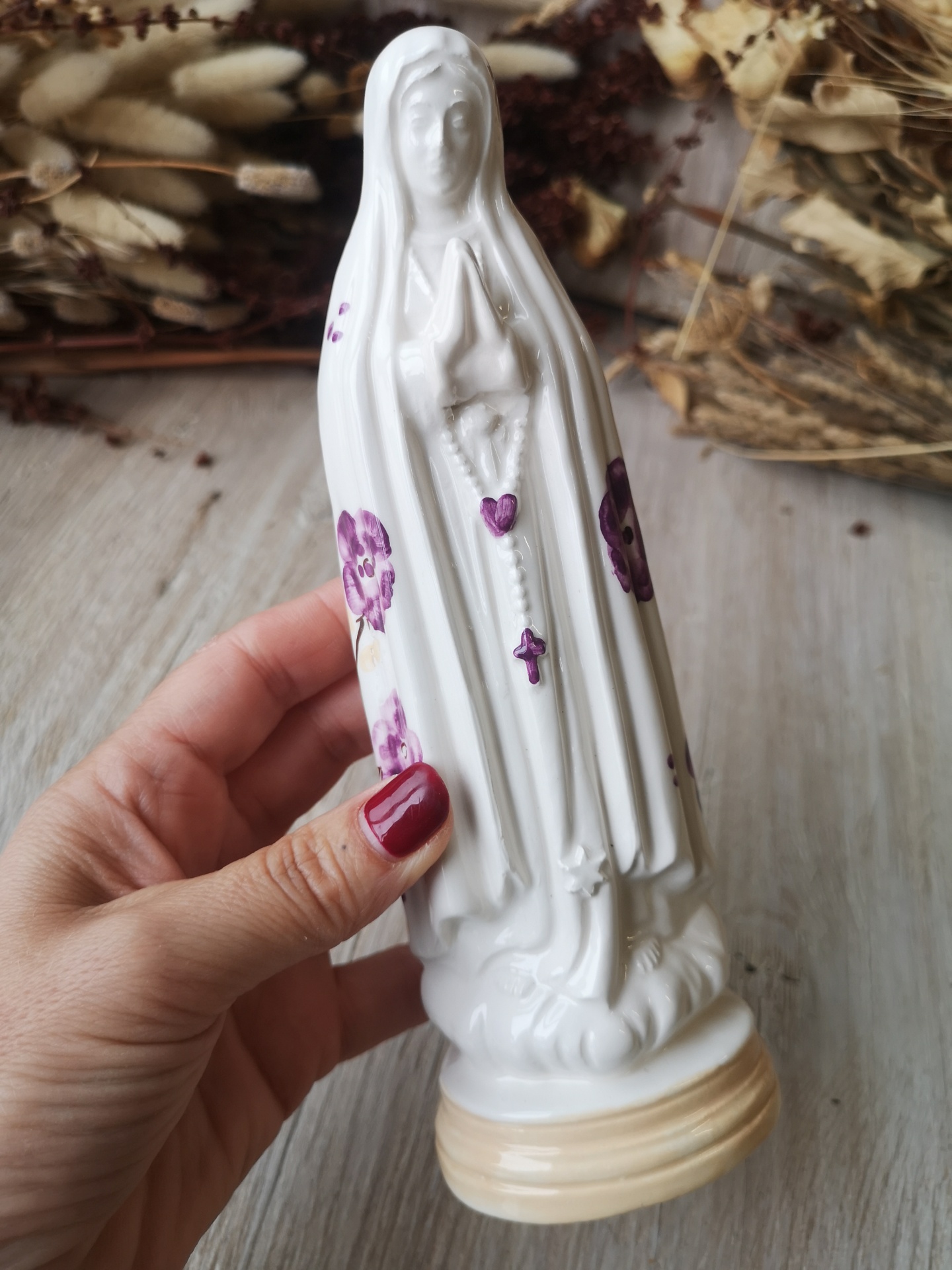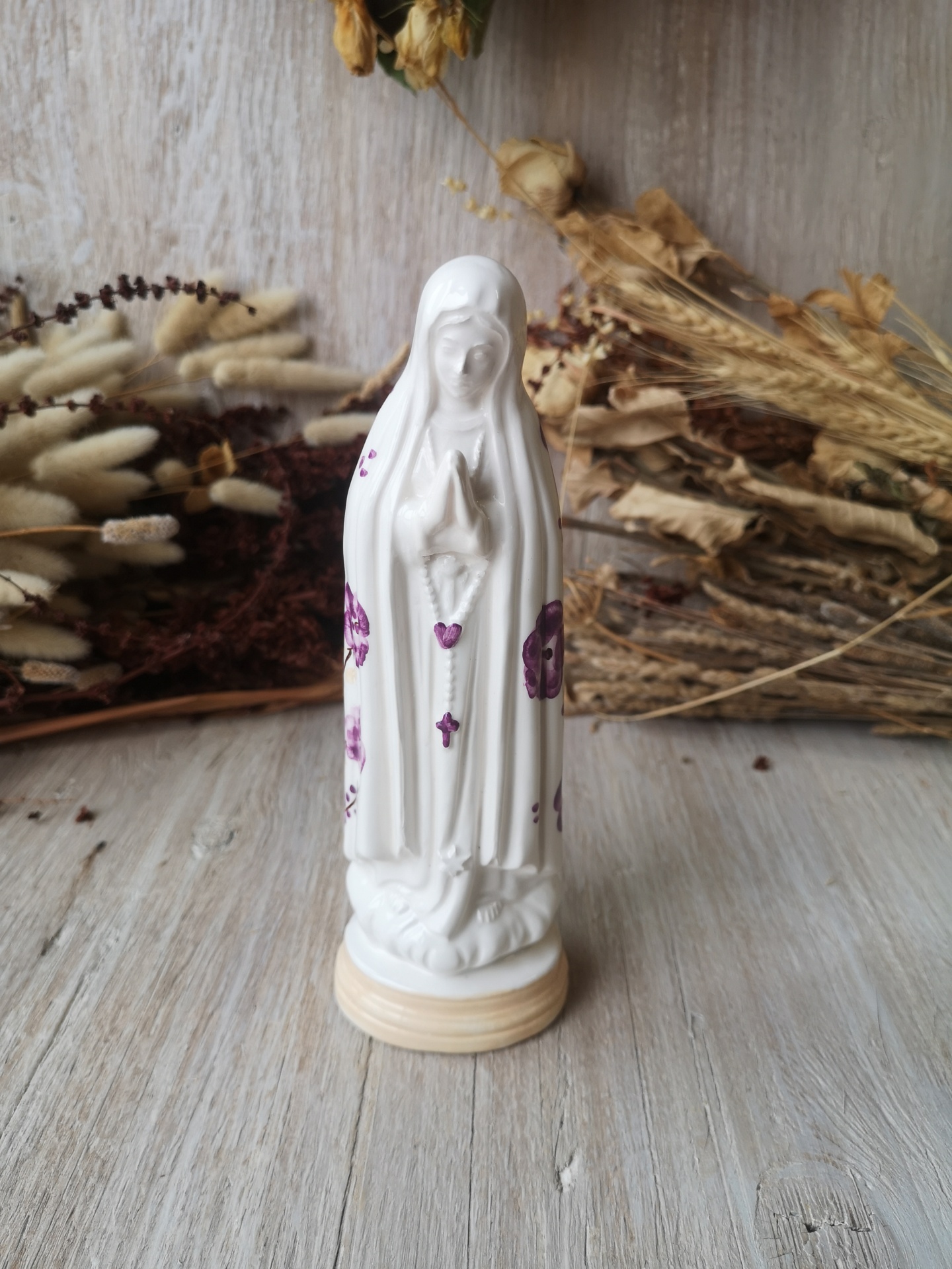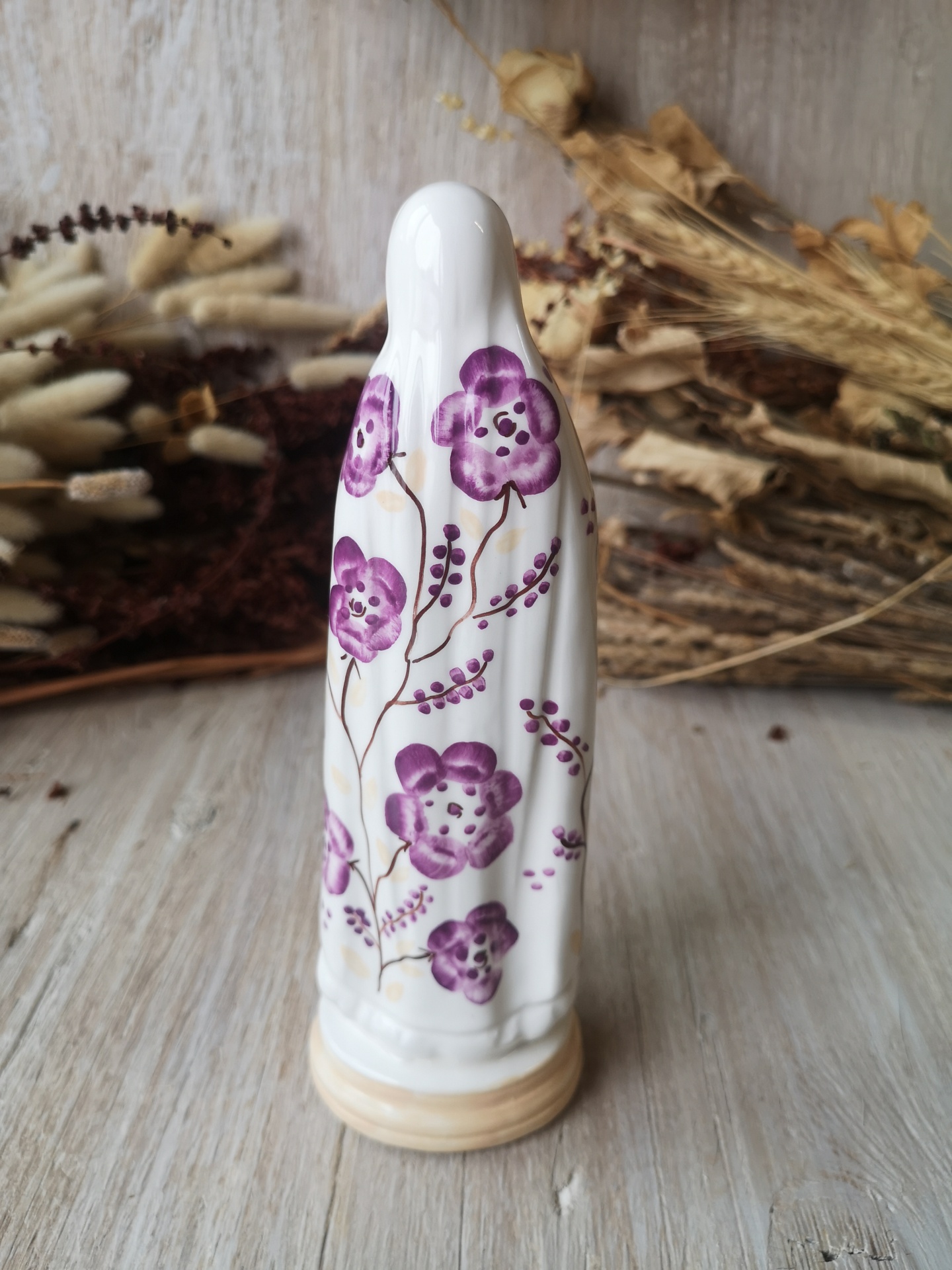 Nossa Senhora em cerâmica com padrão floral tradicional em bege e roxo, pintado à mão.