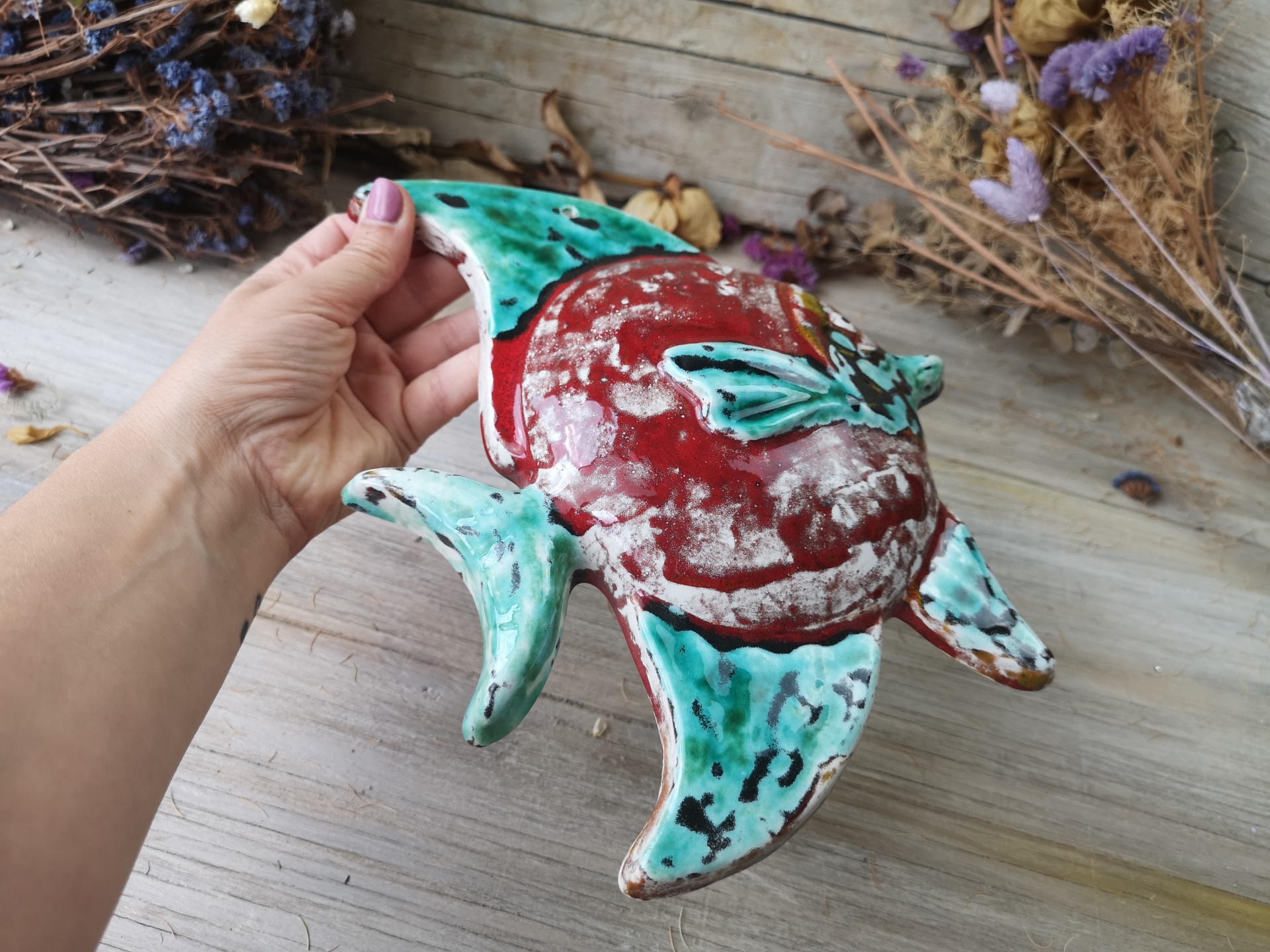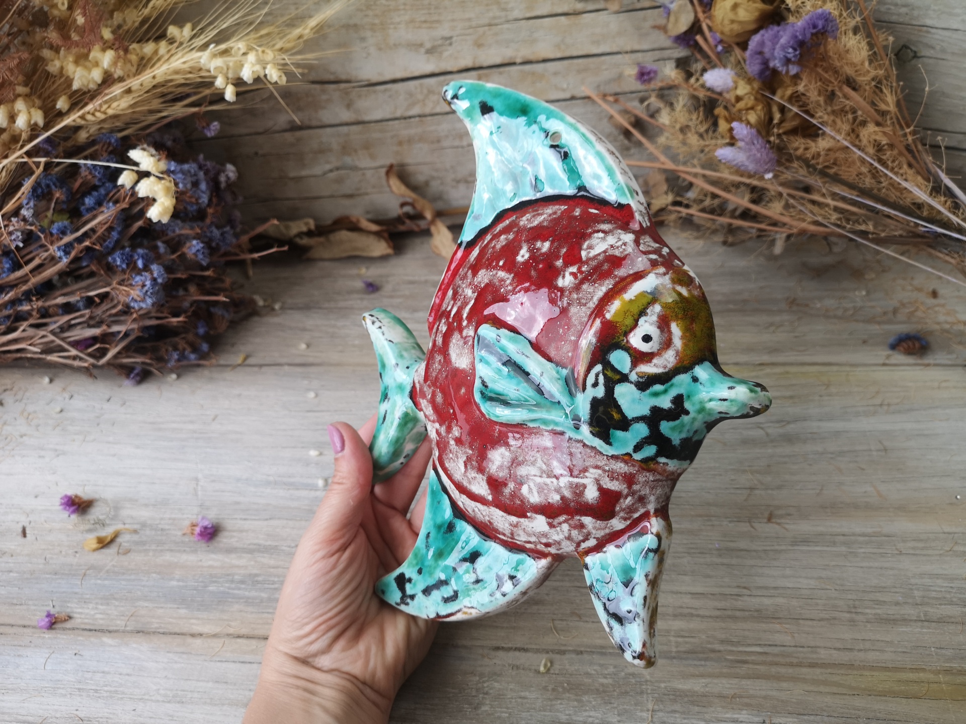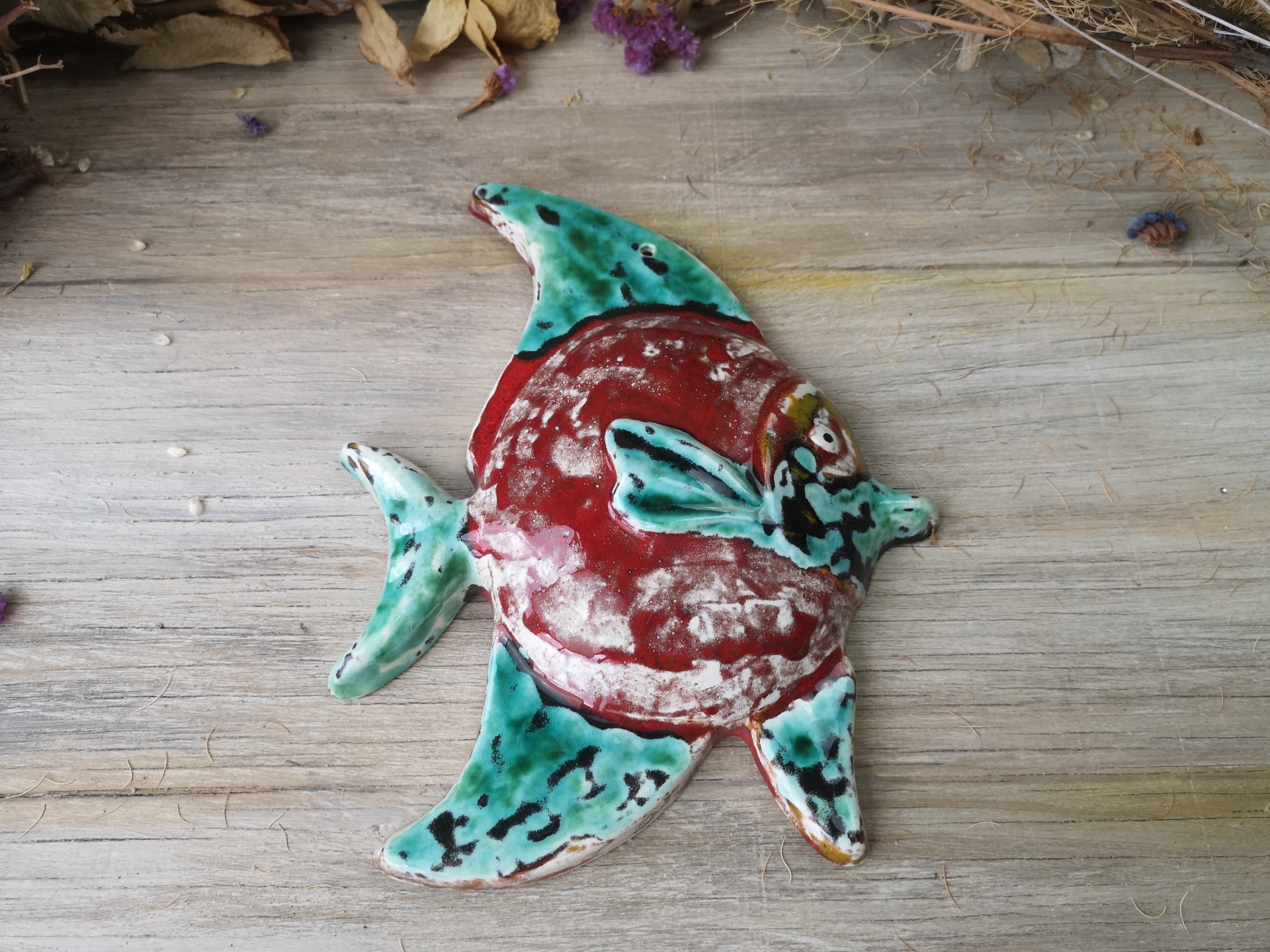 Peixe decorativo em cerâmica pintada à mão em tons vermelhos e verdes sobre madeira clara