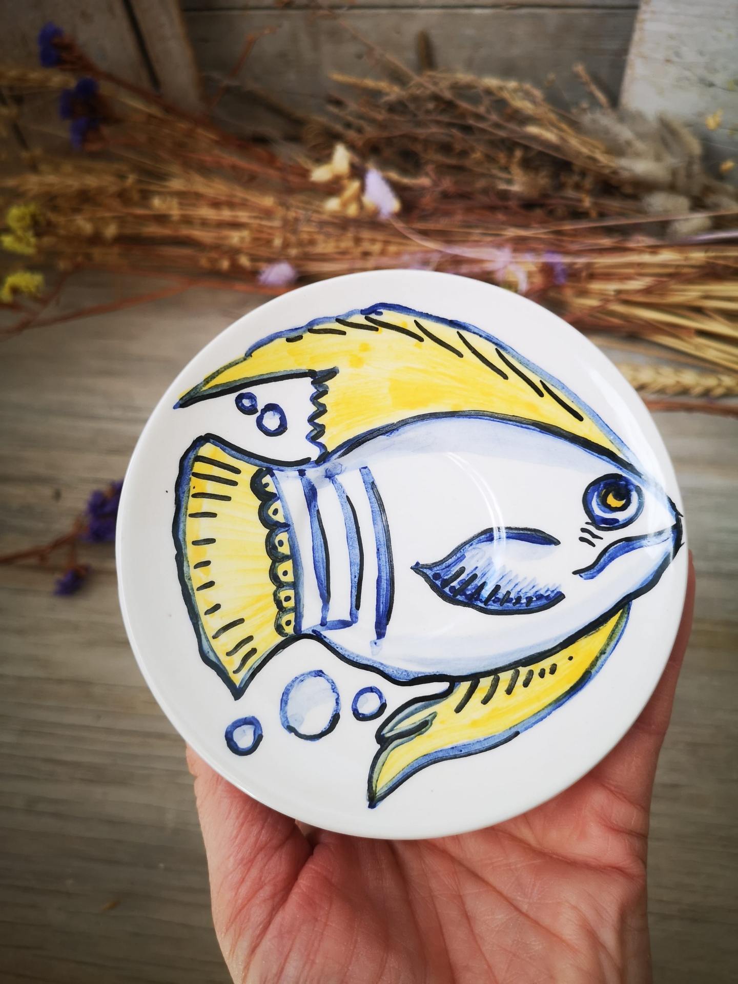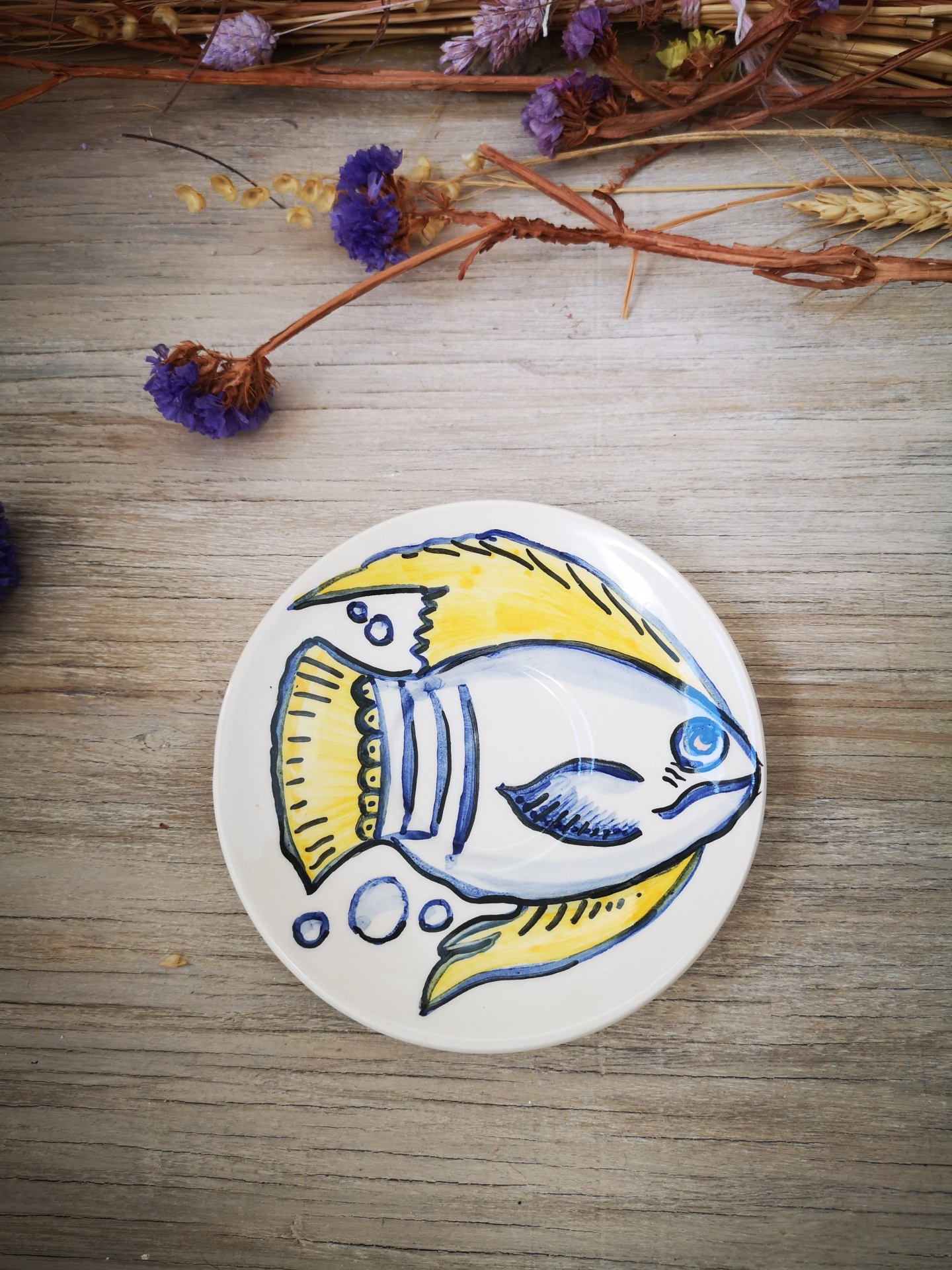 Prato decorativo em cerâmica pintado à mão.
