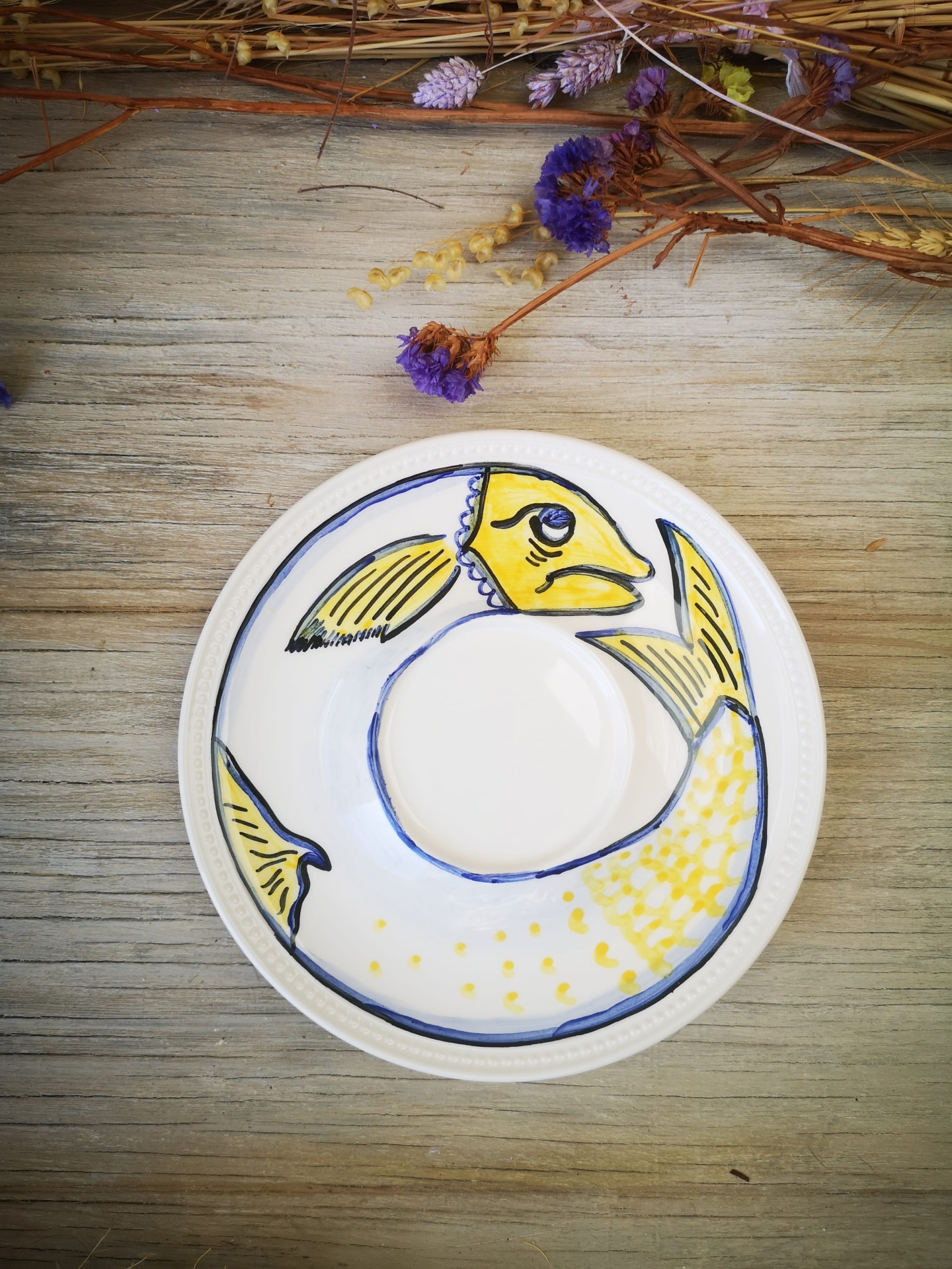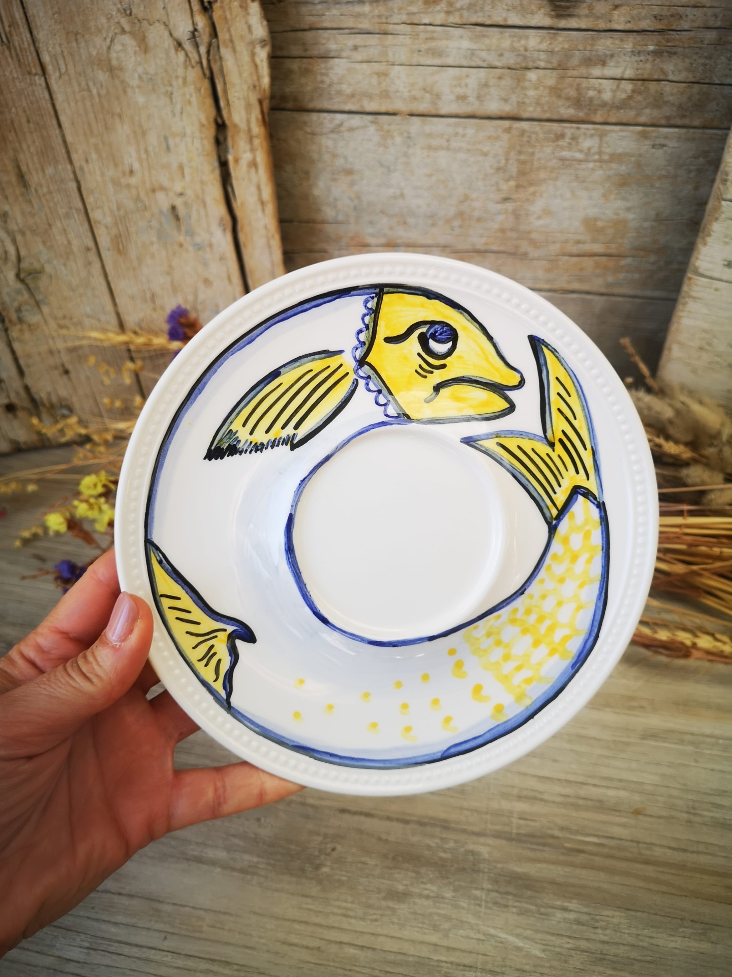 Prato decorativo em cerâmica pintado à mão.