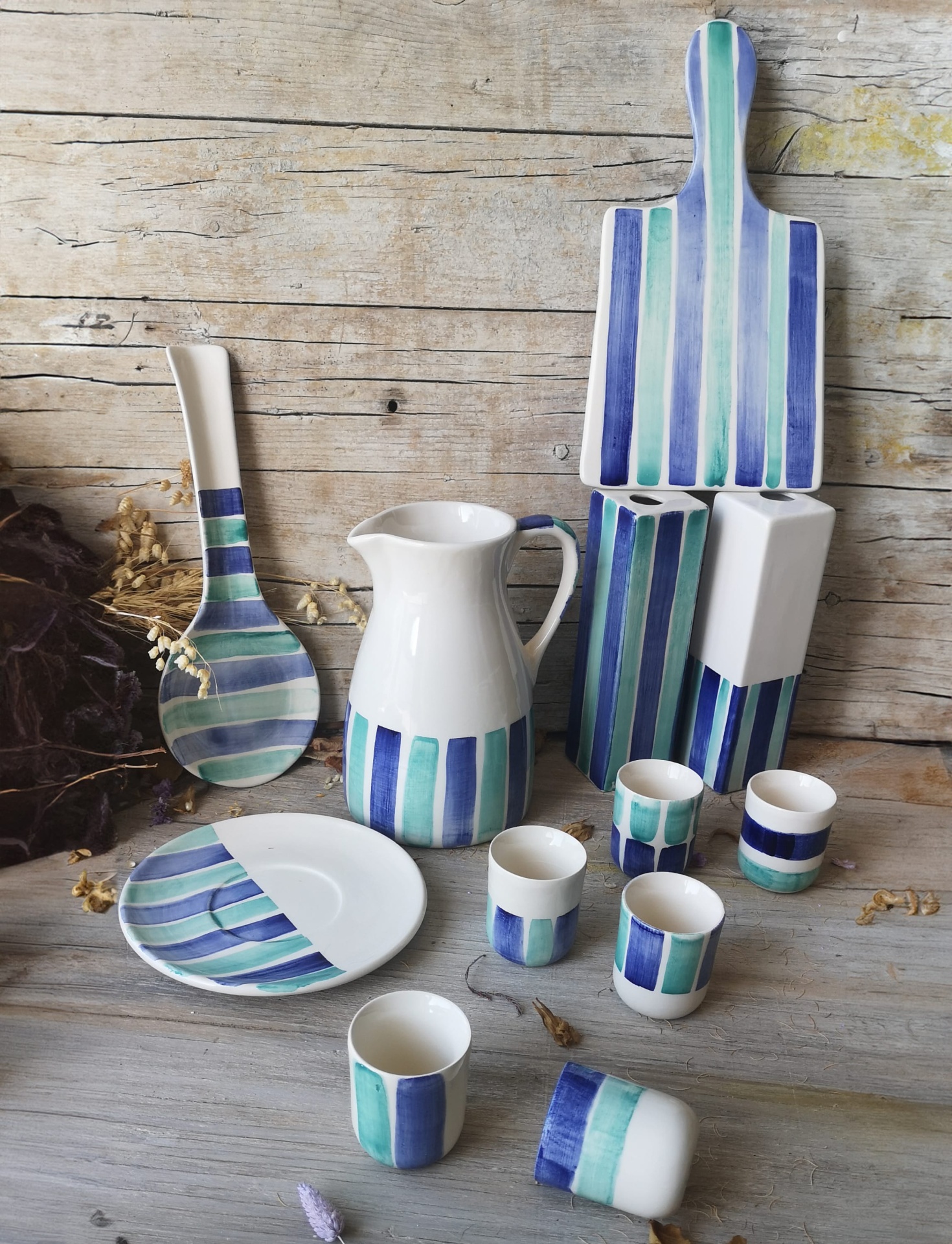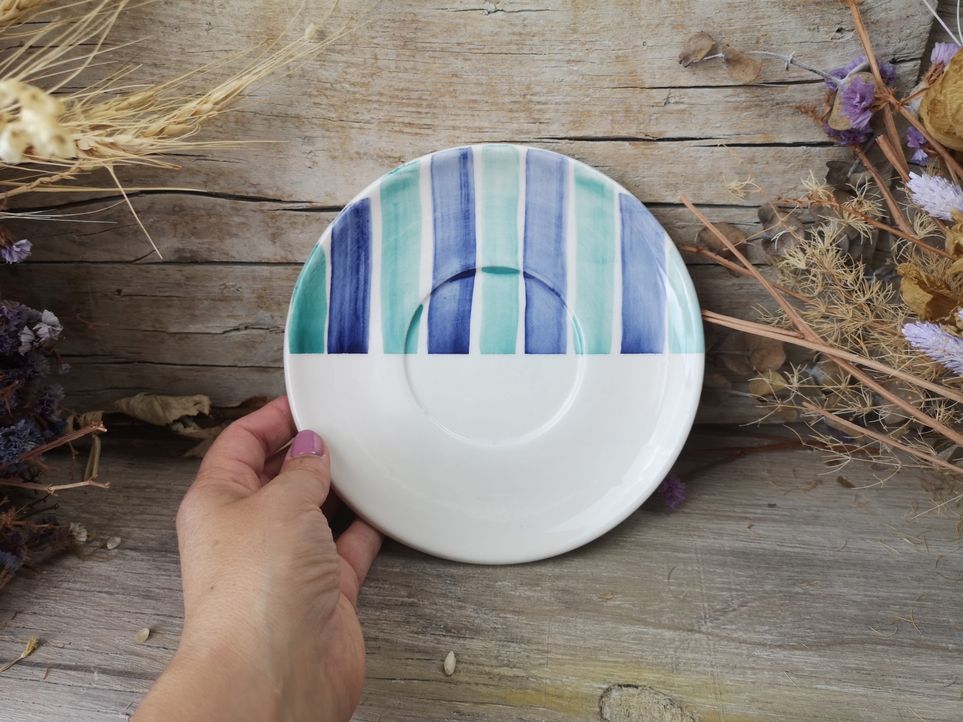 Prato em cerâmica pintado à mão , padrão de riscas em azul cobalto e verde água.