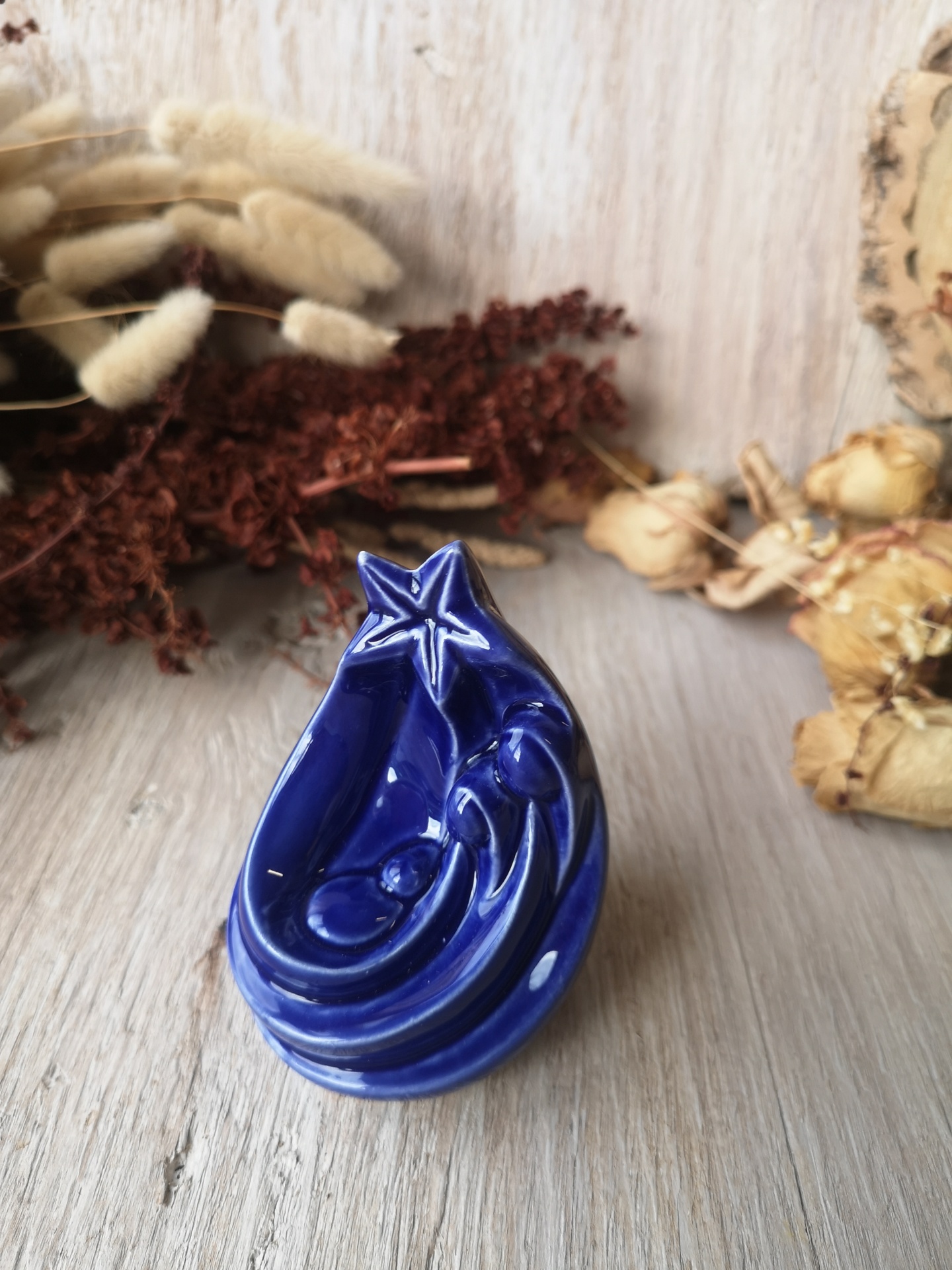 Escultura decorativa em cerâmica azul brilhante sobre madeira clara com flores secas ao fundo