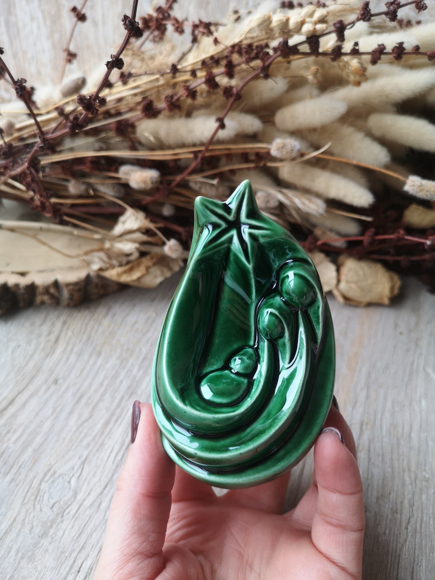 Escultura cerâmica verde de presépio com estrela, segurada por mão, ramos secos ao fundo